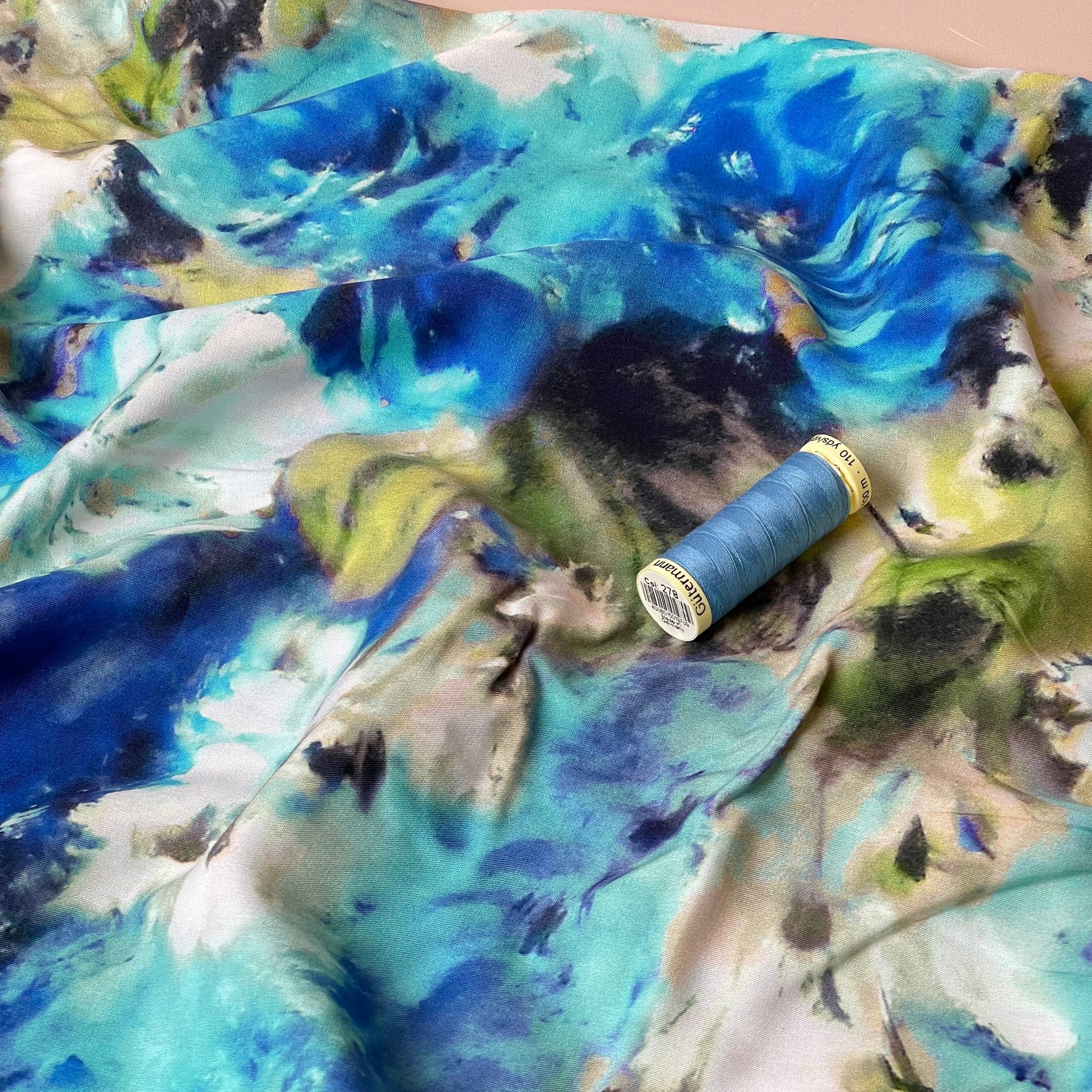 This stunning viscose poplin fabric features a painterly floral design in turquoise, green and white. It is perfect for sewing blouses, swooshy dresses and loose trousers that can be worn all year round.