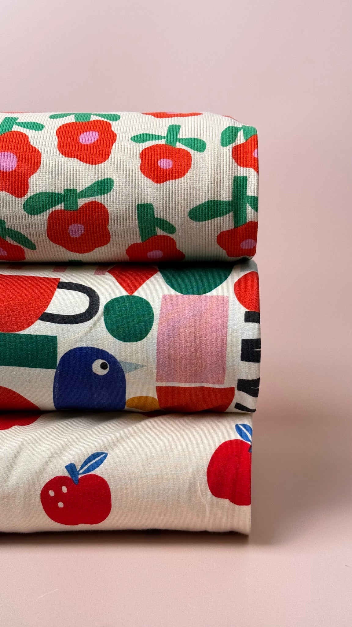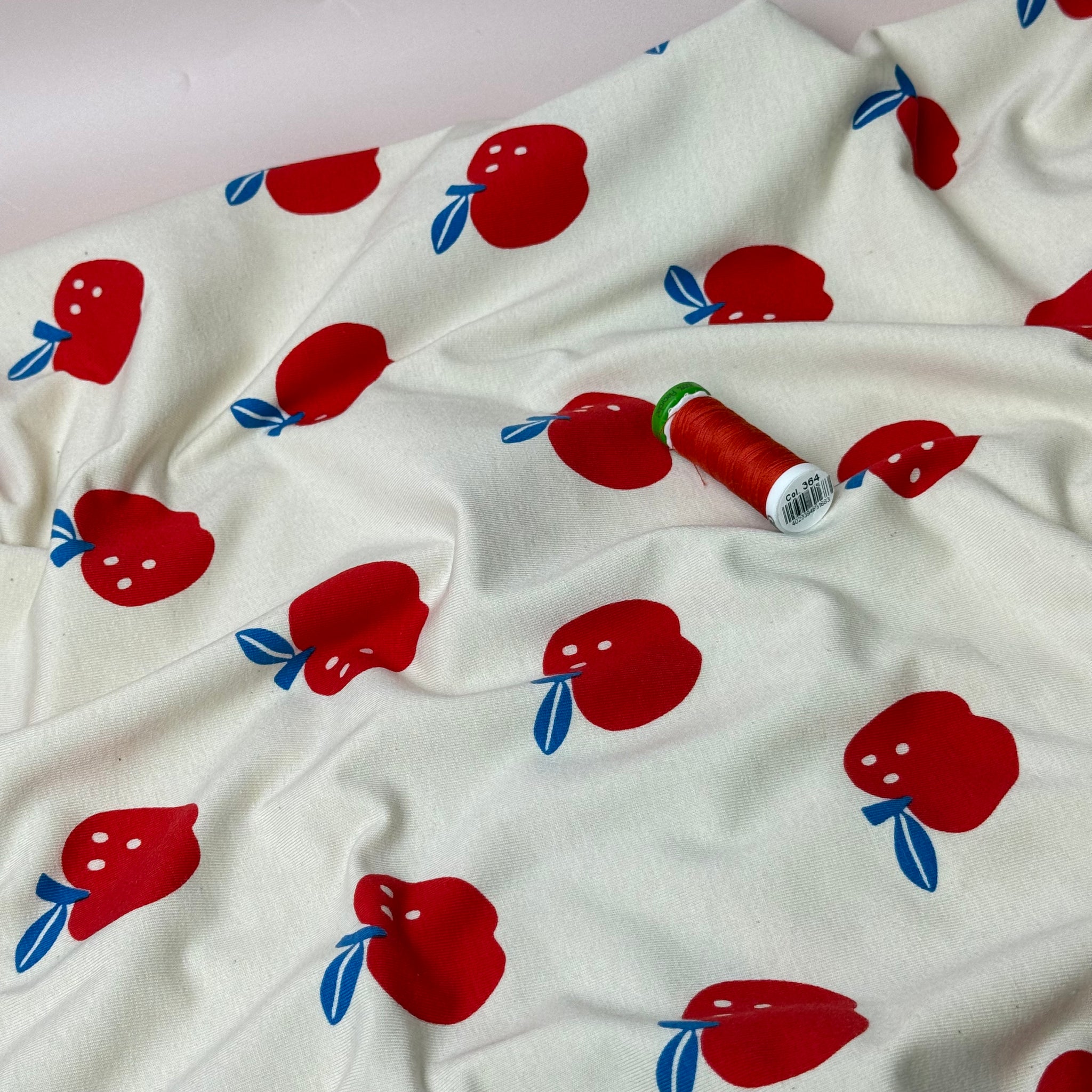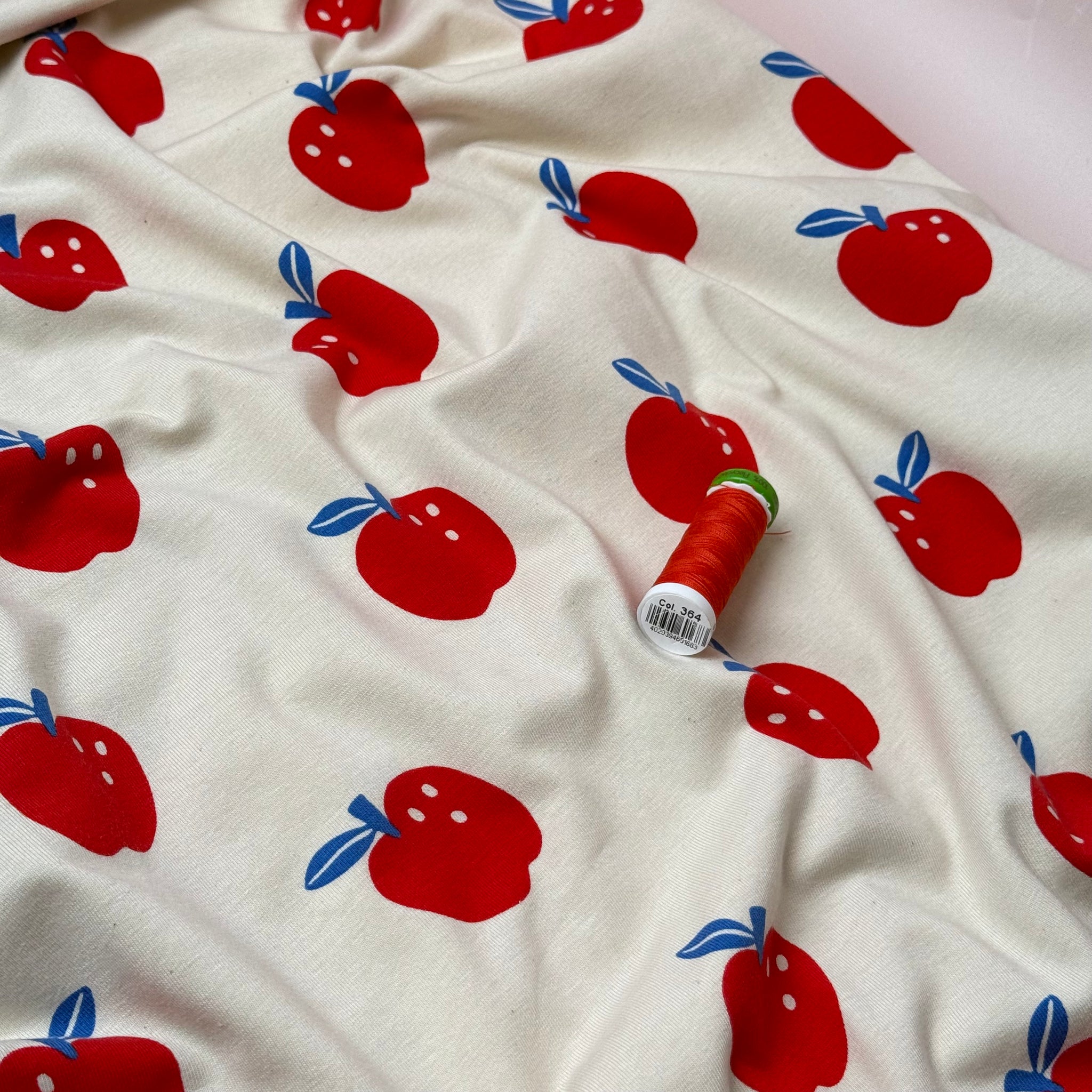 This softest cosy Organic Cotton Jersey features cute apples in red and blue on a natural undyed background. This fabric is cosy and comfortable and will bring you a lot of joy when sewing and wearing.
