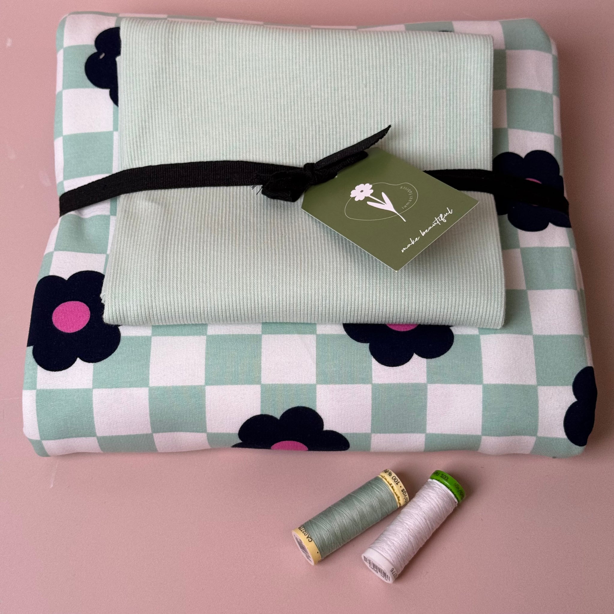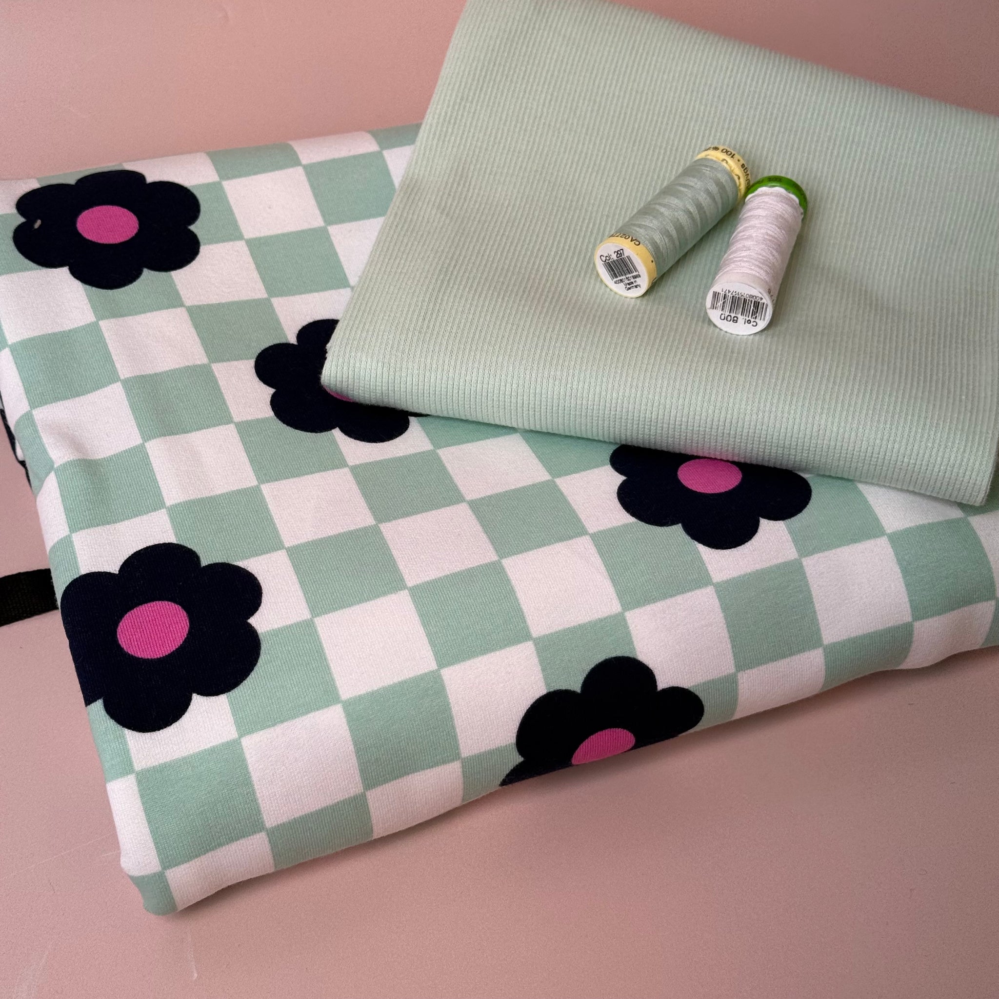 This is the softest, brushed sweat-shirting fabric in our range with brushed fleecy back and peachy, matte touch. It features fun black graphic flowers on a gingham background of mint and white shades. It is ideal for making cosy and comfortable sweaters, hoodies, sweater-dresses, joggers, cardigans and trousers.