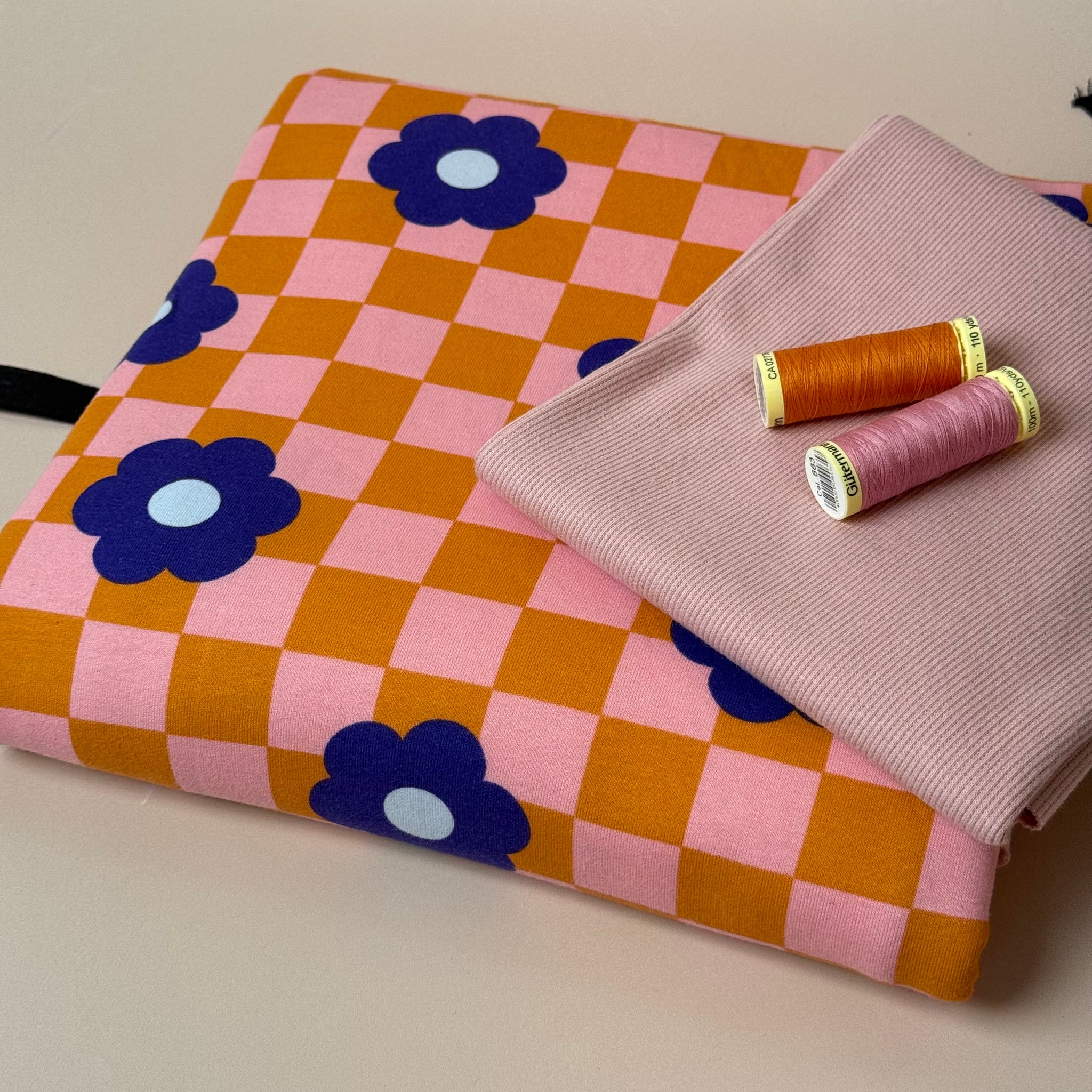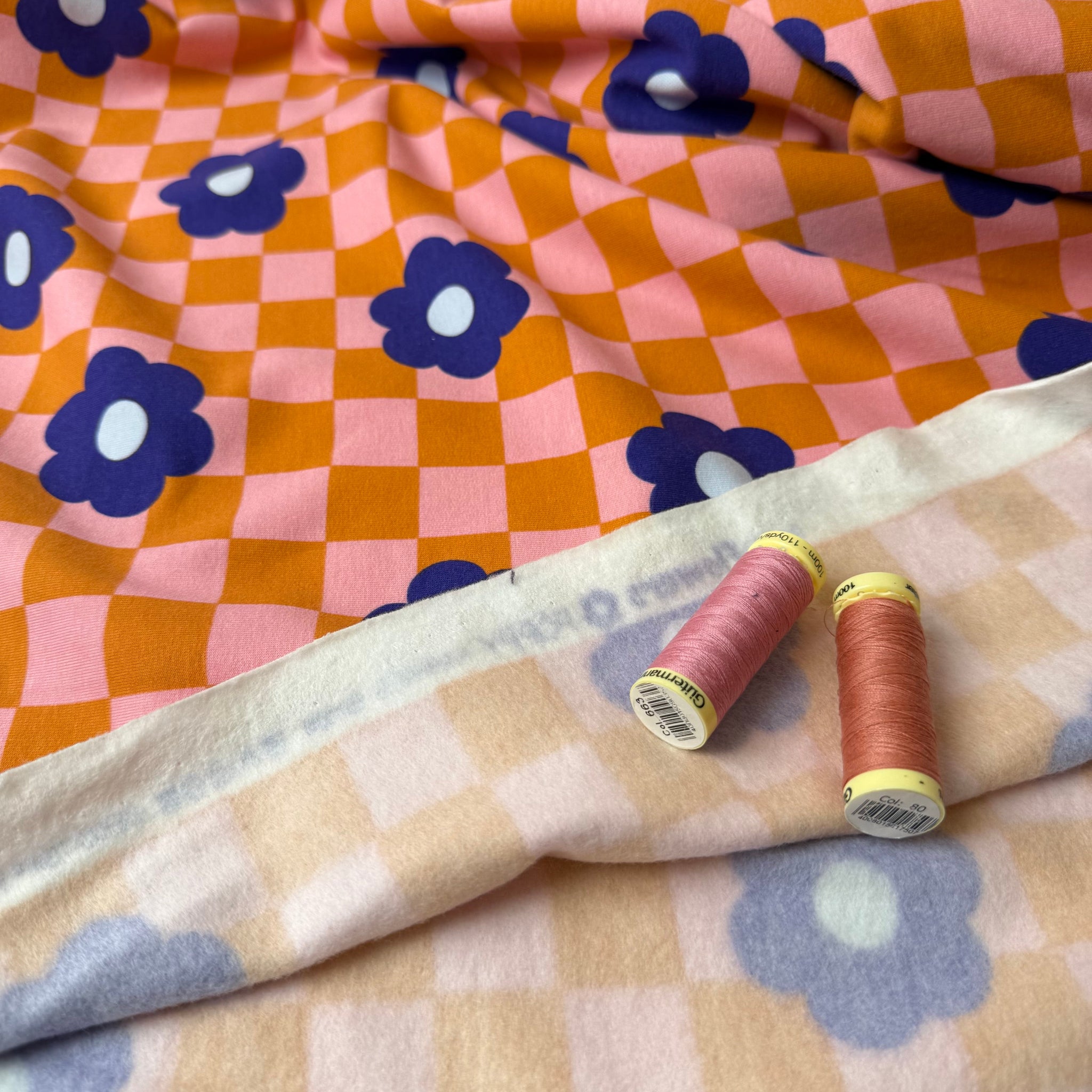 This is the softest, brushed sweat-shirting fabric in our range with brushed fleecy back and peachy, matte touch. It features simple navy graphic flowers on a pink and orange gingham background. It is ideal for making cosy and comfortable sweaters, hoodies, sweater-dresses, joggers, cardigans and trousers. You will not want to take the garments off made from this fabric.