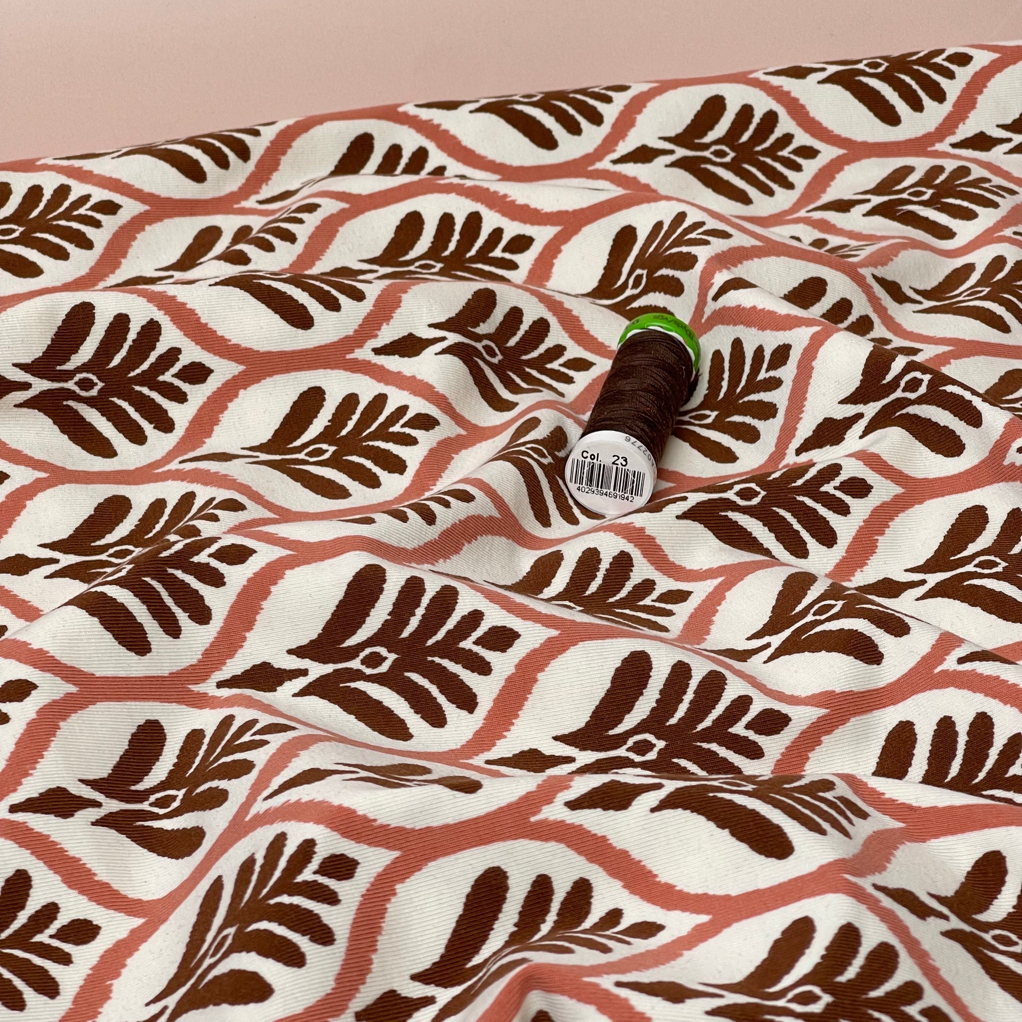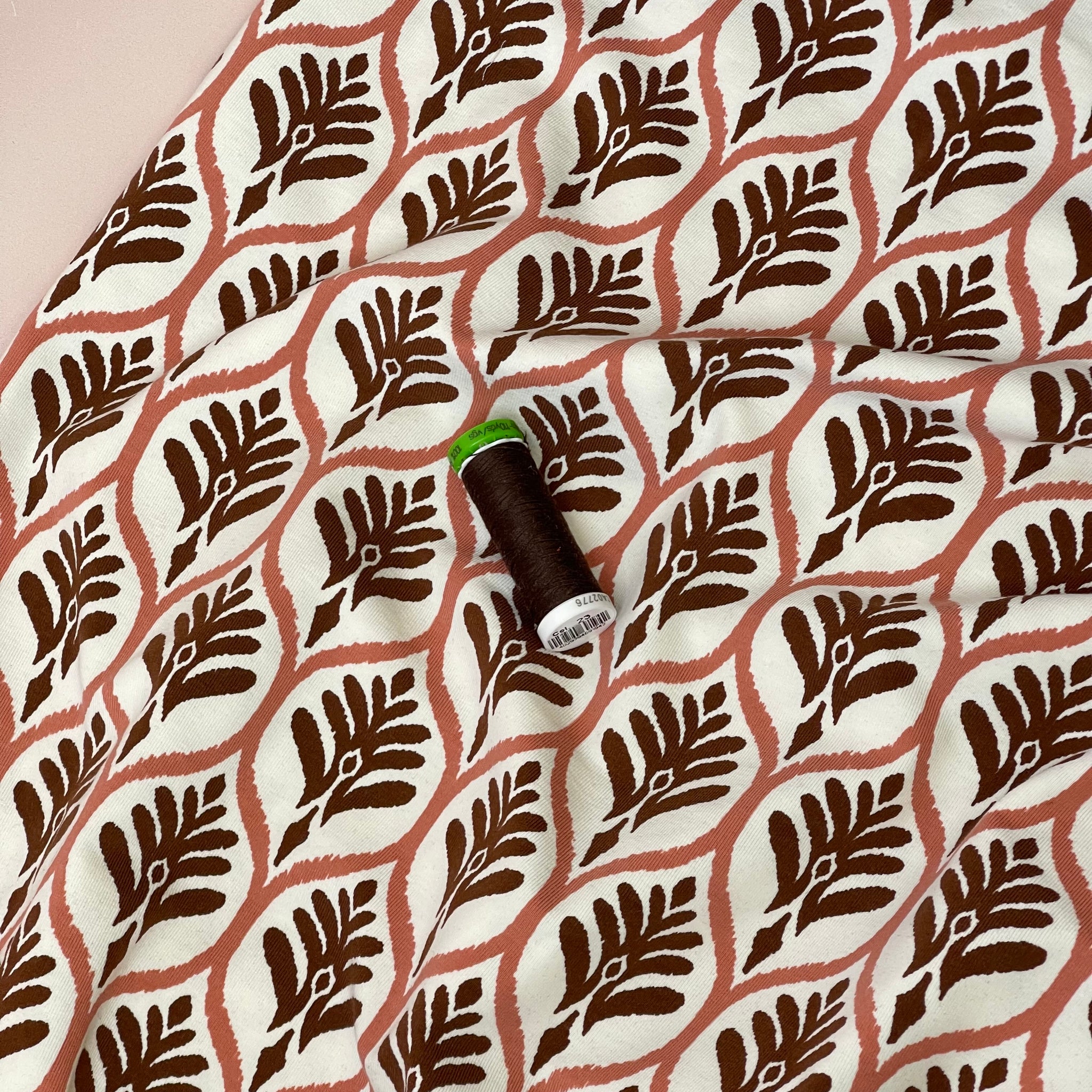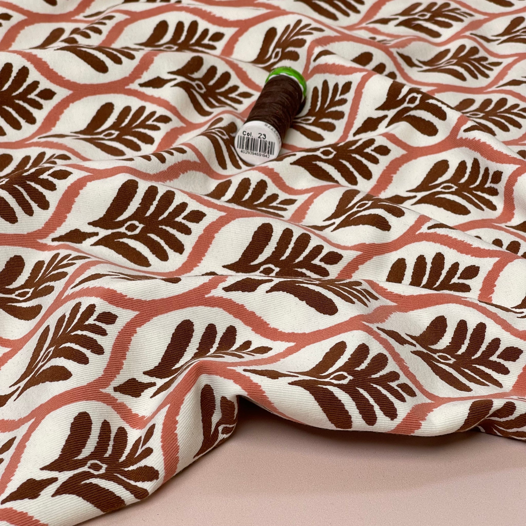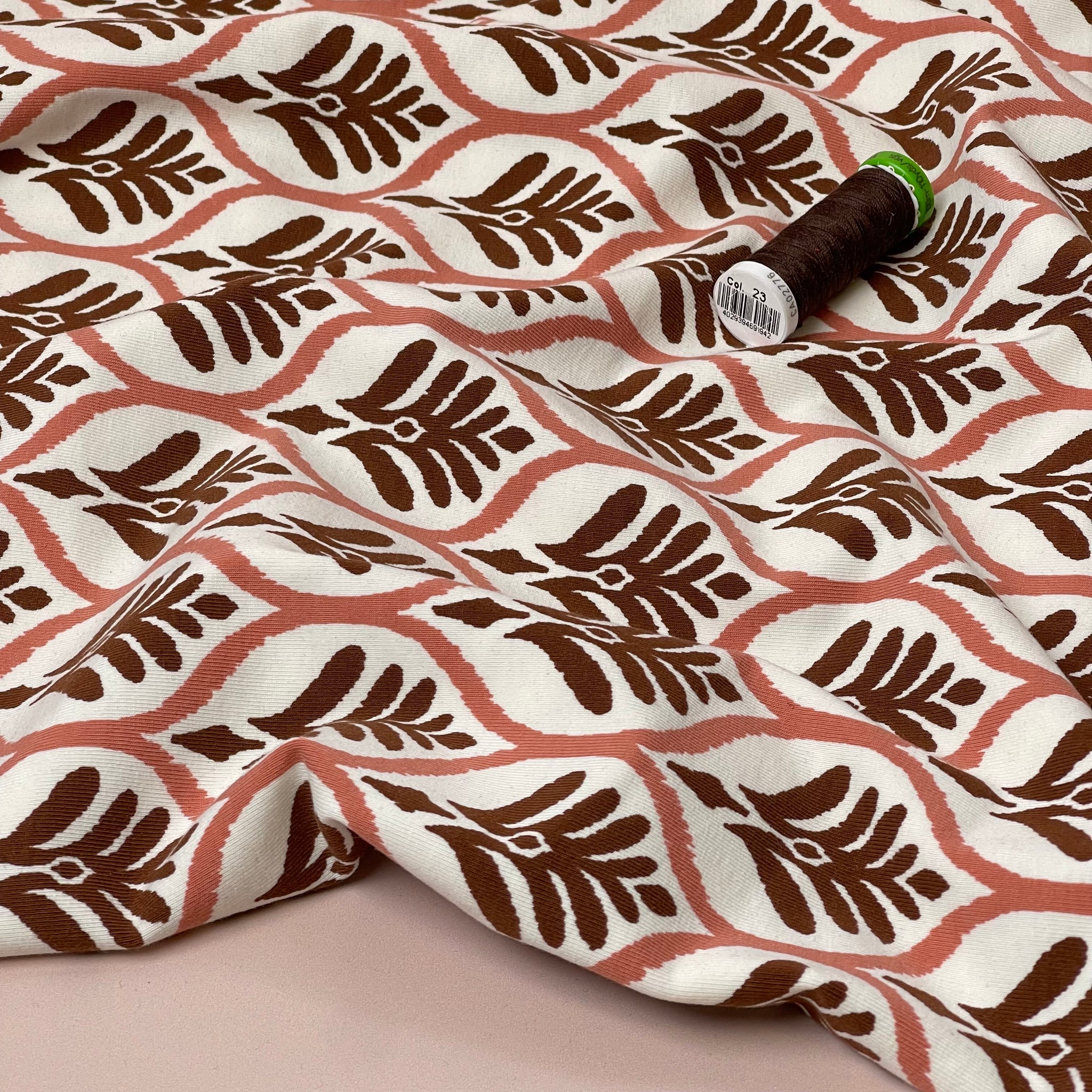 A stunning soft and high quality cotton single knit jersey, this fabric features authentic leaf stamp print in Dusty rose and brown on an off-white background. It is cosy and comfortable and will bring you a lot of joy when sewing and wearing.