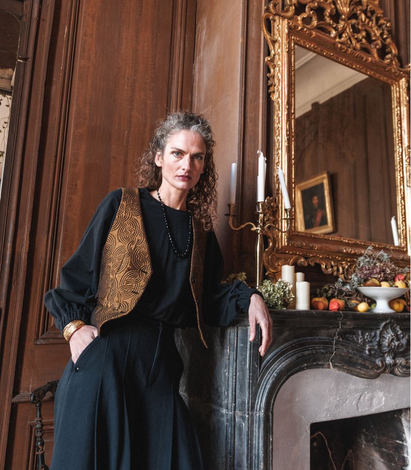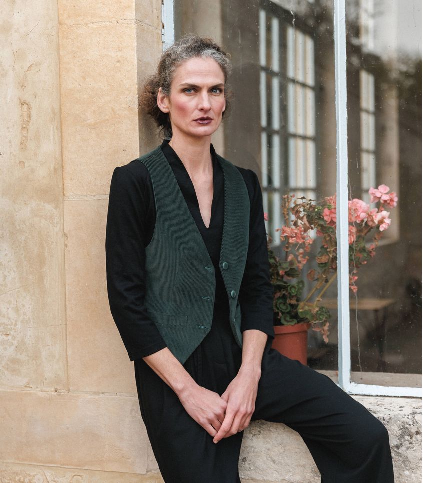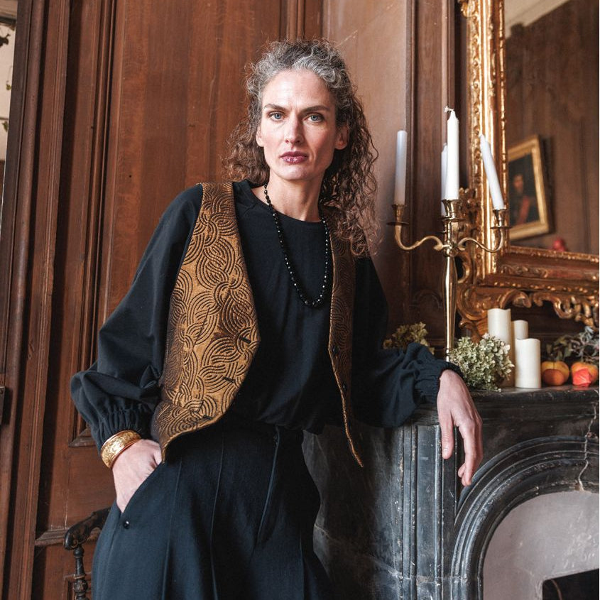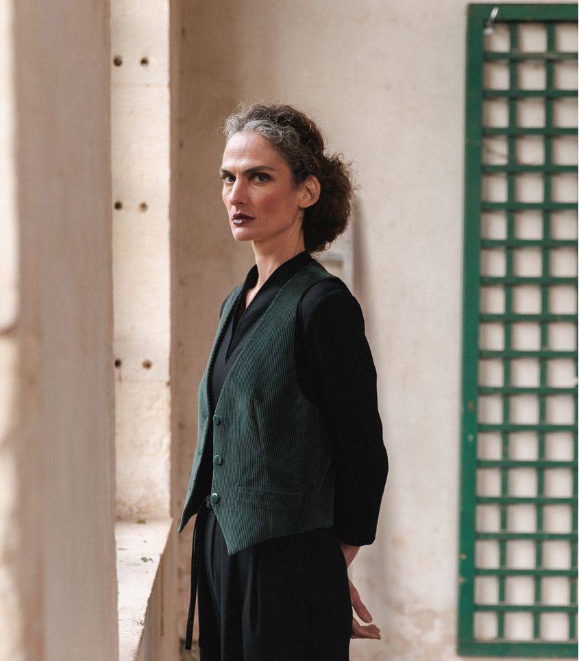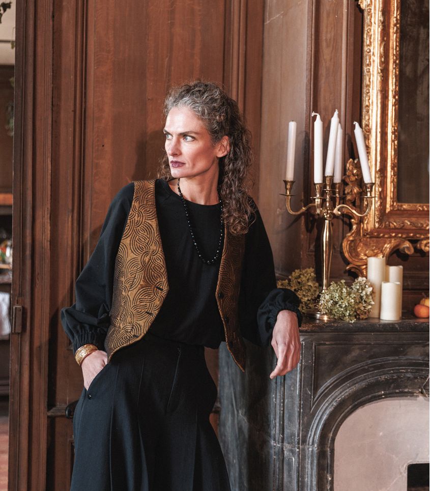 Mouchette reinvents the tailored vest in a short, feminine version . Inspired by menswear, this piece can be worn over a light blouse or a flowing dress , or with pleated trousers for a distinctly boyish look.