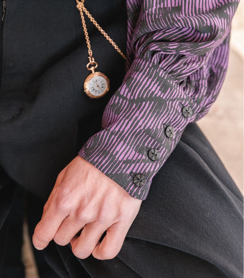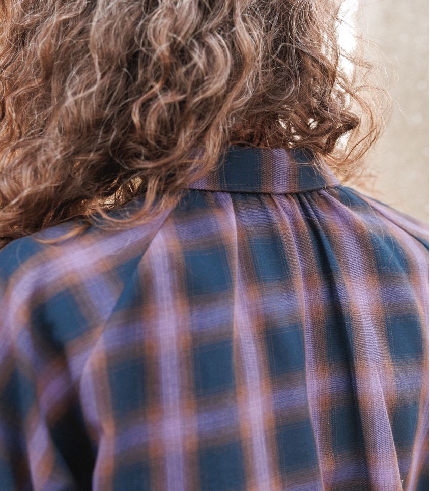 VIOLETTE is a blouse or dress with refined charm, recognizable by its raglan sleeves and delicate gathers that highlight the neckline, both front and back.