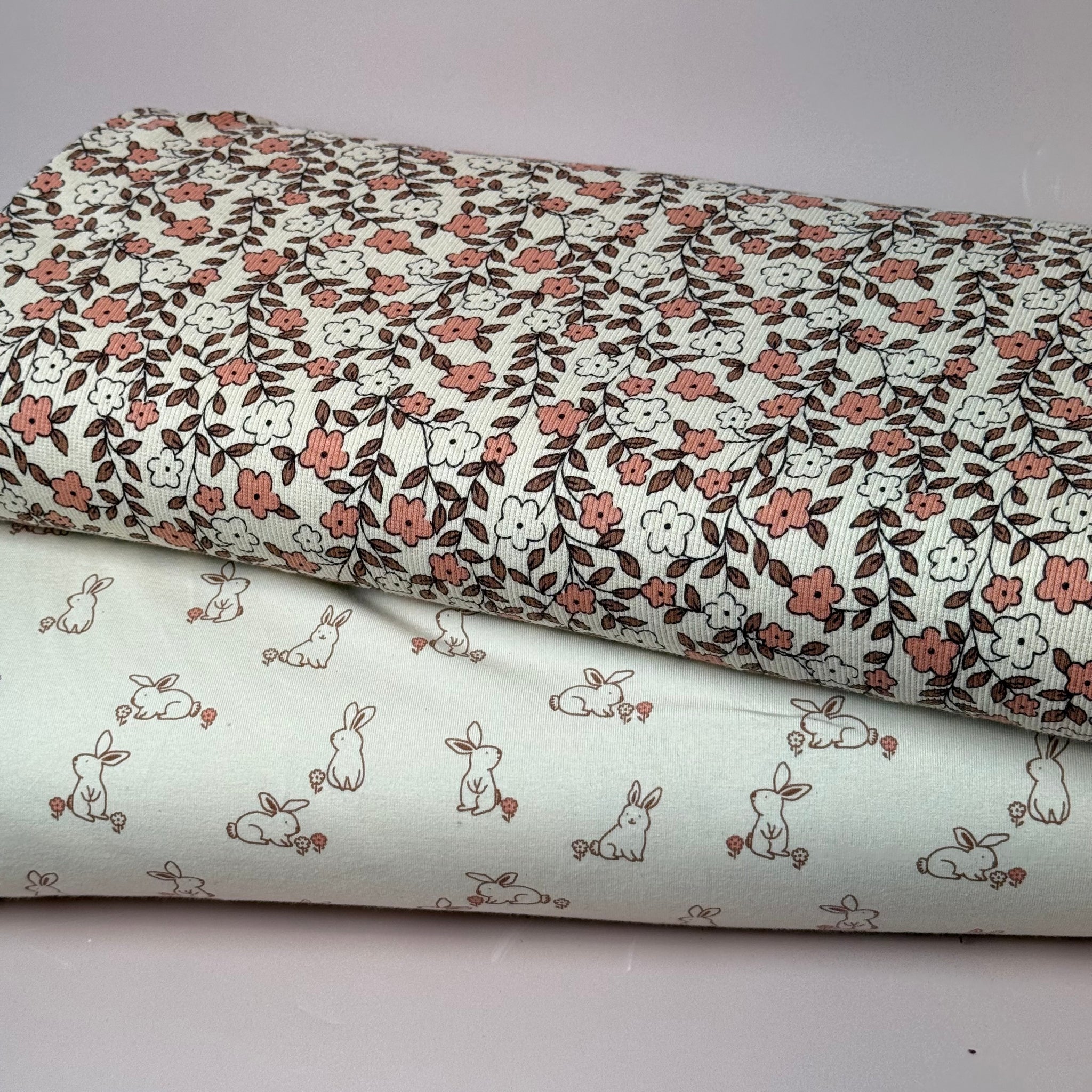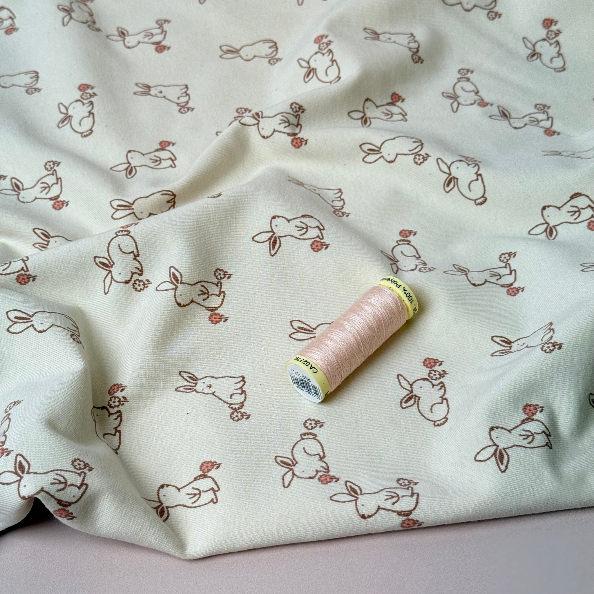 This softest cosy Organic Cotton Jersey features cute bunnies brown with pink flower accent on a natural background. This fabric is cosy and comfortable and will bring you a lot of joy when sewing and wearing.