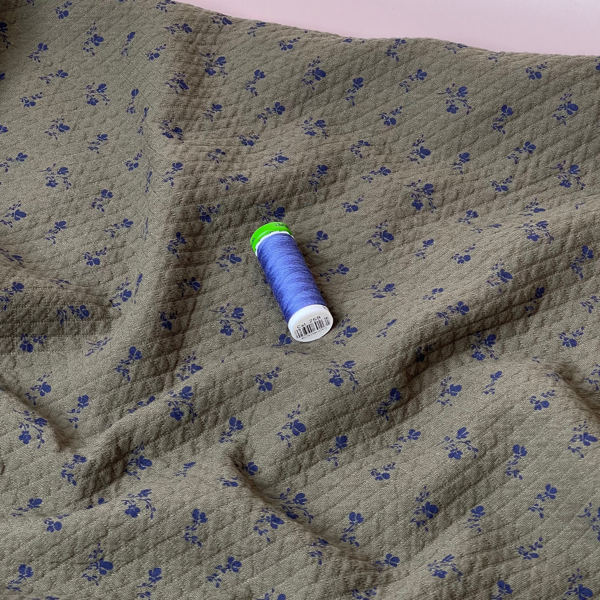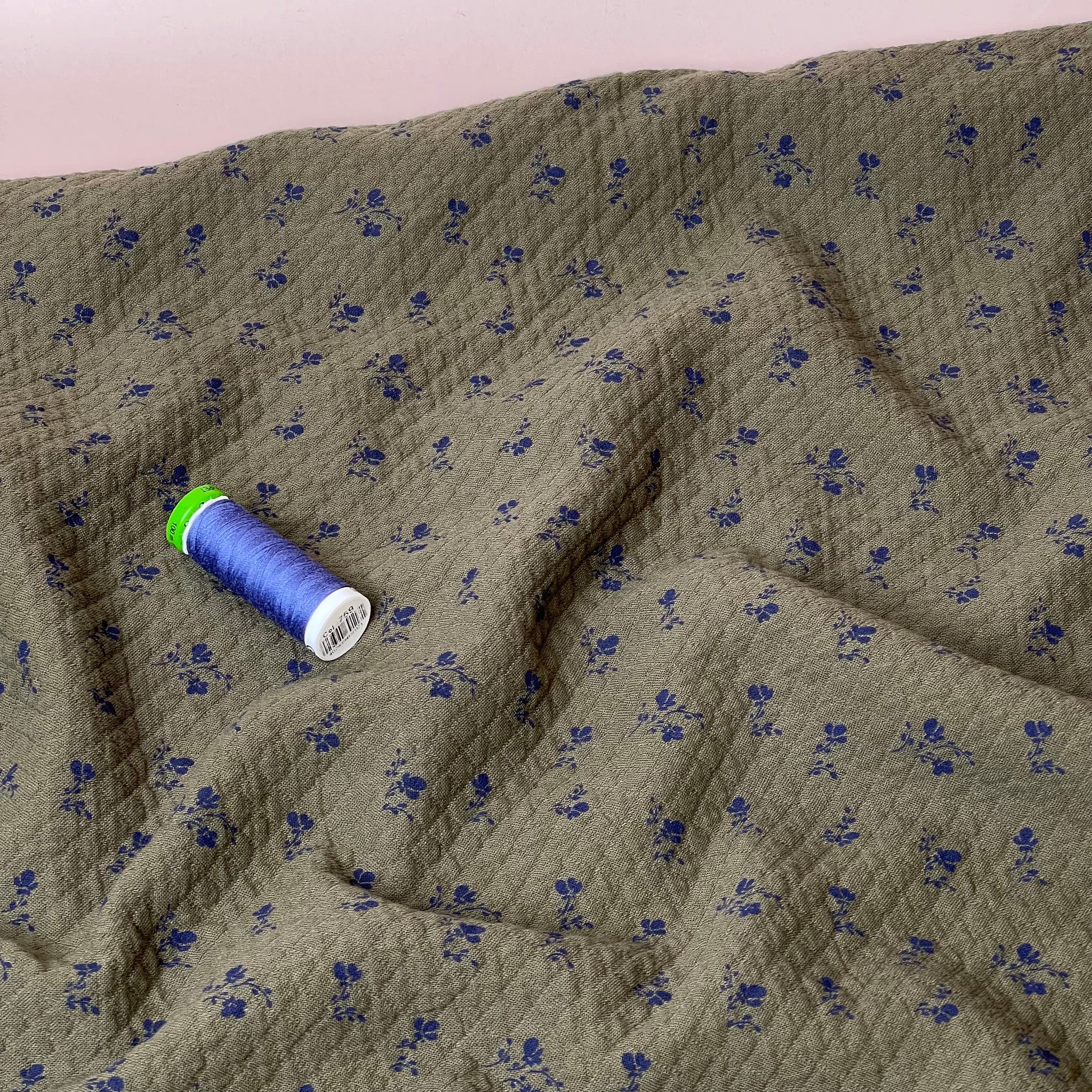 Unique and stunning pure cotton jacquard fabric with small diamond shapes woven into it. The special diamond jacquard weave gives this fabric a lovely structure, ideal for making summer jackets, tops, trousers, shorts and dresses. The fabric is yarn dyed in olive colour and features ditsy flowers in blue printed on it.