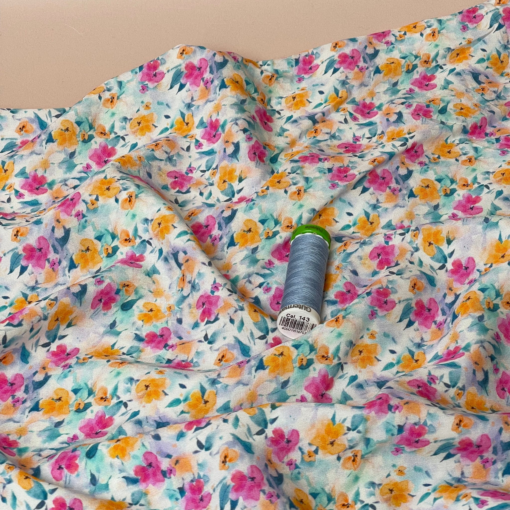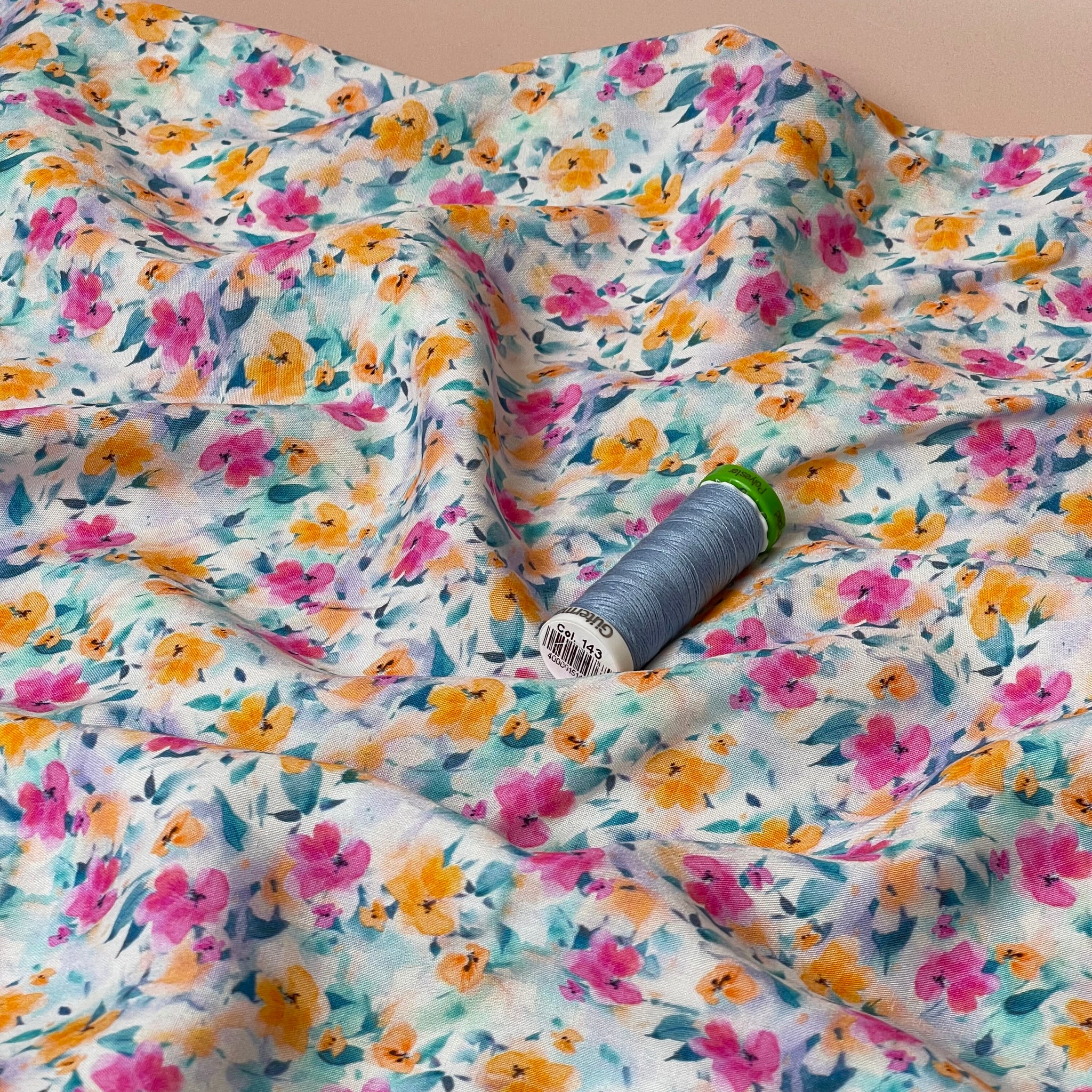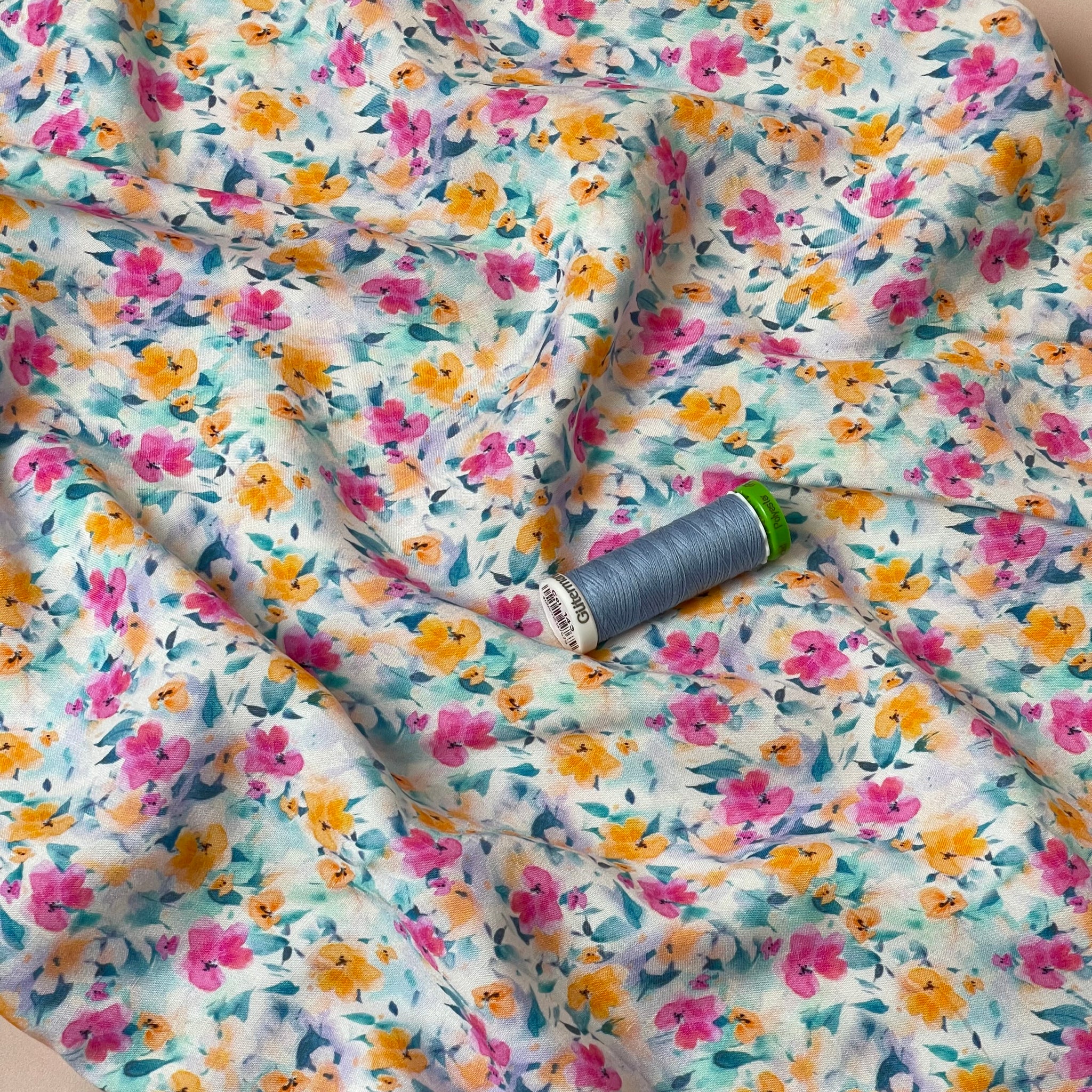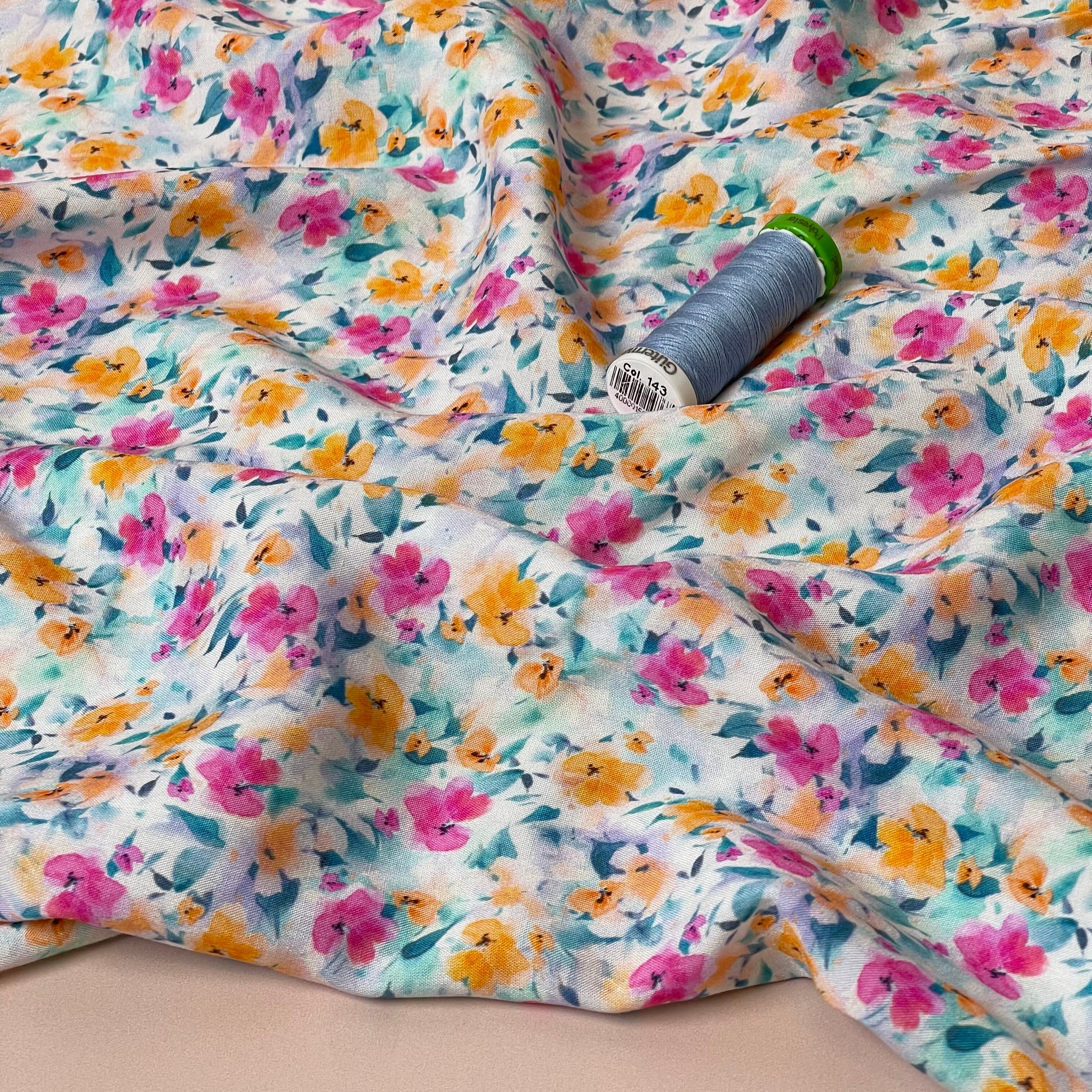 Elegant and beautiful, high quality viscose fabric featuring a ditsy floral design in pink, teal and yellow on an off-white background. It is lightweight and soft to touch with beautiful drape, perfect for summer dresses, blouses and skirts.