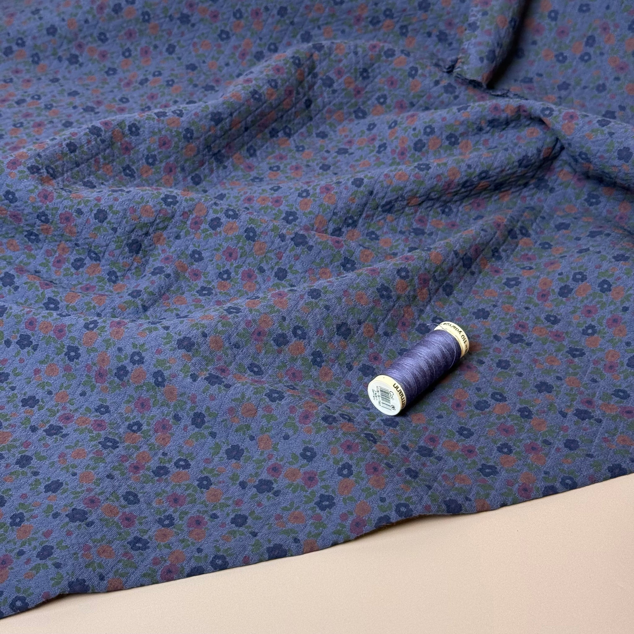 Unique and stunning pure cotton jacquard fabric with small diamond shapes woven into it. The special diamond jacquard weave gives this fabric a lovely structure, ideal for making summer jackets, tops, trousers, shorts and dresses. The fabric is yarn dyed in blue colour and features ditsy flowers in darker blue, red and green printed on it.