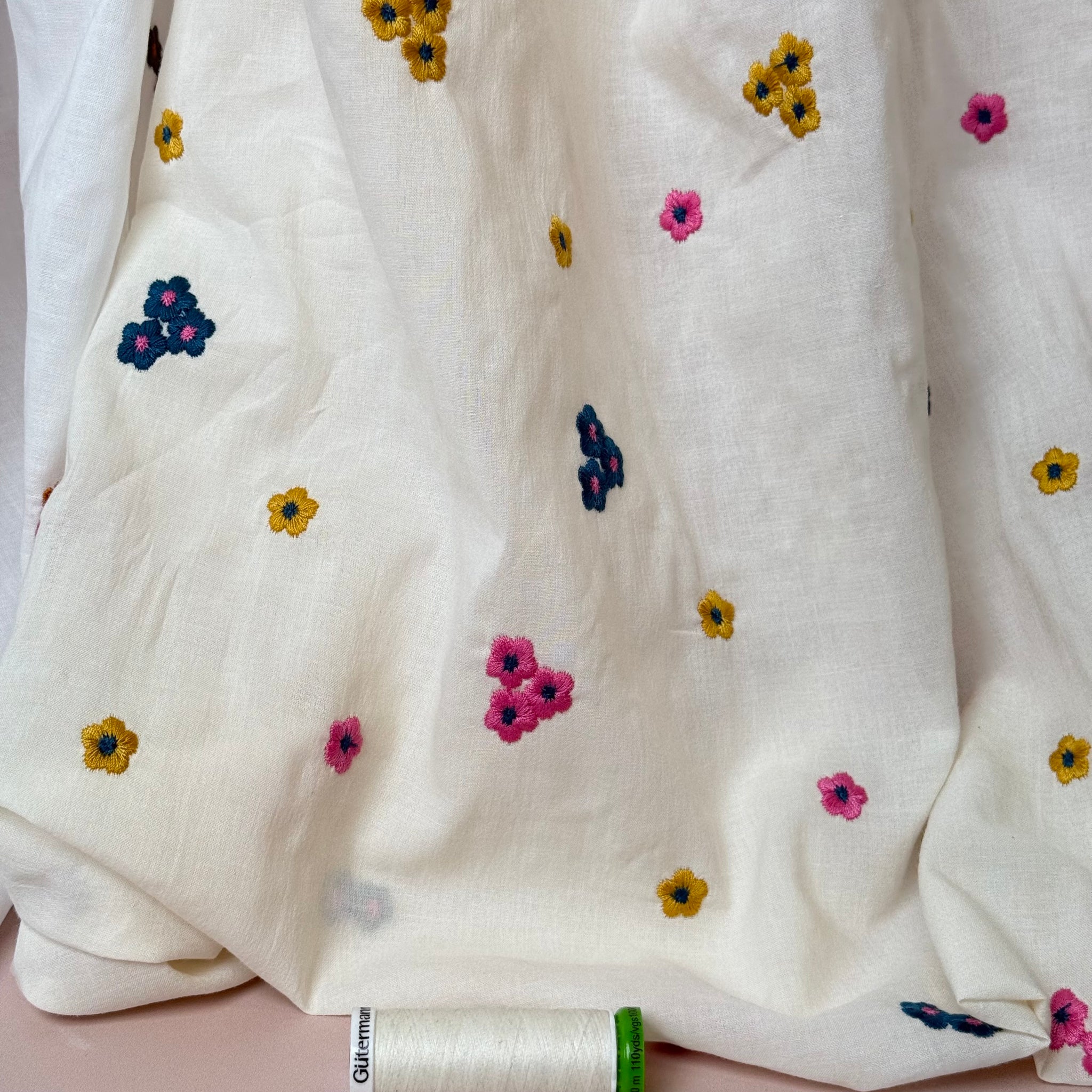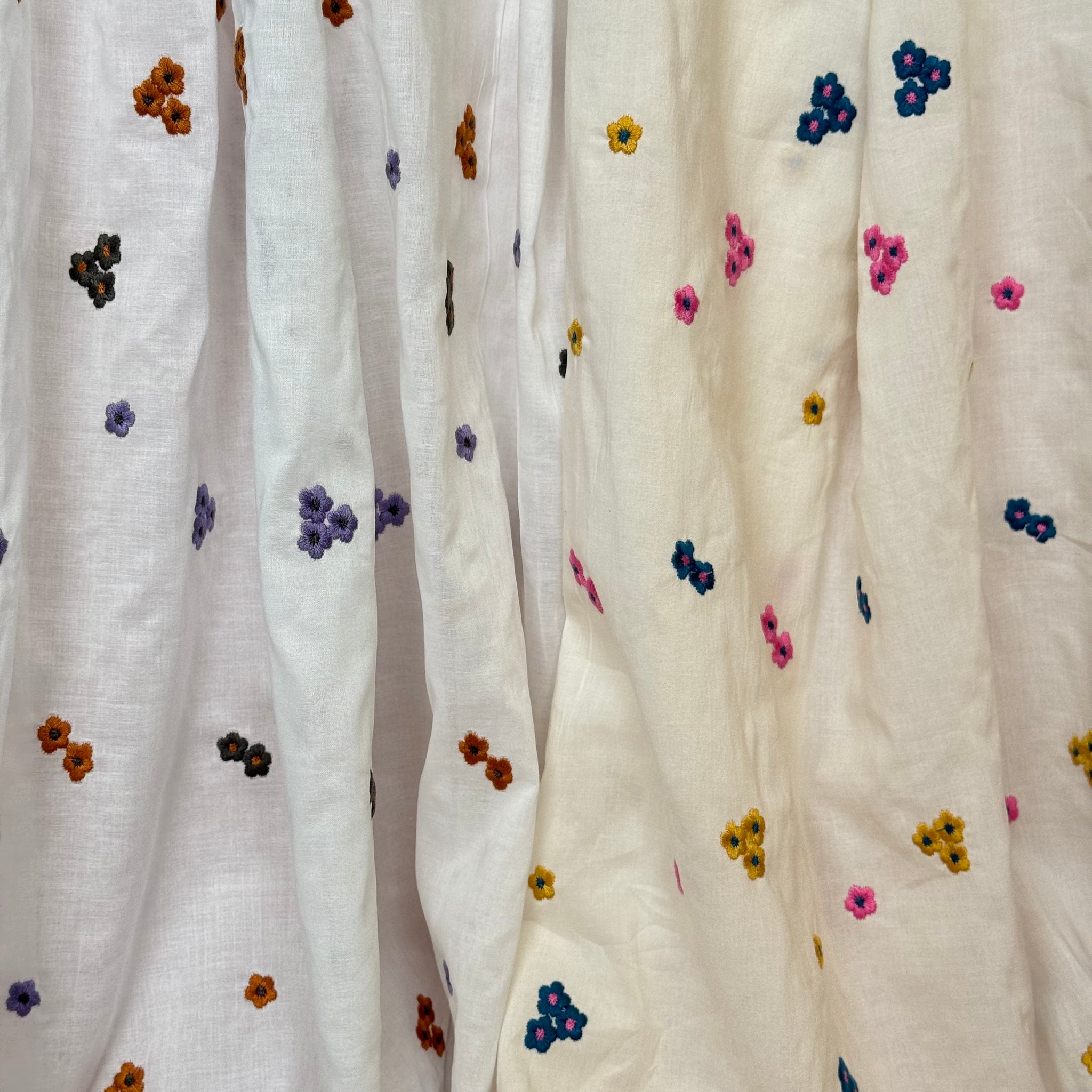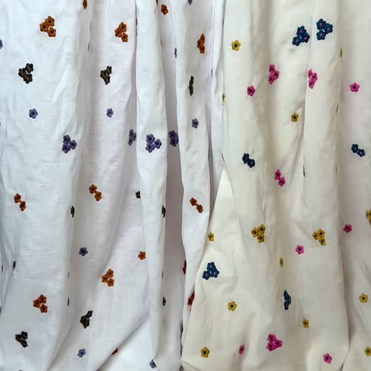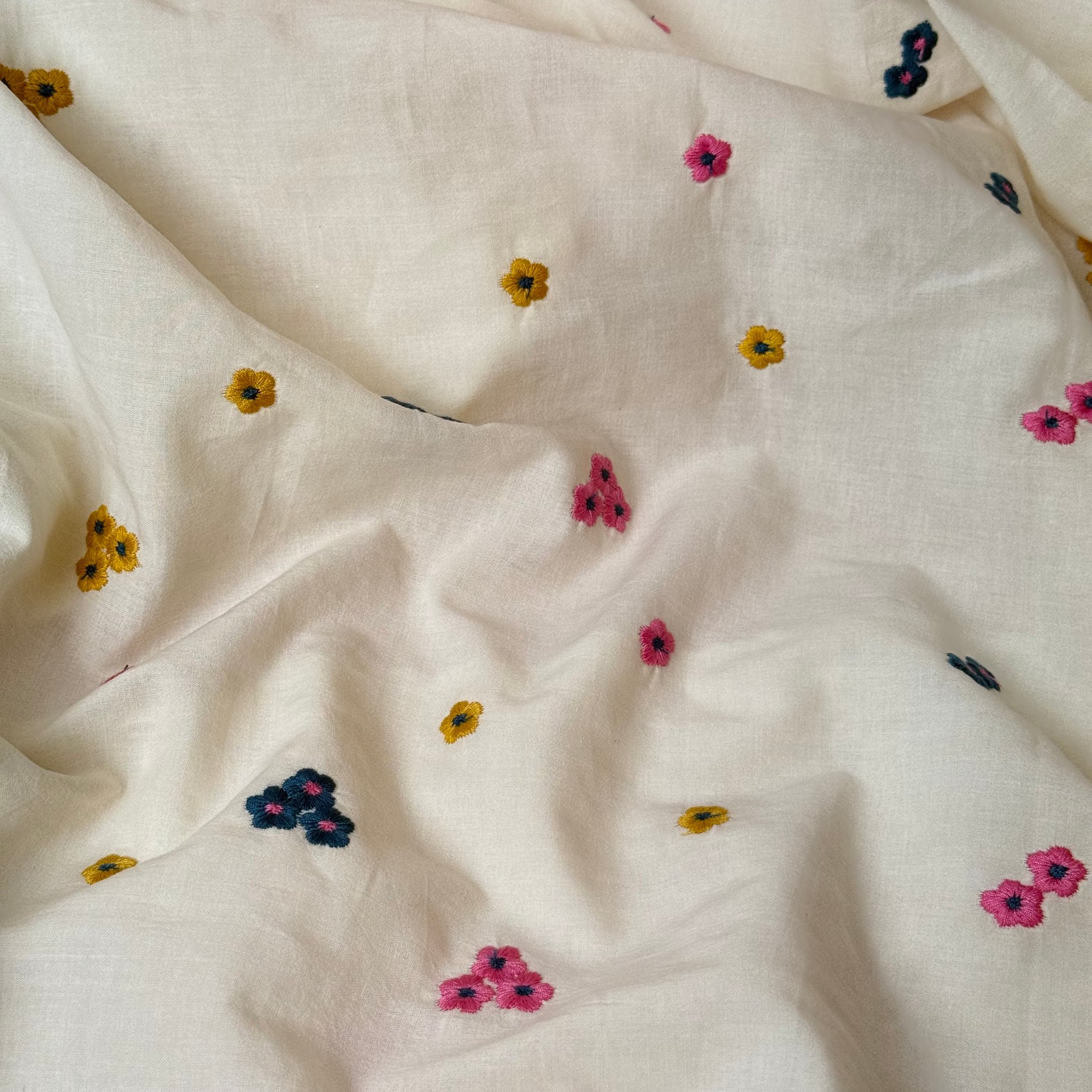 Unique and beautiful, soft, lightweight cotton voile fabric featuring colourful embroidered flowers in bright pink, mustard yellow and petrol shades on off-white. It is a perfect fabric for making blouses, shirts and dresses or summer tunics.