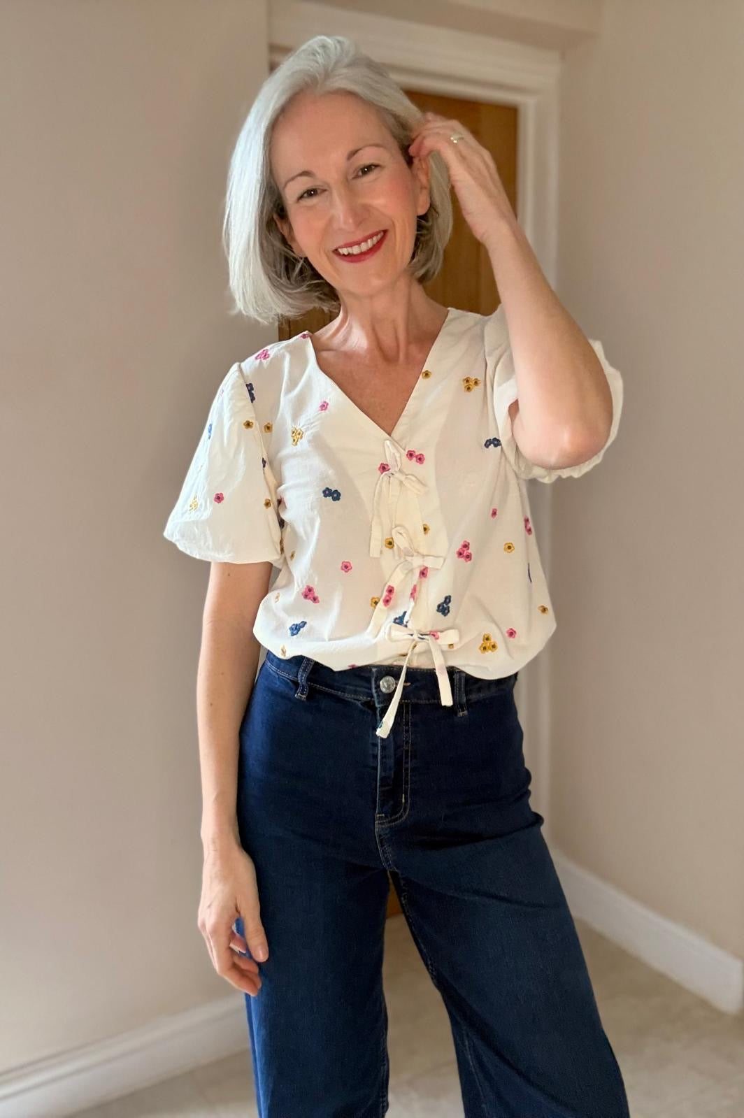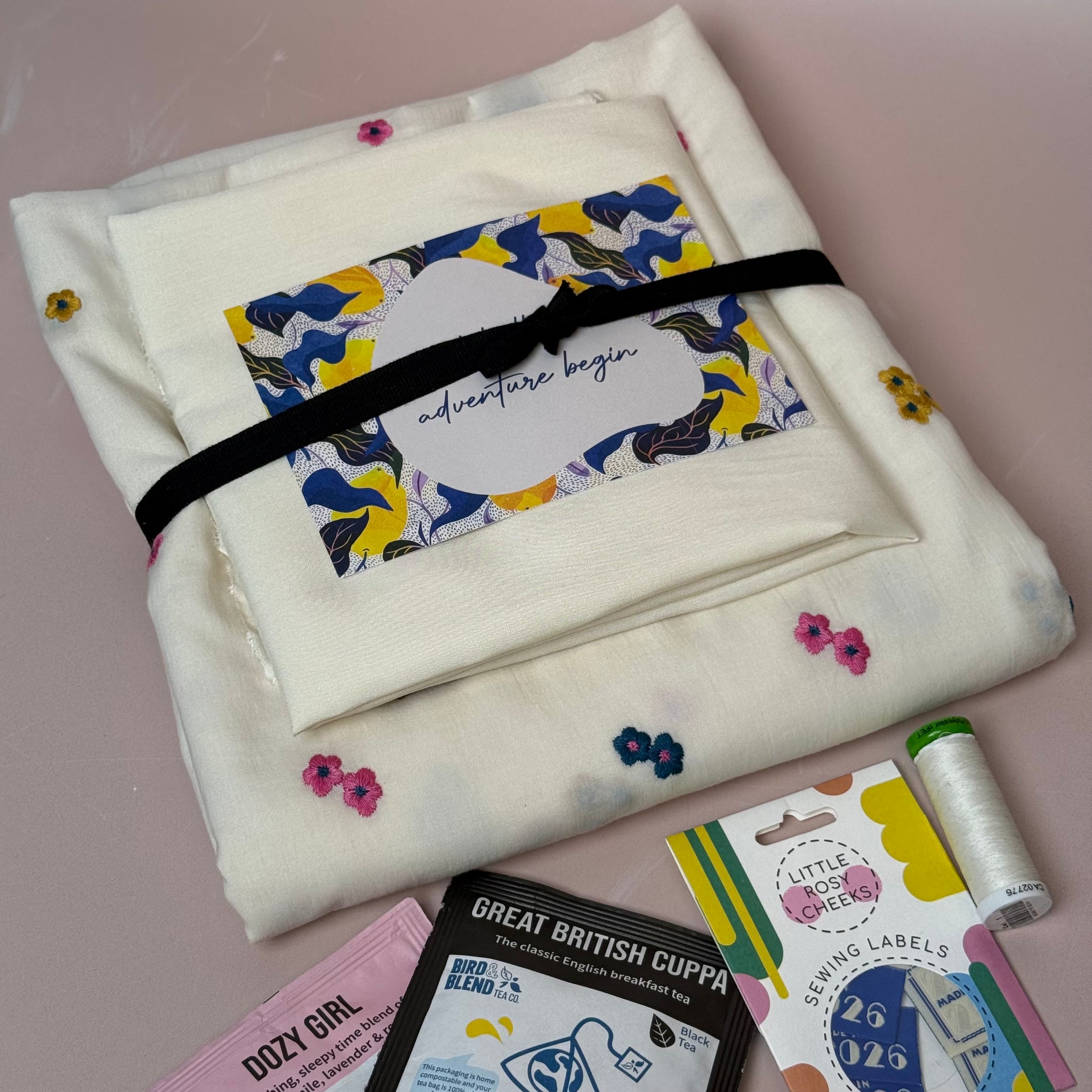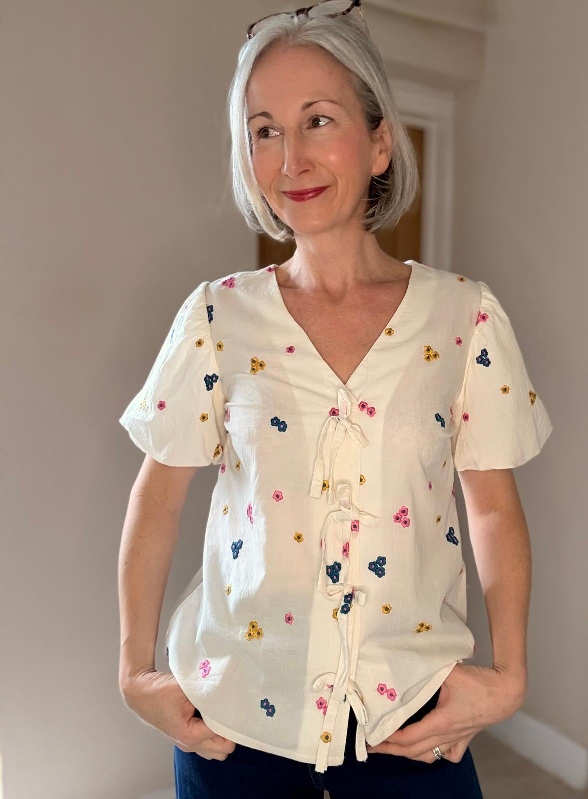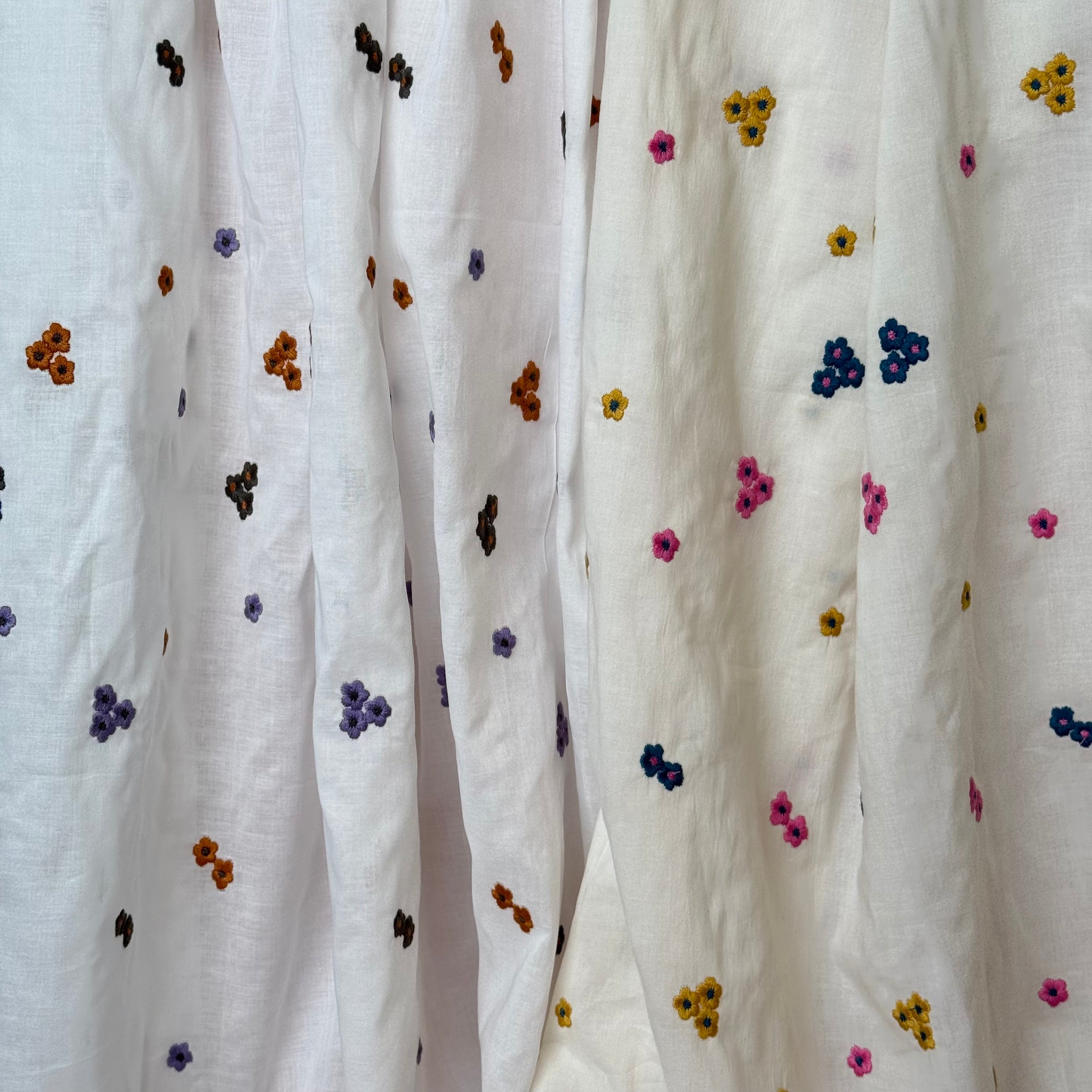 Unique and beautiful, soft, lightweight cotton voile fabric featuring colourful embroidered flowers in bright pink, mustard yellow and petrol shades on off-white. It is a perfect fabric for making blouses, shirts and dresses or summer tunics.
