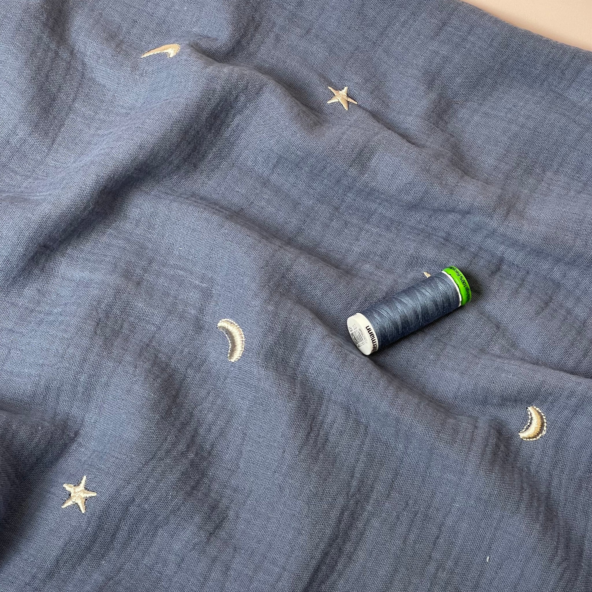 This dusty blue colour double gauze is soft with cute embroidered moon and stars design in a silvery-gold colour. This fabric can be used to make beautiful garments such as tops, dresses, simple blouses, trousers and children's clothes.