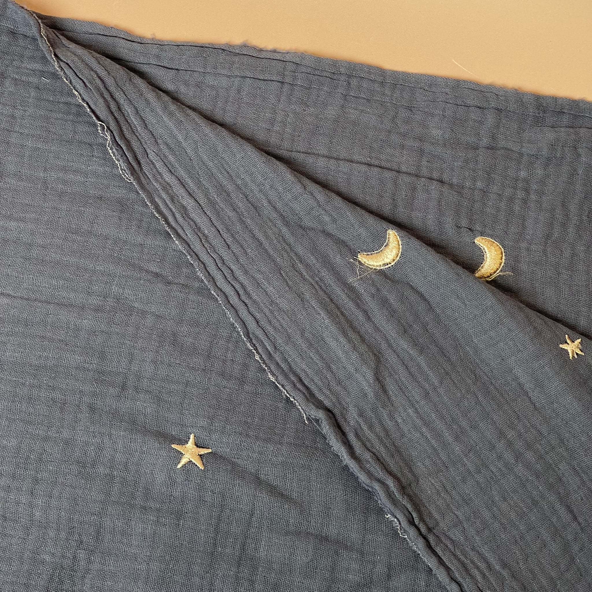 Embroidered Metallic Moon and Stars on Dusty Blue Cotton Double Gauze