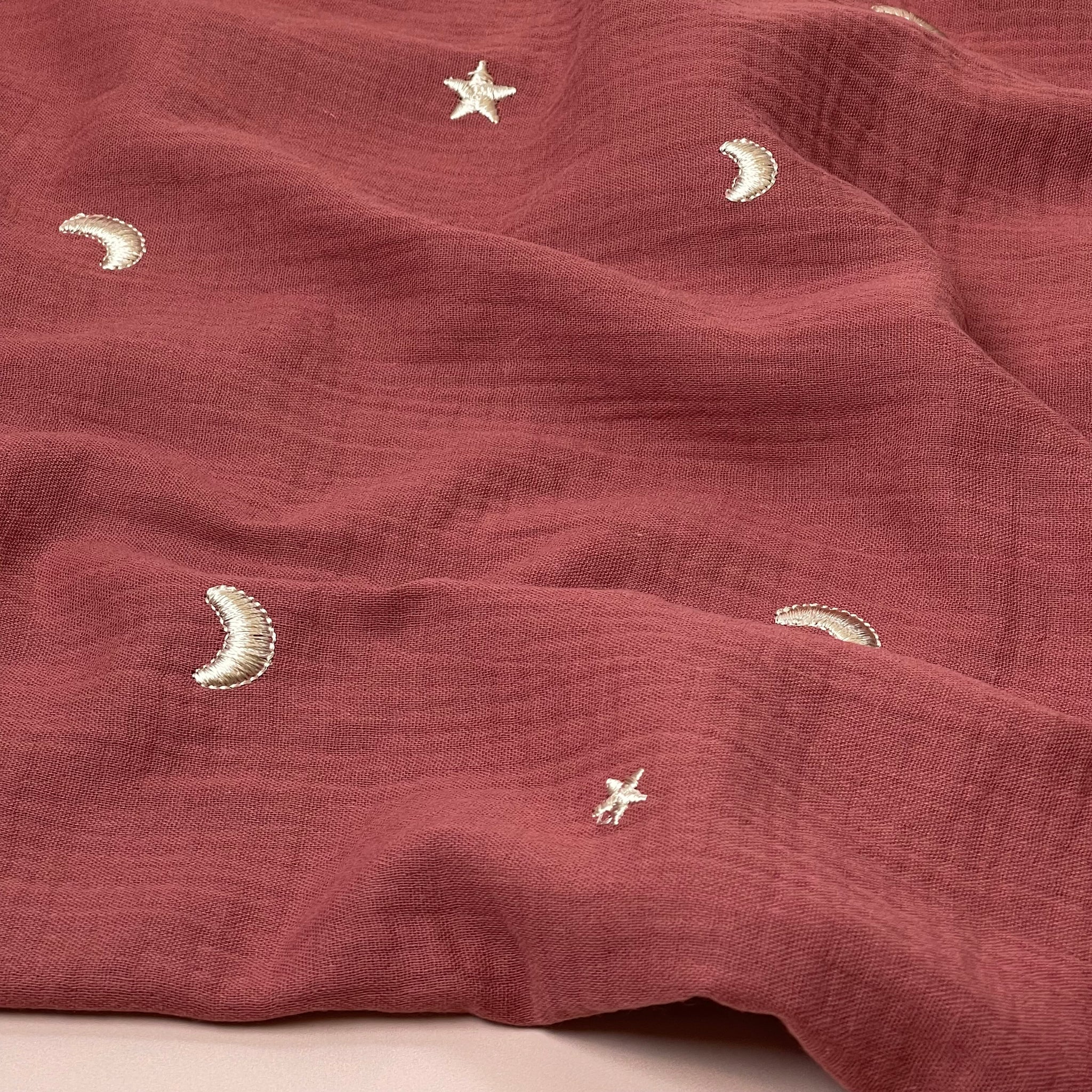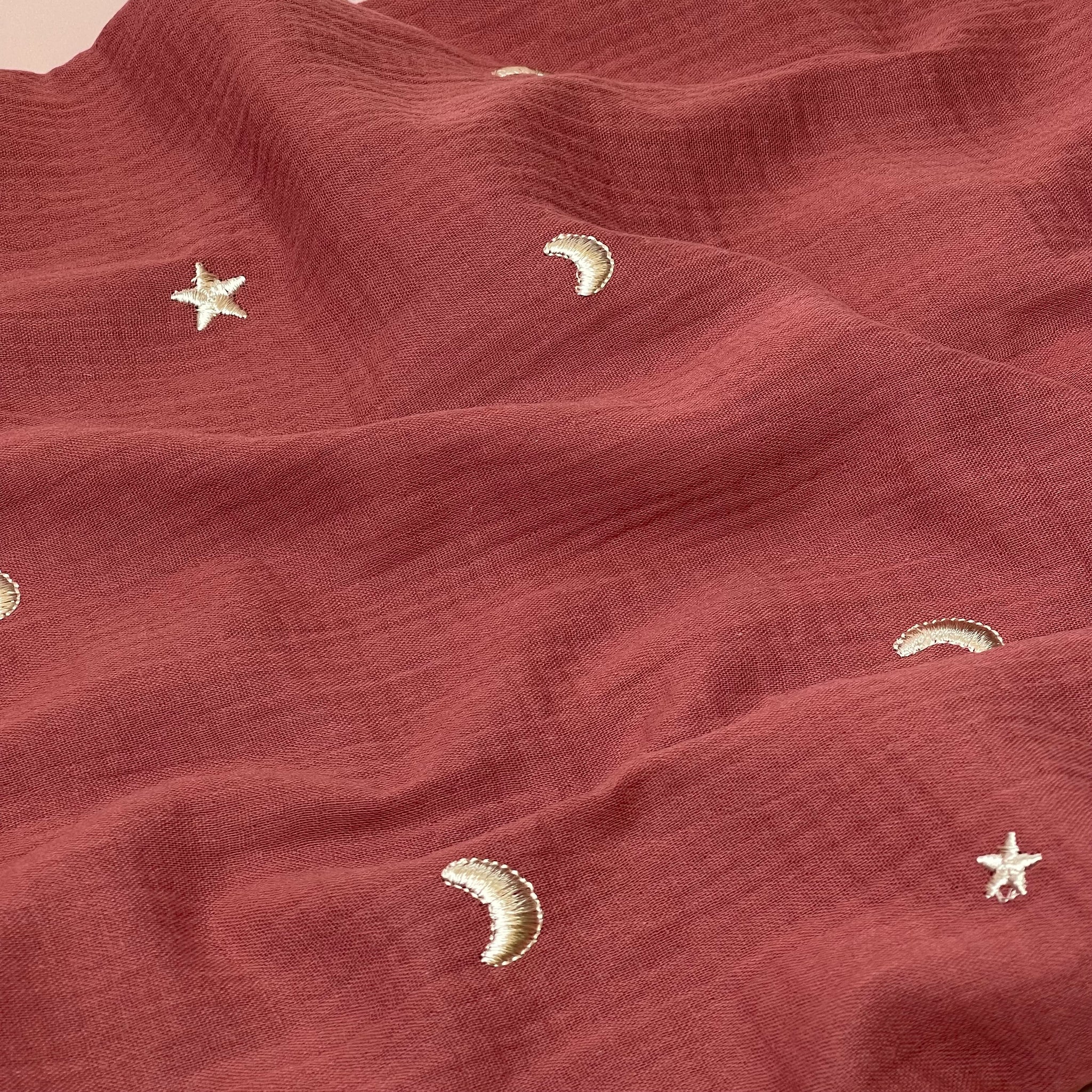 This brique red colour double gauze is soft with cute embroidered moon and stars design in a silvery-gold colour. This fabric can be used to make beautiful garments such as tops, dresses, simple blouses, trousers and children's clothes.