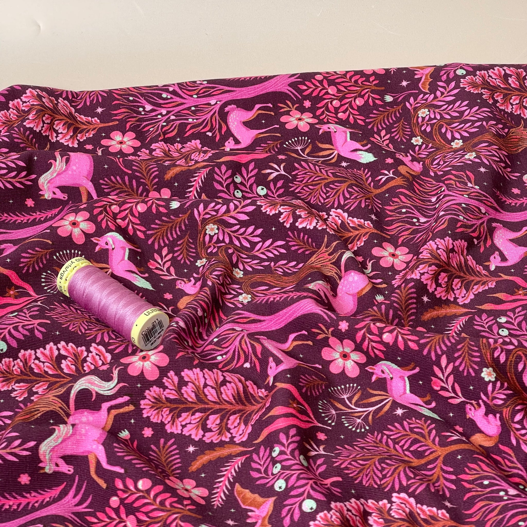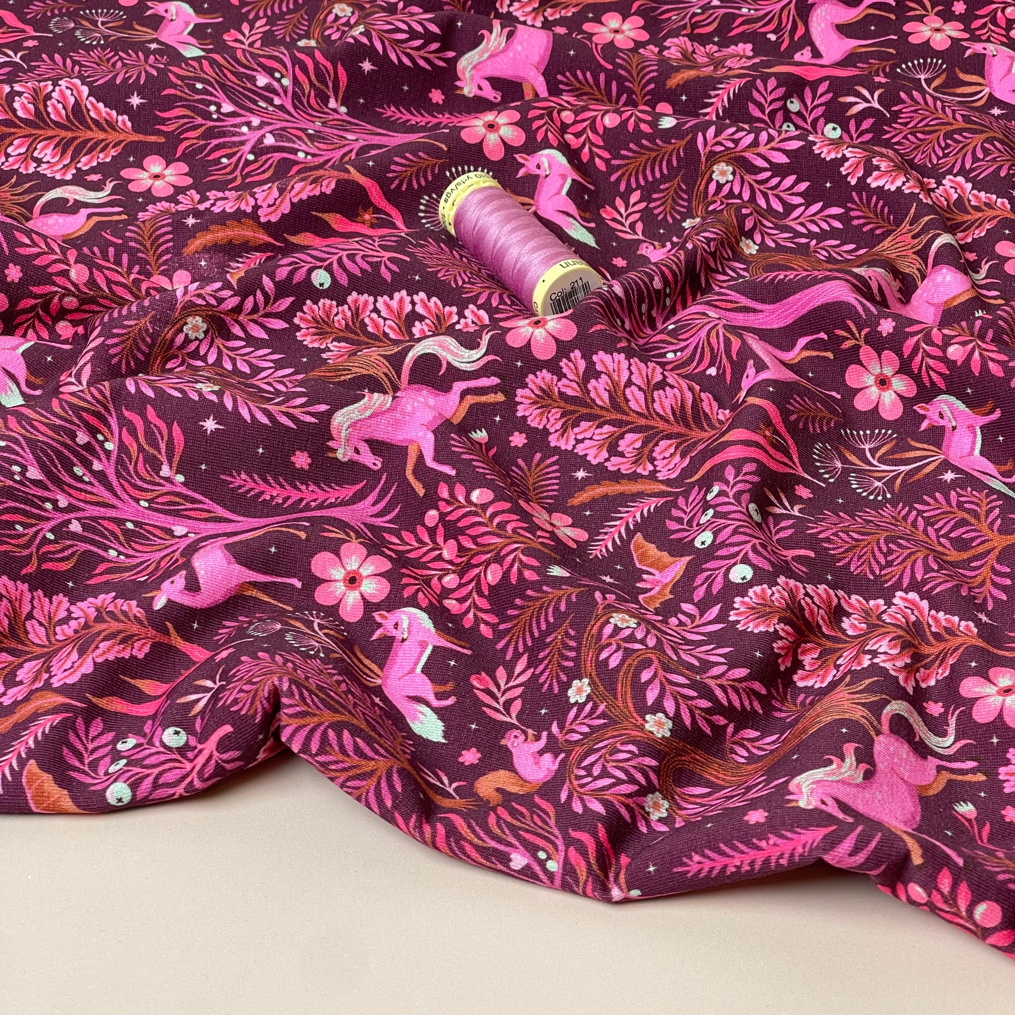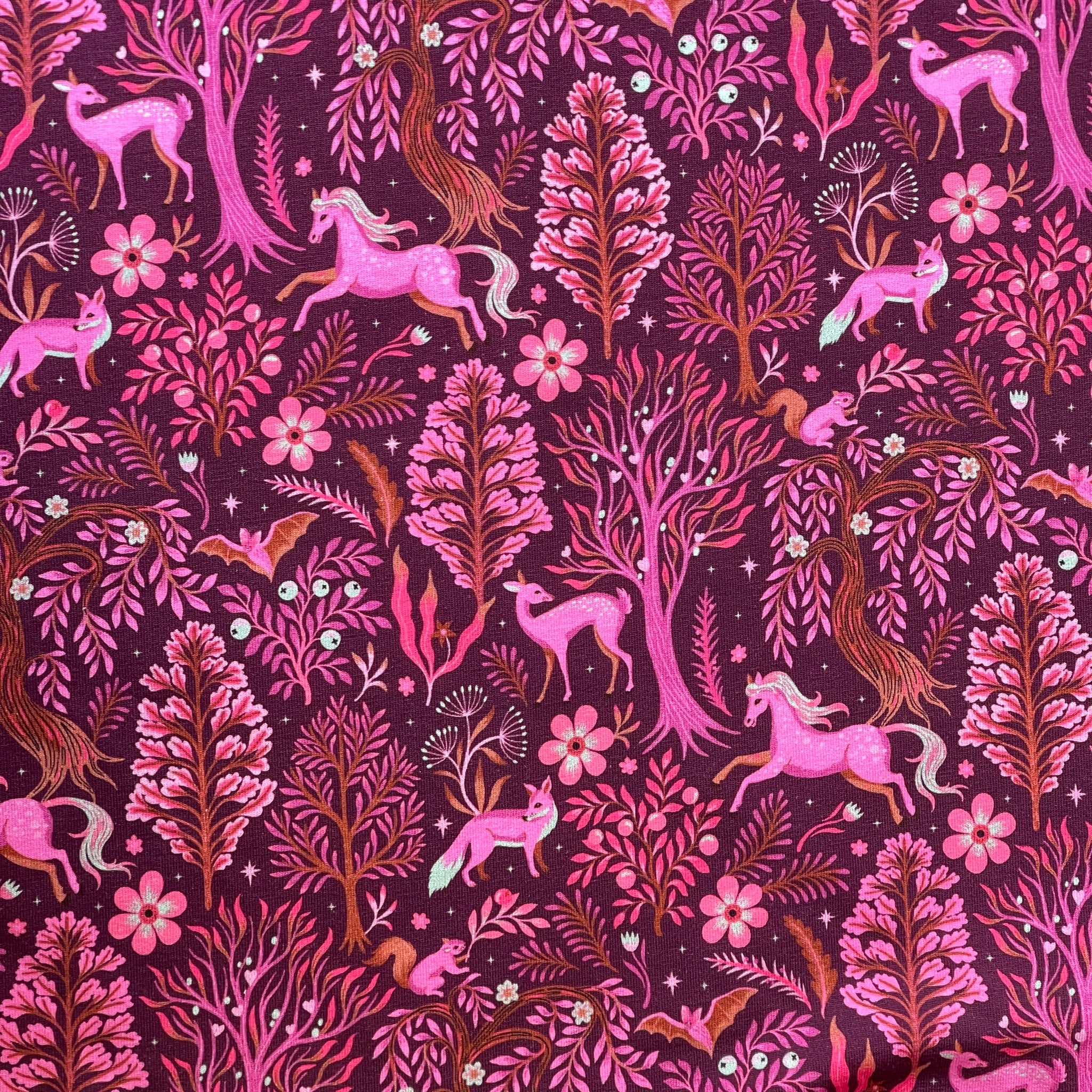 High quality cotton french terry fabric with looped back featuring enchanted Forest design with unicorns and other woodland animals in pink and burnt orange with light blue accents on a burgundy background. It will make a cosy, comfortable and elegant t-shirts, sweaters, hoodies, sweater dresses and joggers.