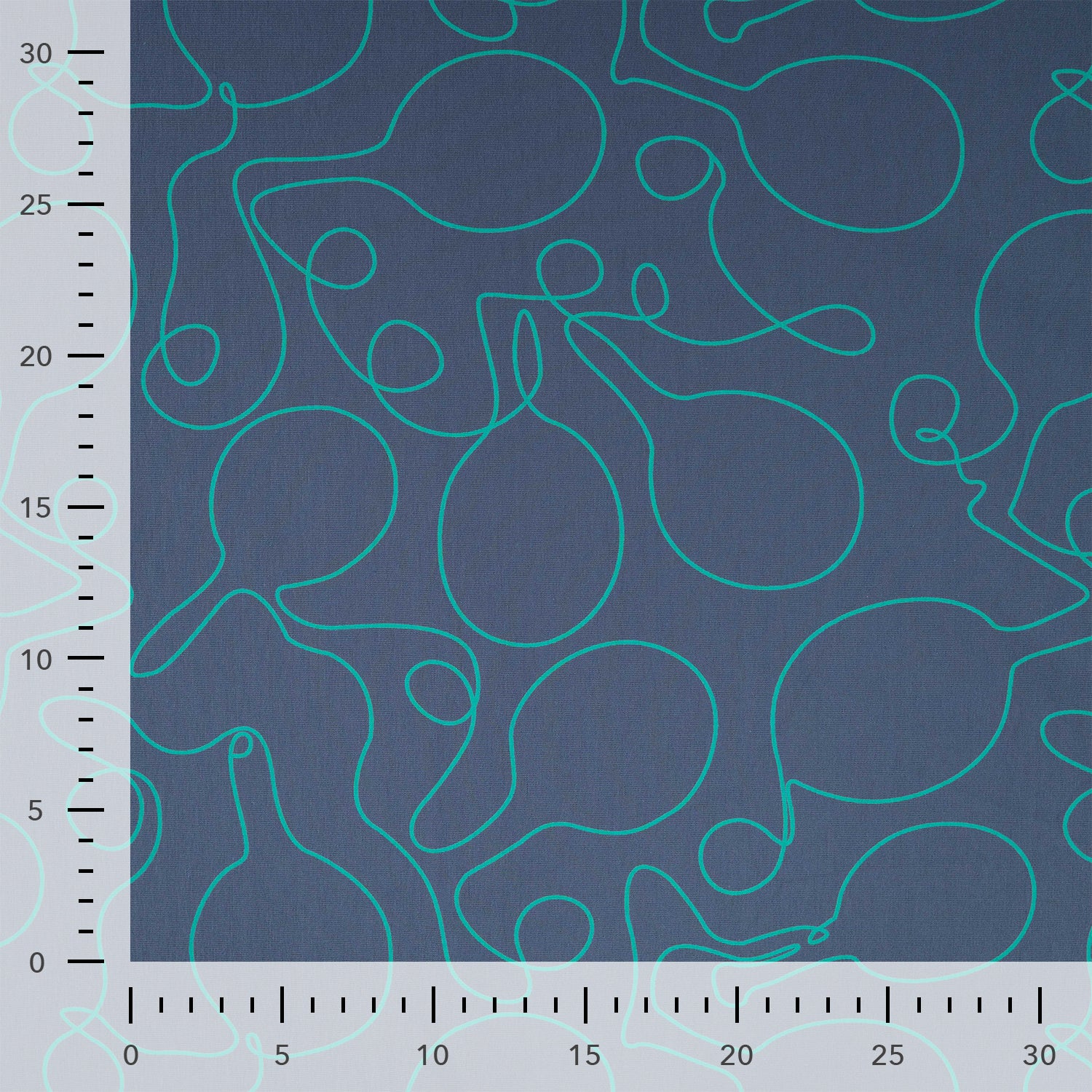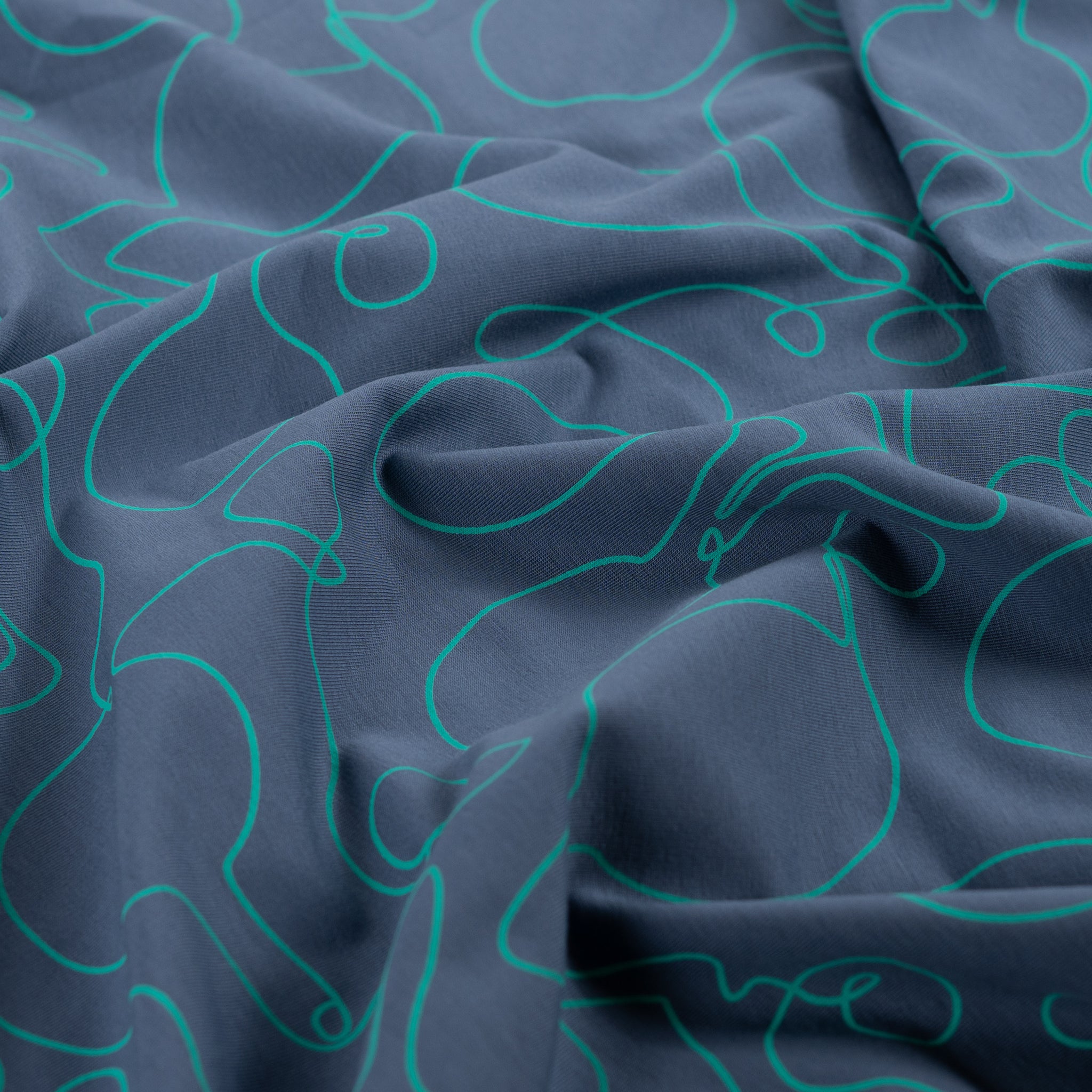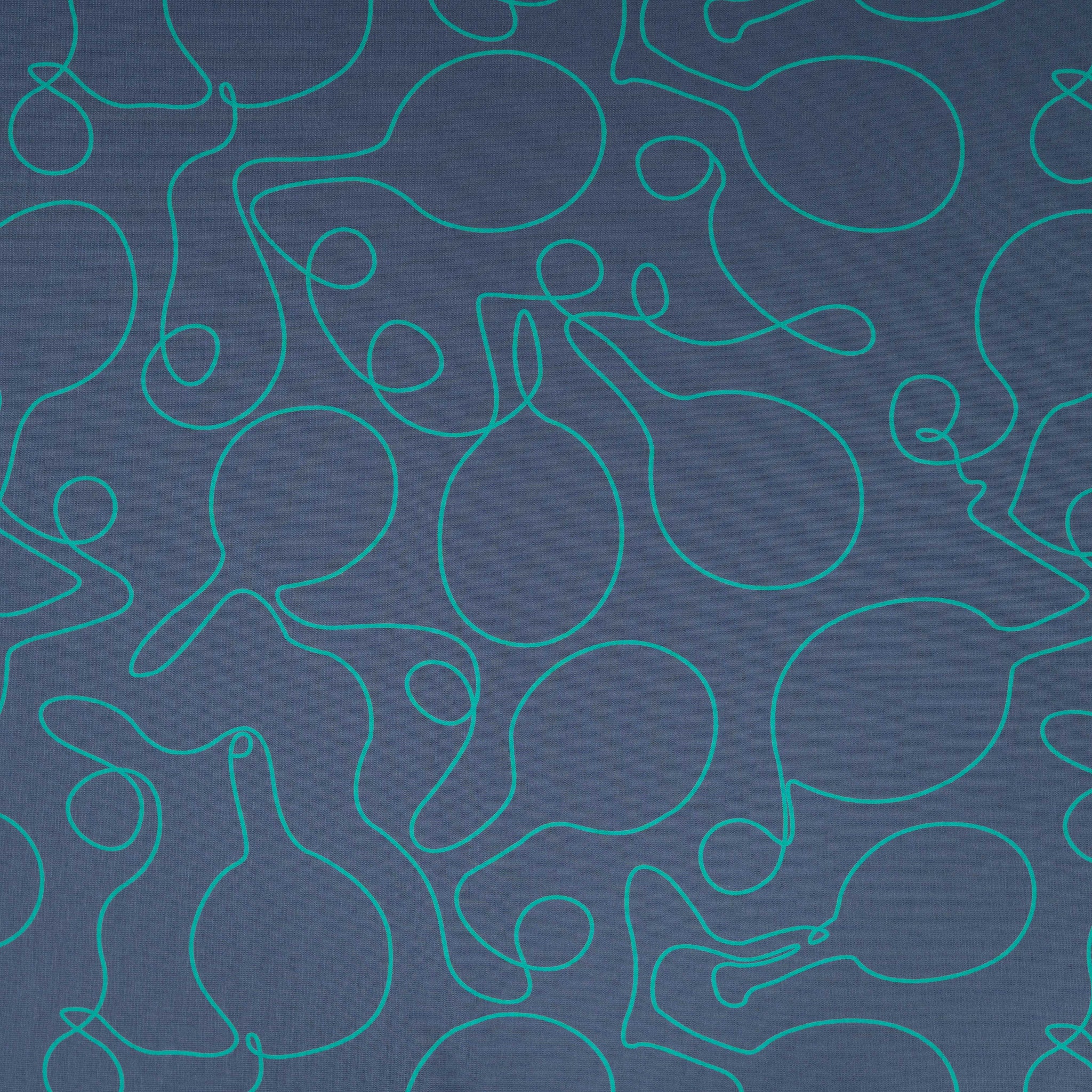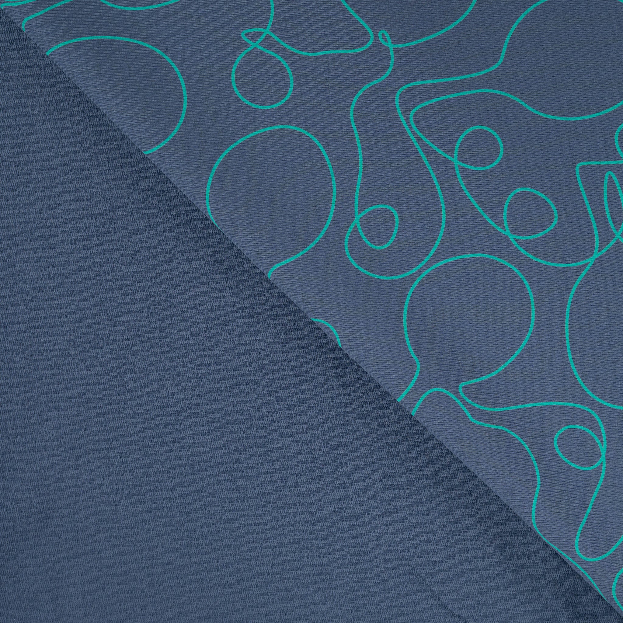 High quality cotton french terry fabric with looped back featuring abstract tennis racket line drawings in turquoise on a denim blue background. It will make a cosy, comfortable and elegant t-shirts, sweaters, hoodies, sweater dresses and joggers.