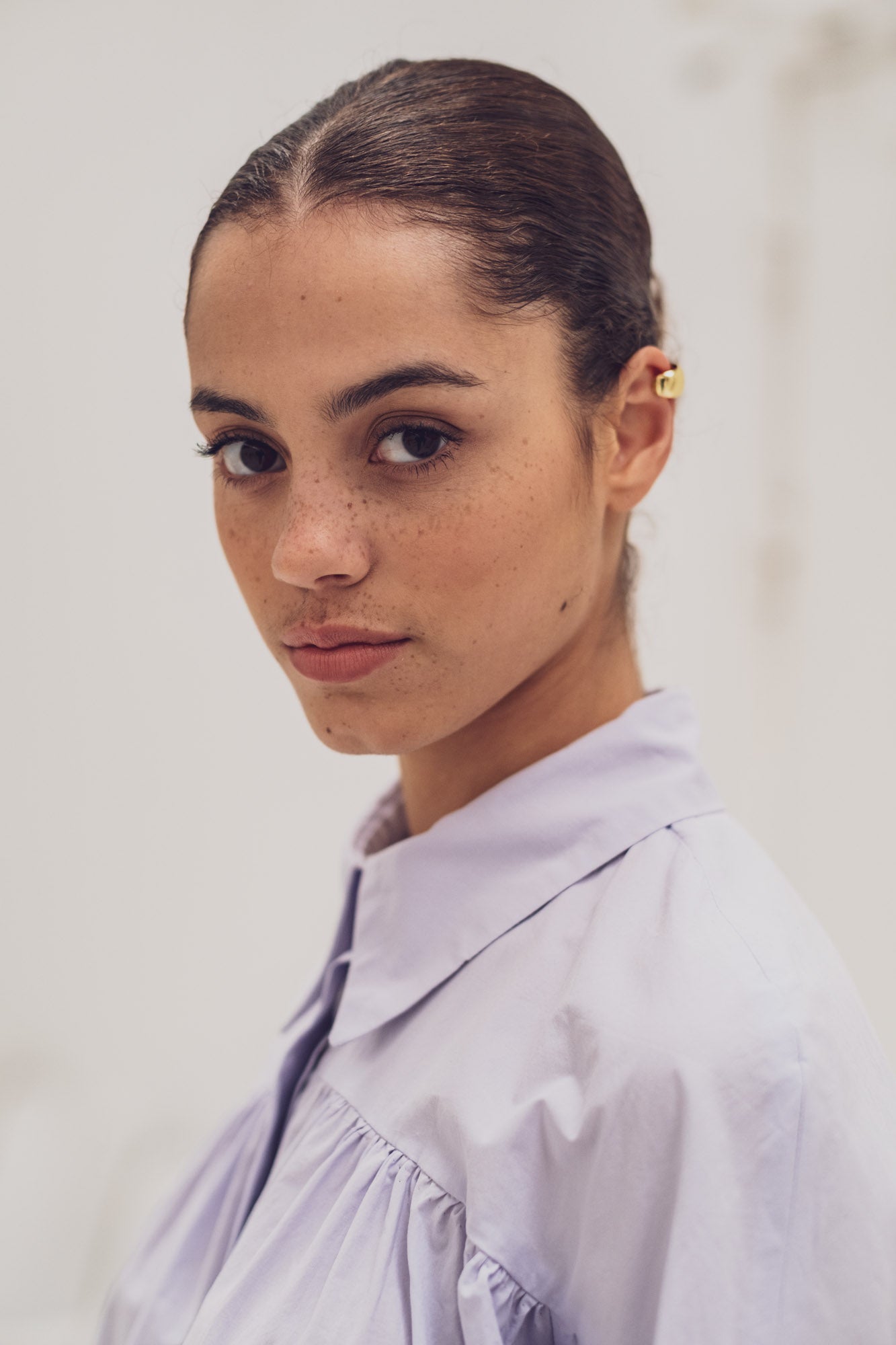Caren plays it smart: soft and romantic, but with a sleek counterpart. Romantic, thanks to the gathers all around. Sleek, thanks to the pointed collar with collar band and the yoke in the front and back that ensures a nice fit around the shoulders. The concealed button closure at the center front gives Caren a clean look, and then there's that little slit in the sleeve that adds a bit more oomph. Perfect for days when you want to be elegant without being too classic.