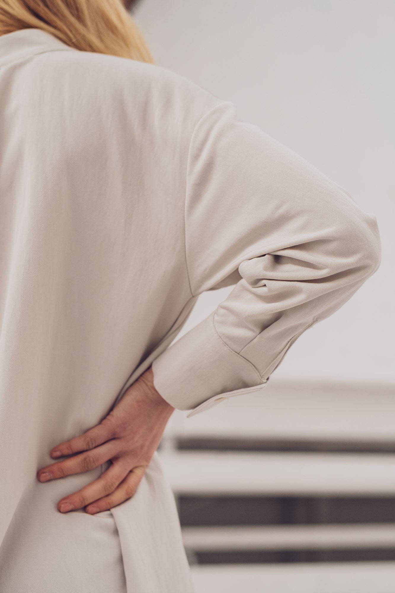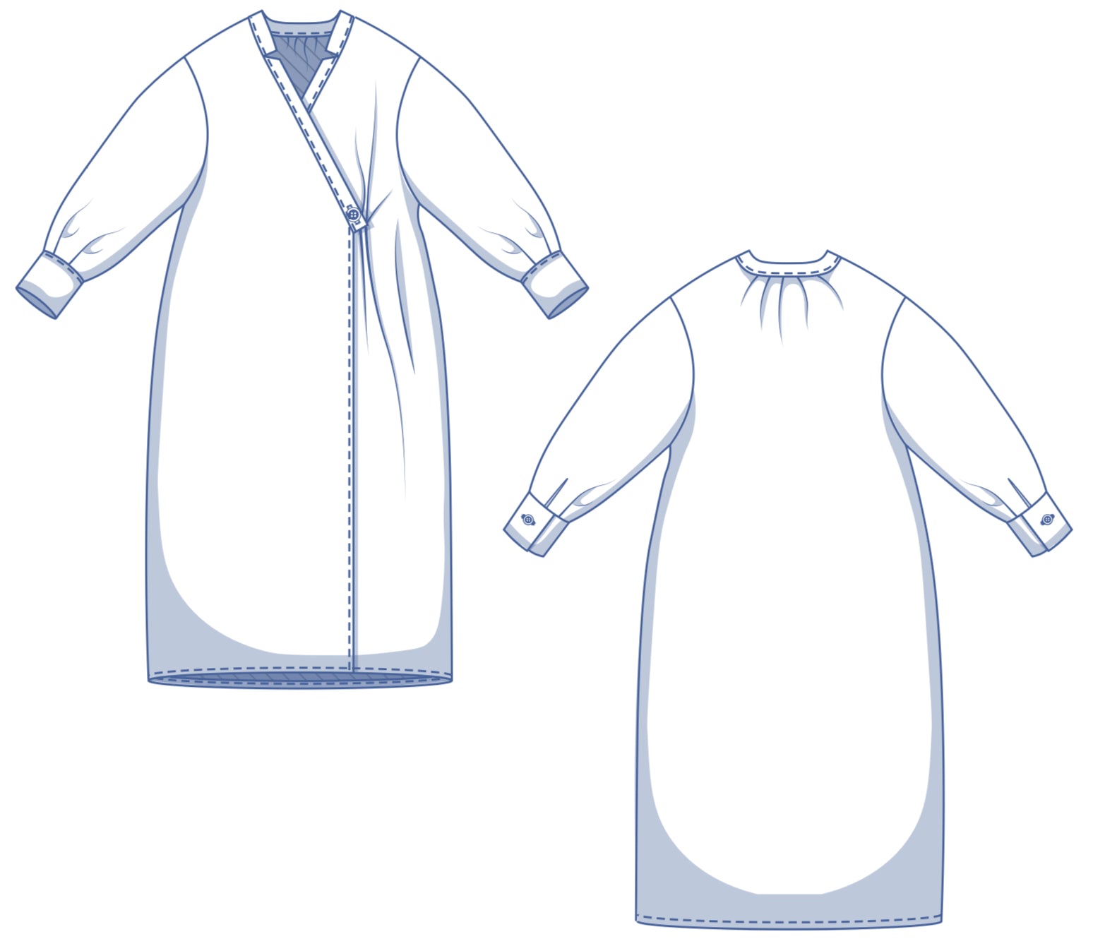 Ola is a loose dress with an asymmetrical button closure at the front that flatters the waist. The ties on the inside keep everything neatly in place (no unexpected glimpses, we promise!), and the gathers at the neckline in the back give Ola a subtle playful accent. The sleeves also get that little bit extra: pleats in the sleeve hem, finished with a cuff and sleeve slit. The stand-up collar adds the finishing touch and makes Ola a real must-sew.