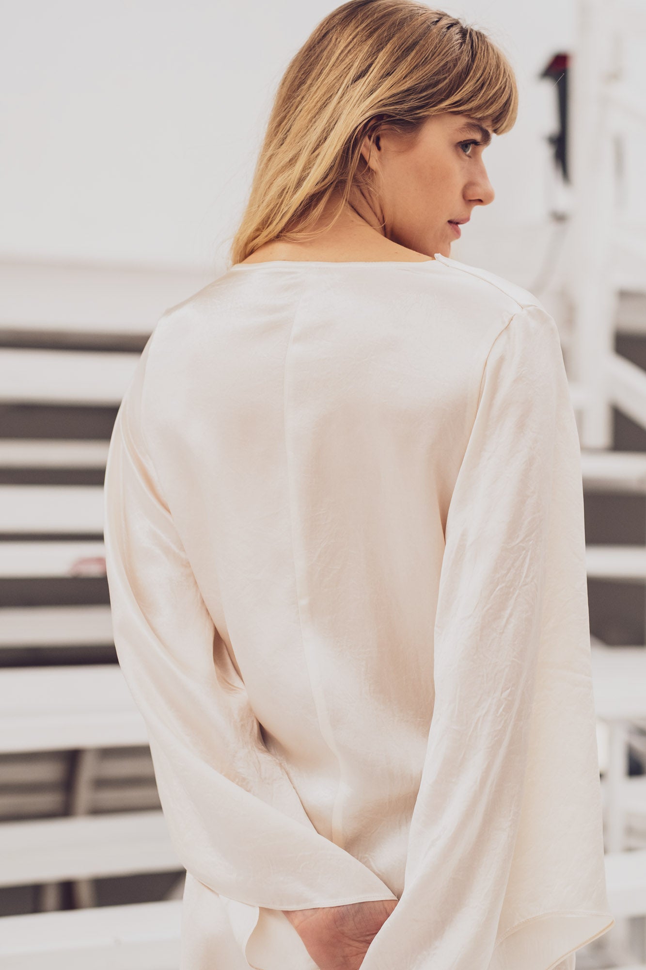 Vendela is a long, slightly tailored dress with wide, long sleeves, made for moments that require that little bit extra. The front has an elegant cowl neckline and is cut on the bias, allowing the dress to move smoothly and making it completely dance floor-proof. The back is cut on the straight grain and finished neatly with bias tape at the neckline. No zips, no buttons, no fuss: just slip it on and you're ready to go. The most exciting part is cutting the front on the bias. Once that's done, Vendela can be sewn together surprisingly quickly. Finish the hems with a rolled hem for a refined finish.