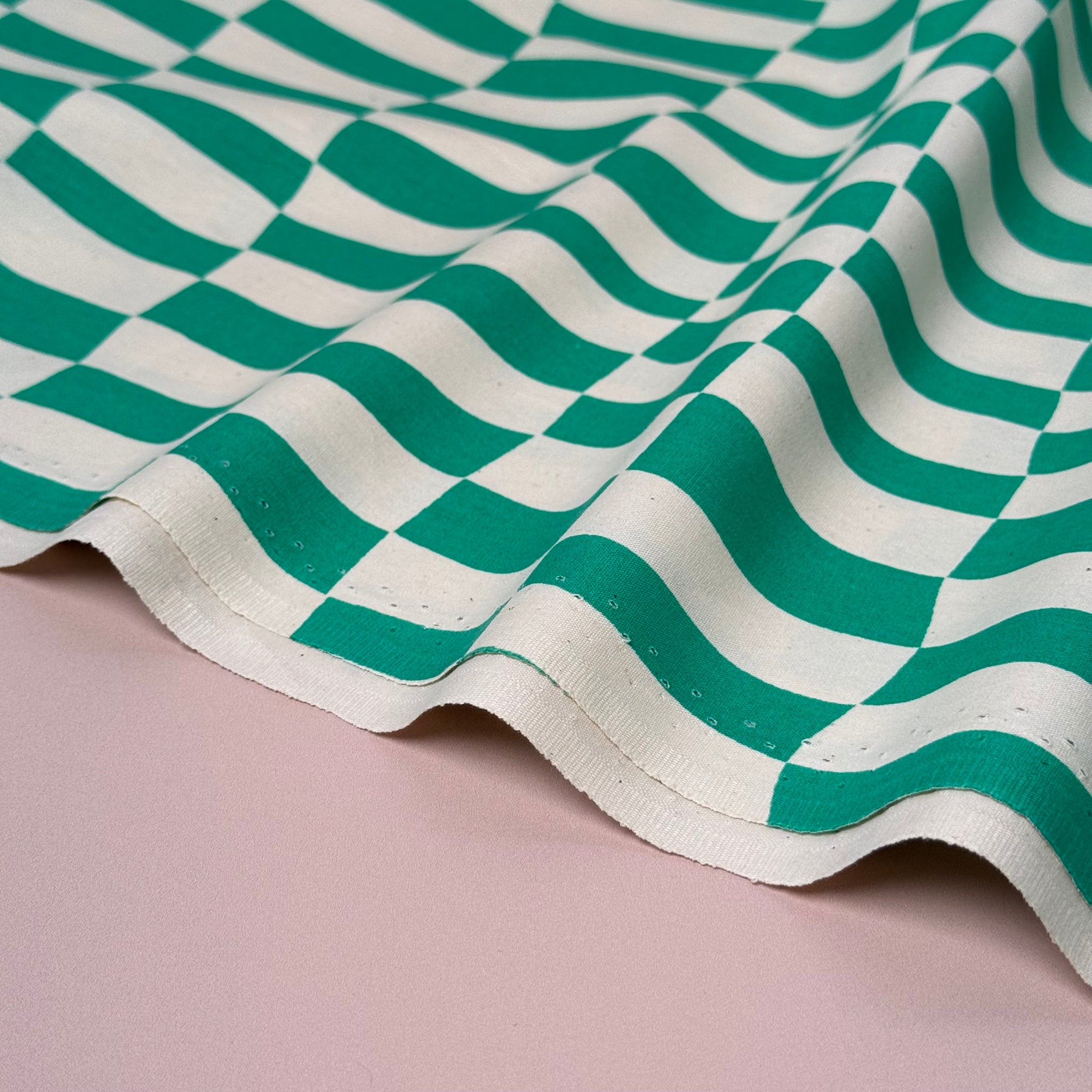This organic cotton is soft and beautiful featuring graphic floral designs in blue, pink, yellow and red on a green background. This fabric can be used to make beautiful garments such as tops, dresses, simple blouses, trousers and children's clothes.