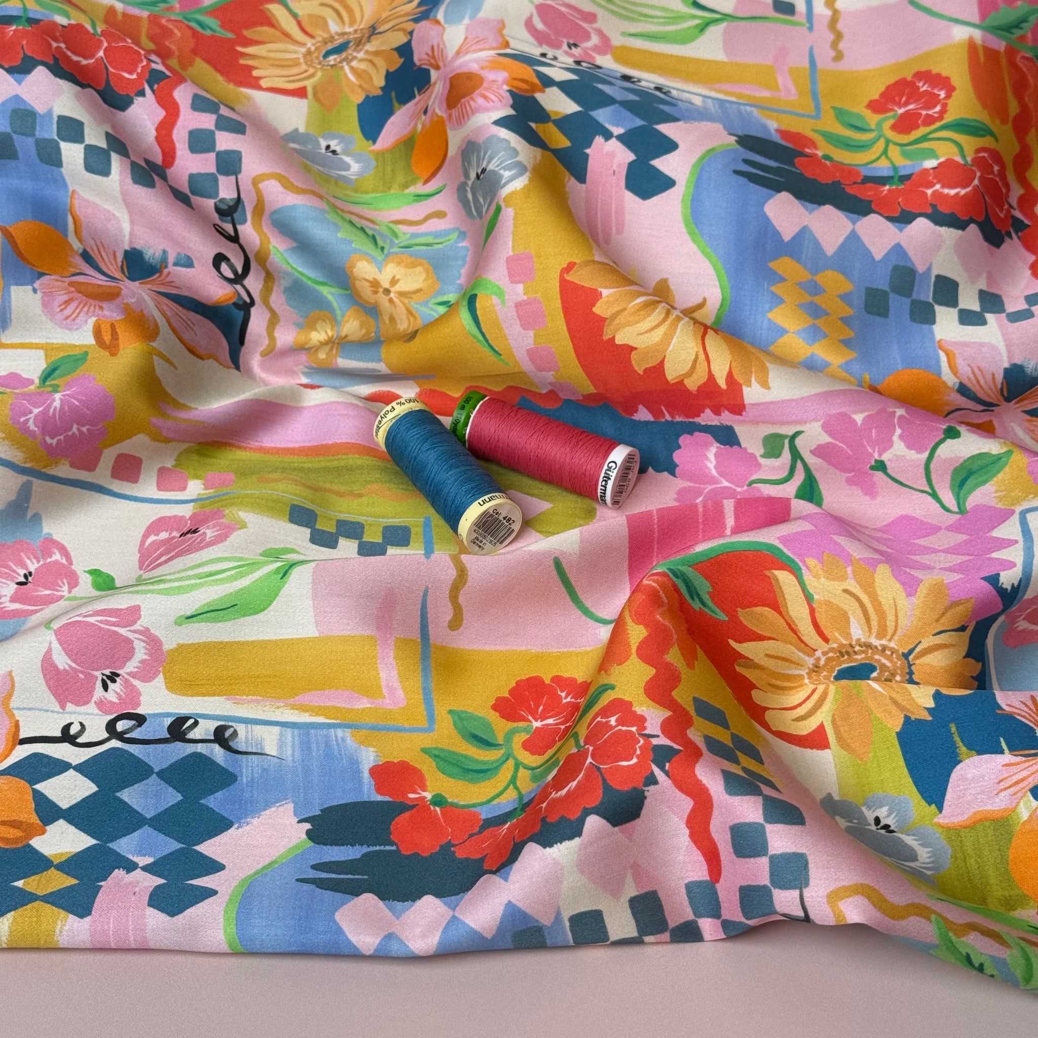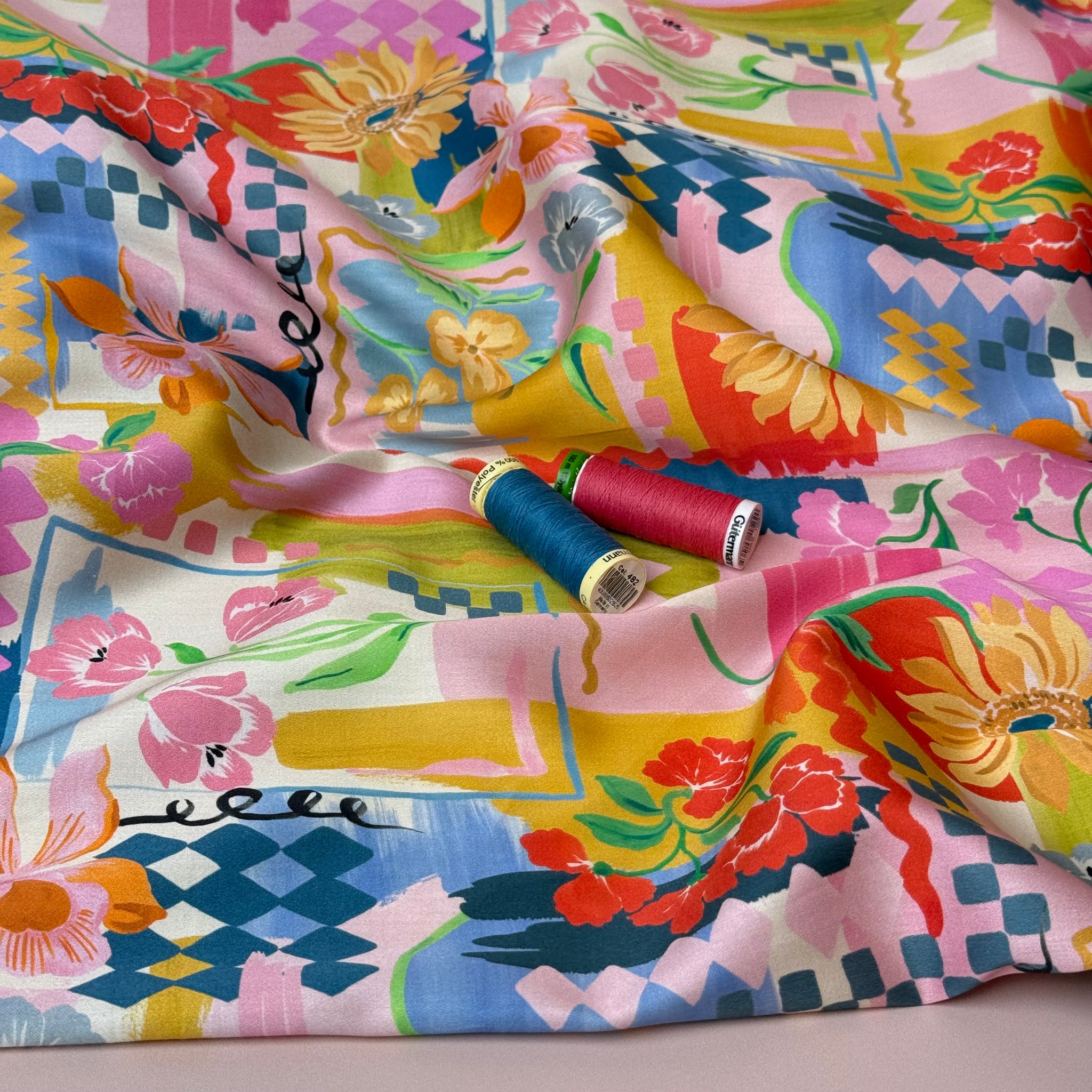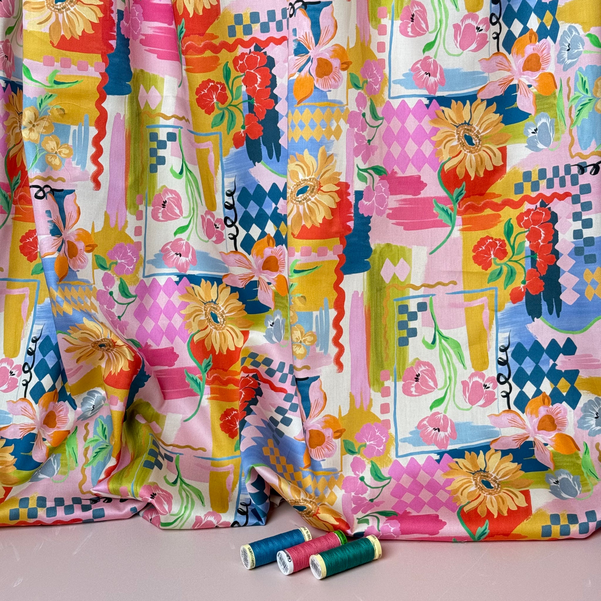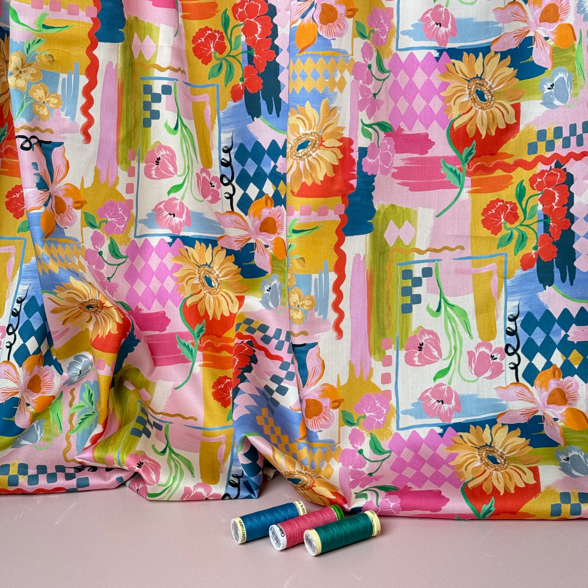 Cotton sateen is made of the finest high-quality yarns. It is one of the most expensive types of cotton fabric, which is widely used in the production of clothing and sheeting. This vibrant and bold design has a silky smooth feel and subtle drape, ideal for making dresses, shirts, blouses, pyjamas and skirts.