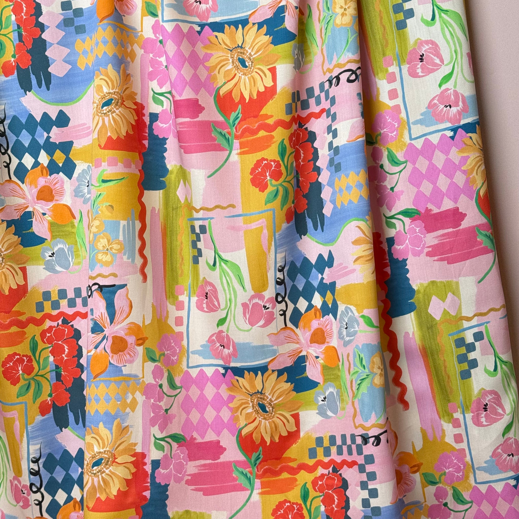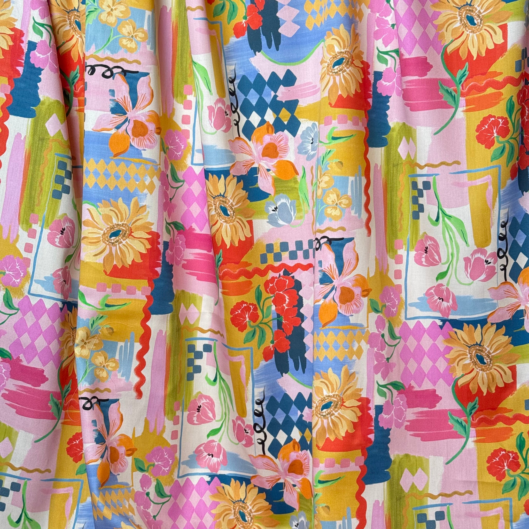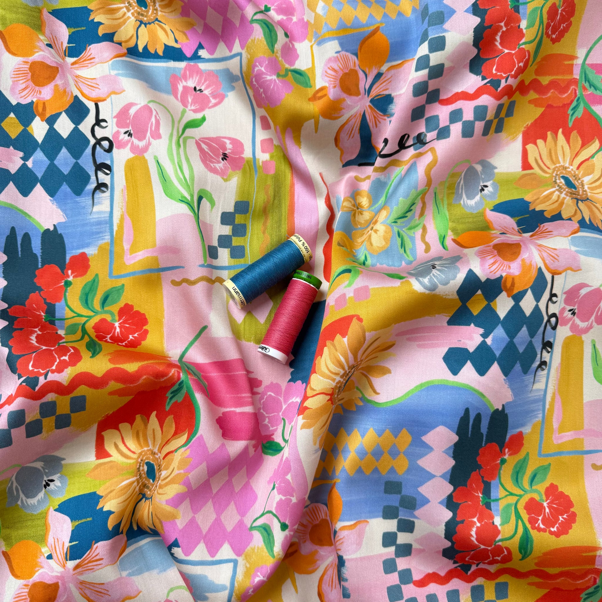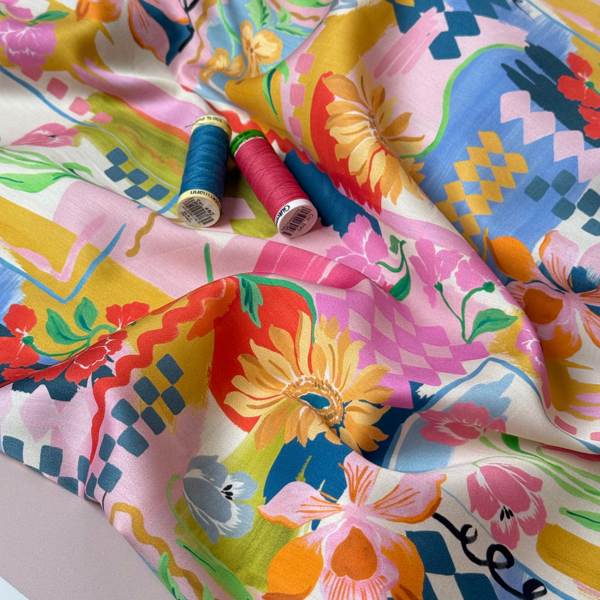 Cotton sateen is made of the finest high-quality yarns. It is one of the most expensive types of cotton fabric, which is widely used in the production of clothing and sheeting. This vibrant and bold design has a silky smooth feel and subtle drape, ideal for making dresses, shirts, blouses, pyjamas and skirts.