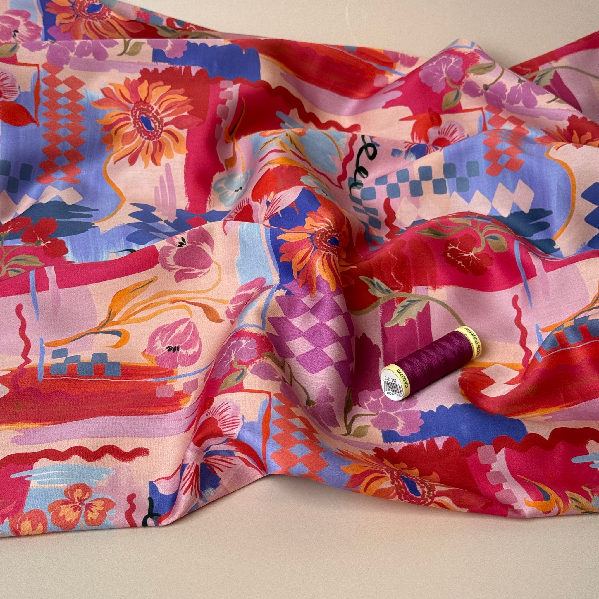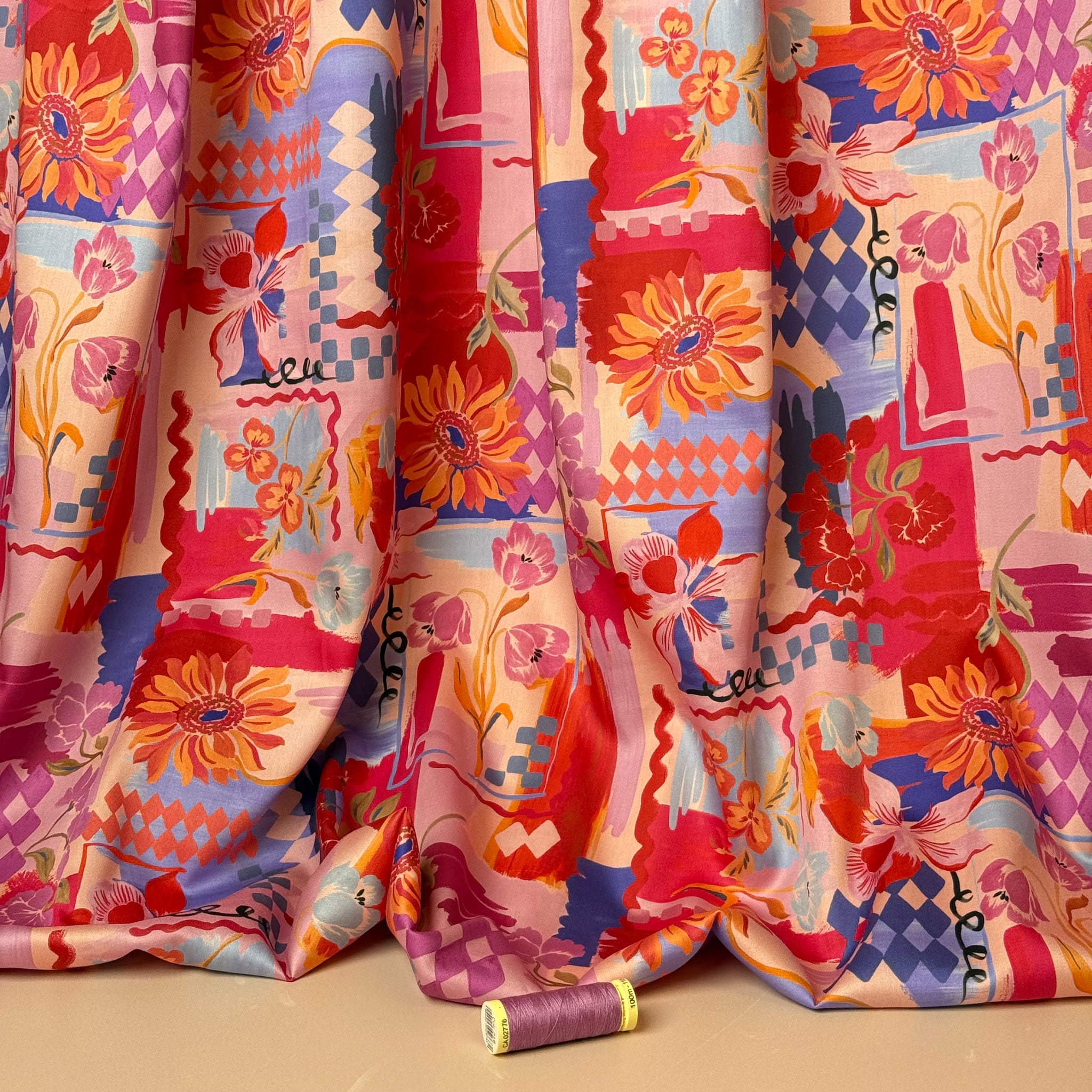 This striking cotton sateen features a patchwork postcard design in red, blue and coral. It is soft, smooth and silky with drape.