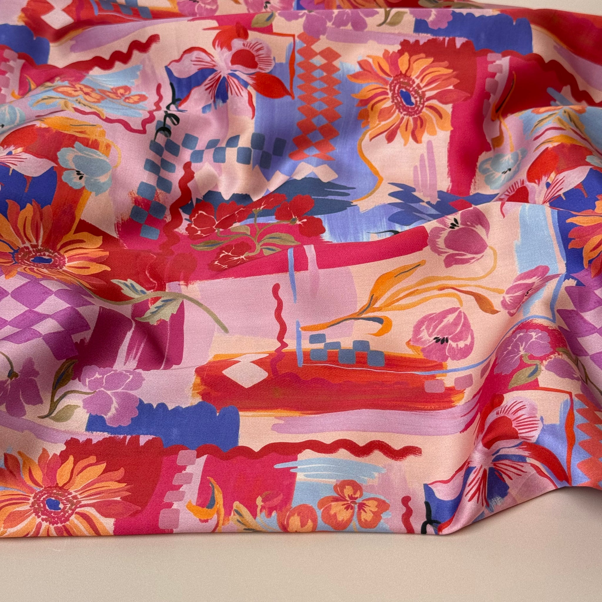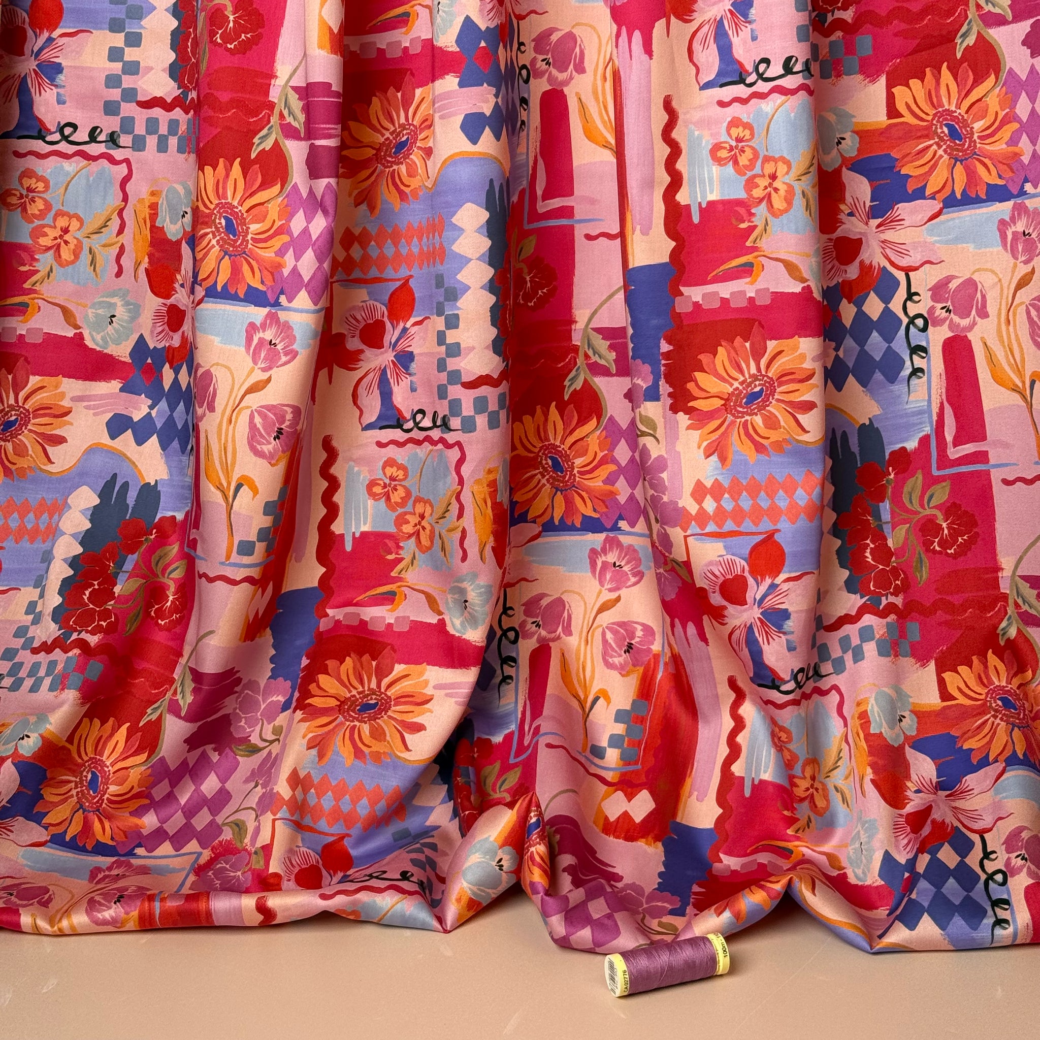 Cotton sateen is made of the finest high-quality yarns. It is one of the most expensive types of cotton fabric, which is widely used in the production of clothing and sheeting. This vibrant and bold design has a silky smooth feel and subtle drape, ideal for making dresses, shirts, blouses, pyjamas and skirts.