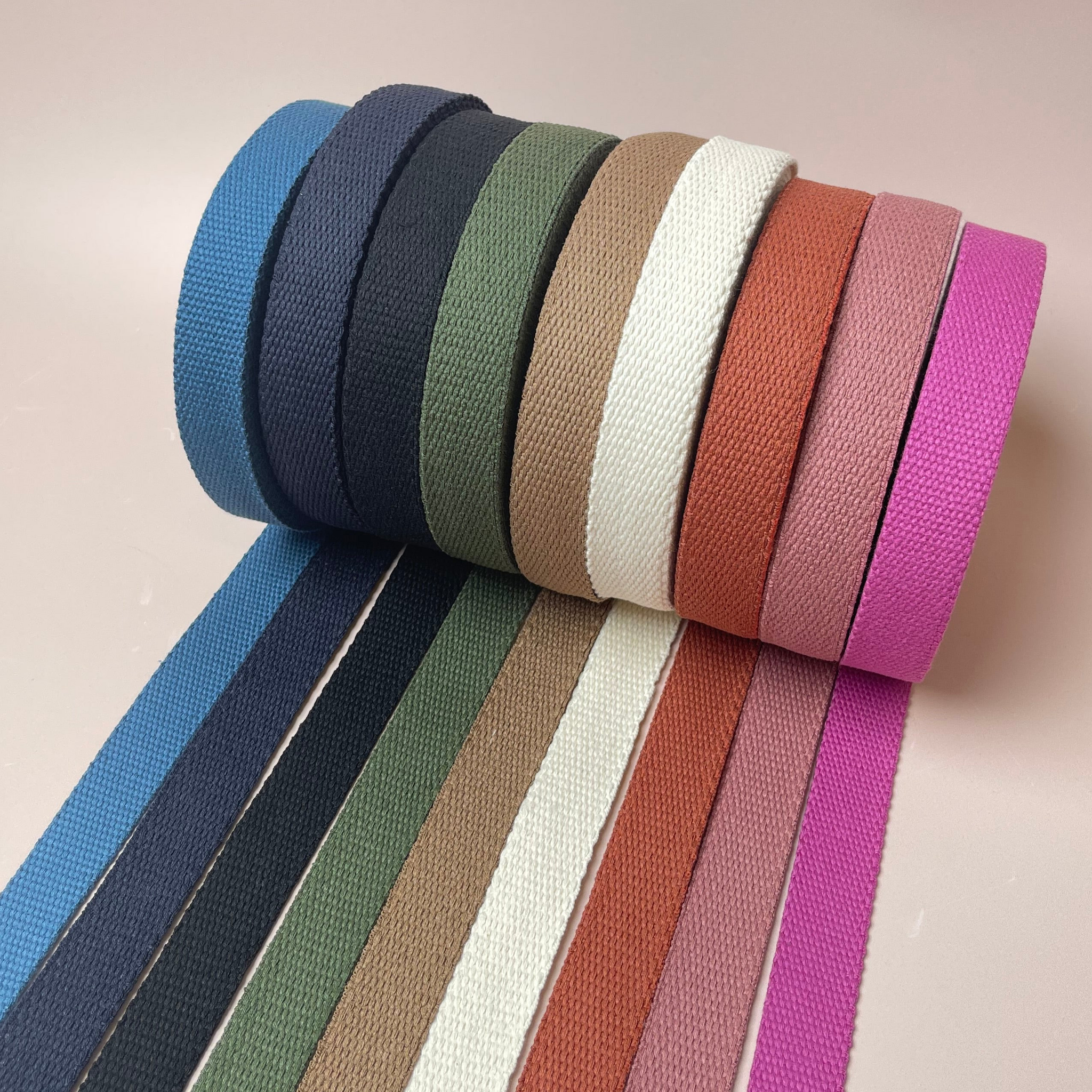 Our 100% cotton webbing is the perfect combination of durability and flexibility, and an essential material for your sewing and crafting projects. Designed for bag straps, handles, belts, and other sturdy accessories, this high-quality webbing ensures a strong hold while remaining soft to the touch.