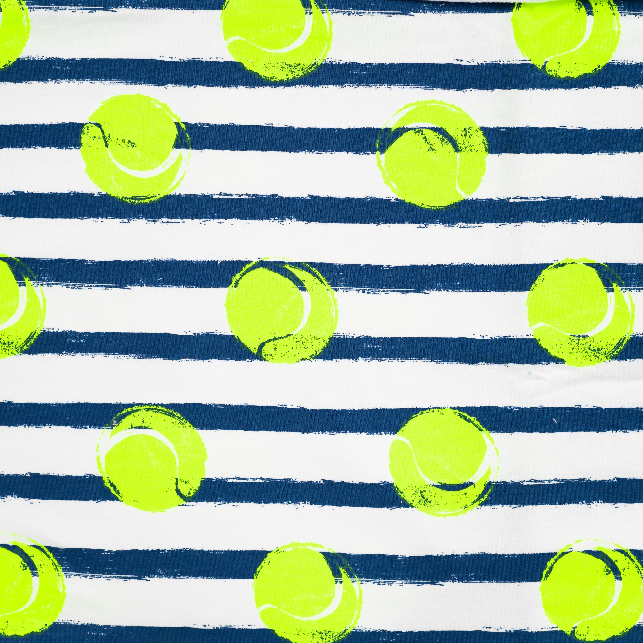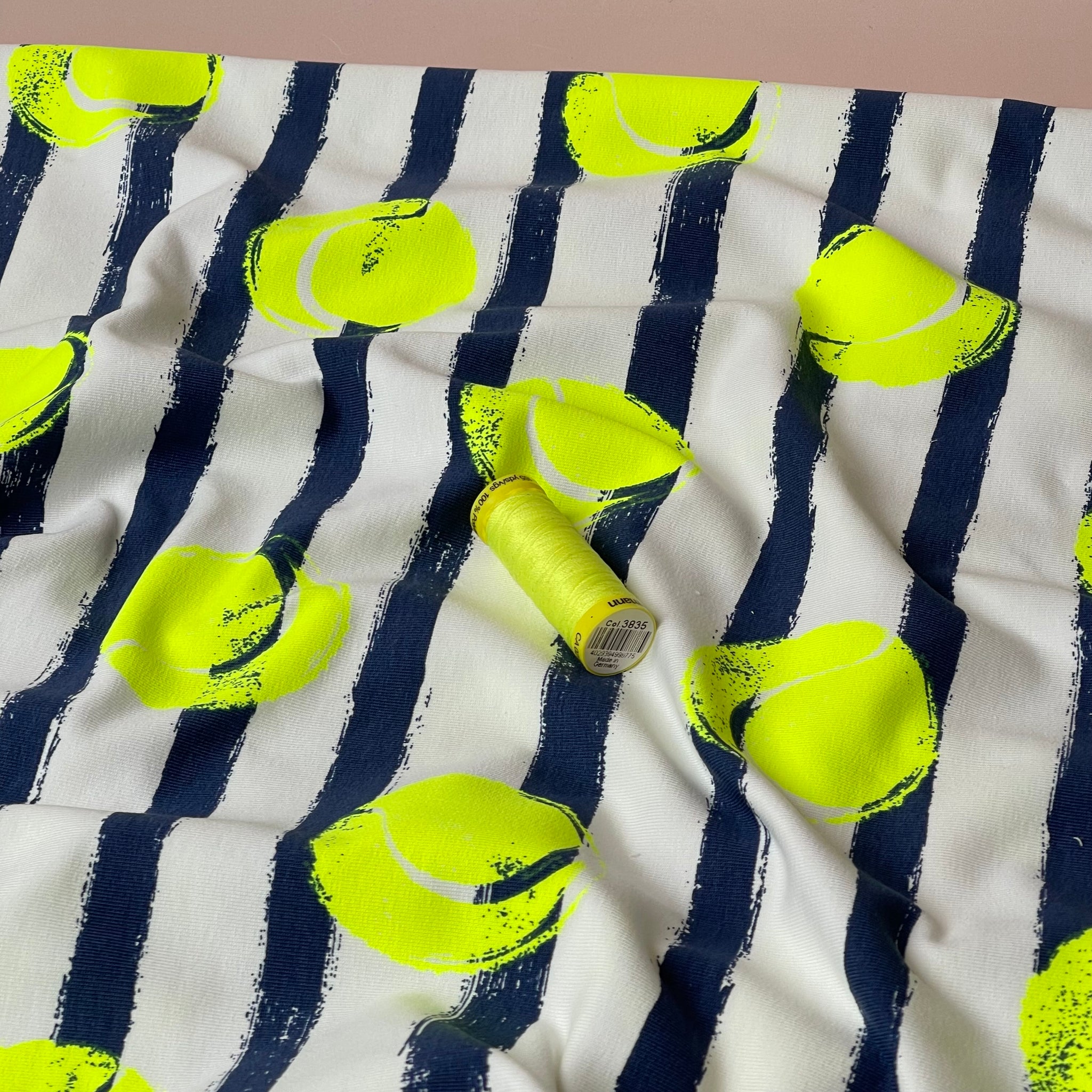 High quality cotton french terry fabric with looped back featuring tennis balls in neon yellow on a denim blue and off-white striped background. It will make a cosy, comfortable and elegant t-shirts, sweaters, hoodies, sweater dresses and joggers.