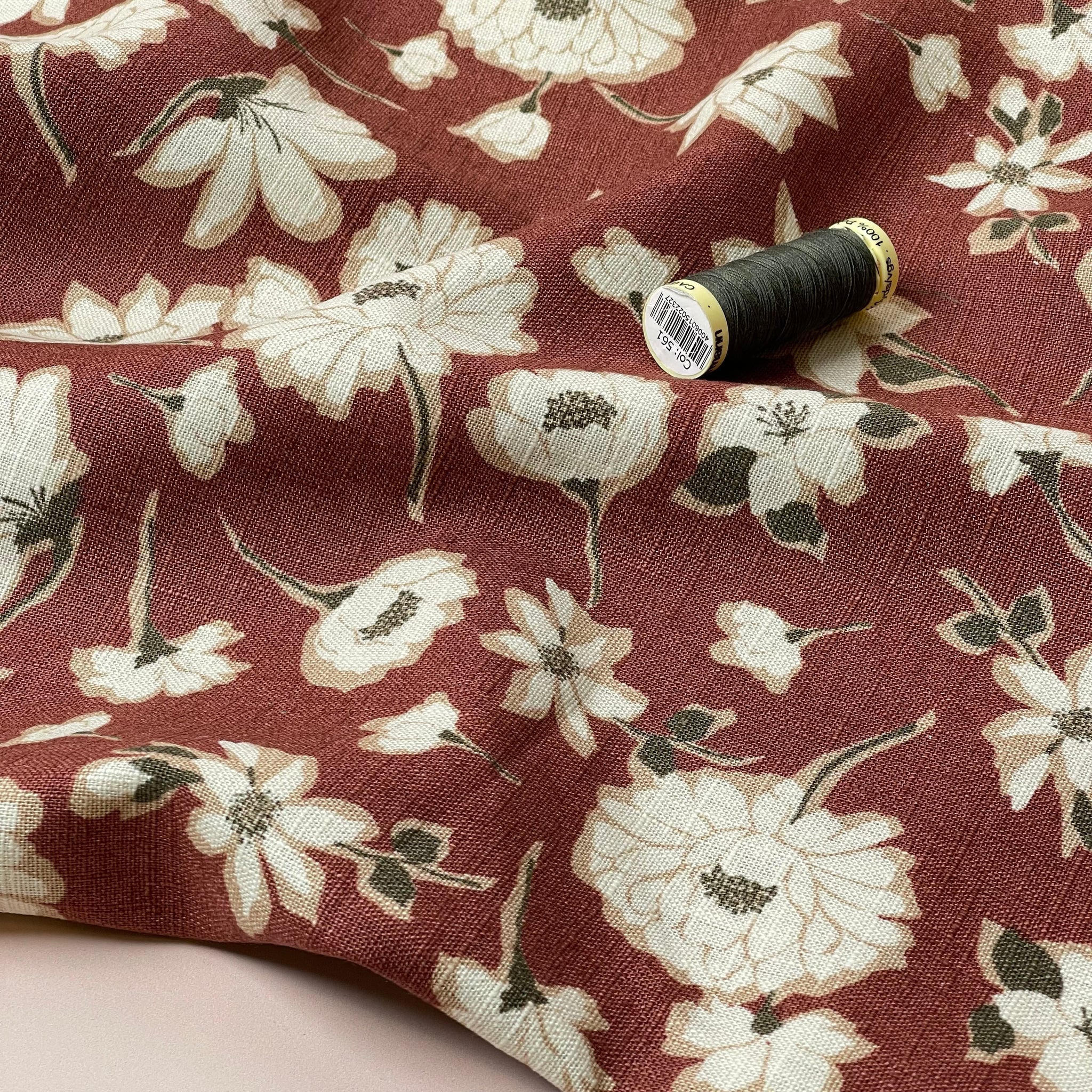 Peonies on Brick Red Washed Linen Cotton Blend Fabric