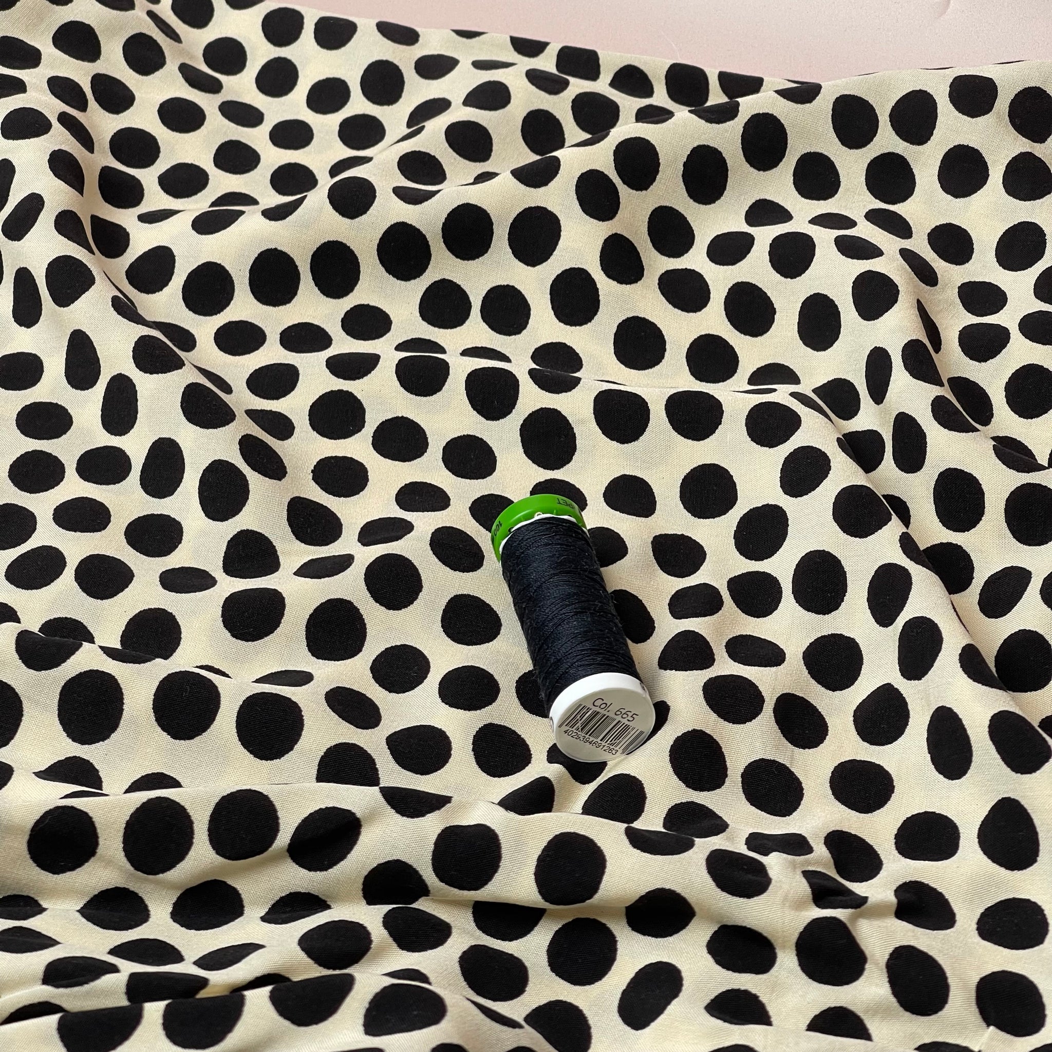 We are so pleased to be stocking this all time favourite, polka dot design on a viscose poplin fabric. The dots are black and slightly larger than classic dots on an ecru background, perfect for sewing blouses, swooshy dresses and loose trousers that can be worn all year round.