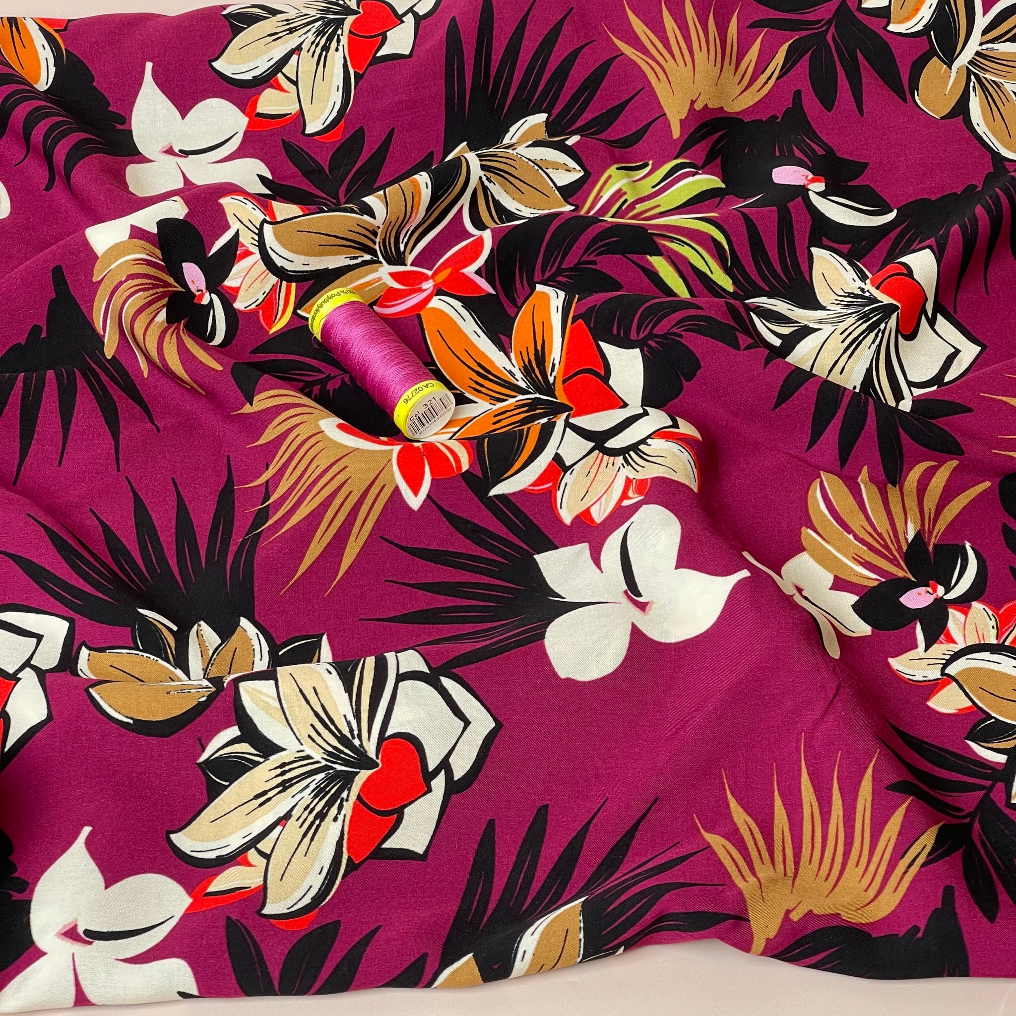This stunning viscose poplin fabric features tropical plants in black, orange and off-white on a dark magenta background. It is perfect for sewing blouses, swooshy dresses and loose trousers that can be worn all year round.