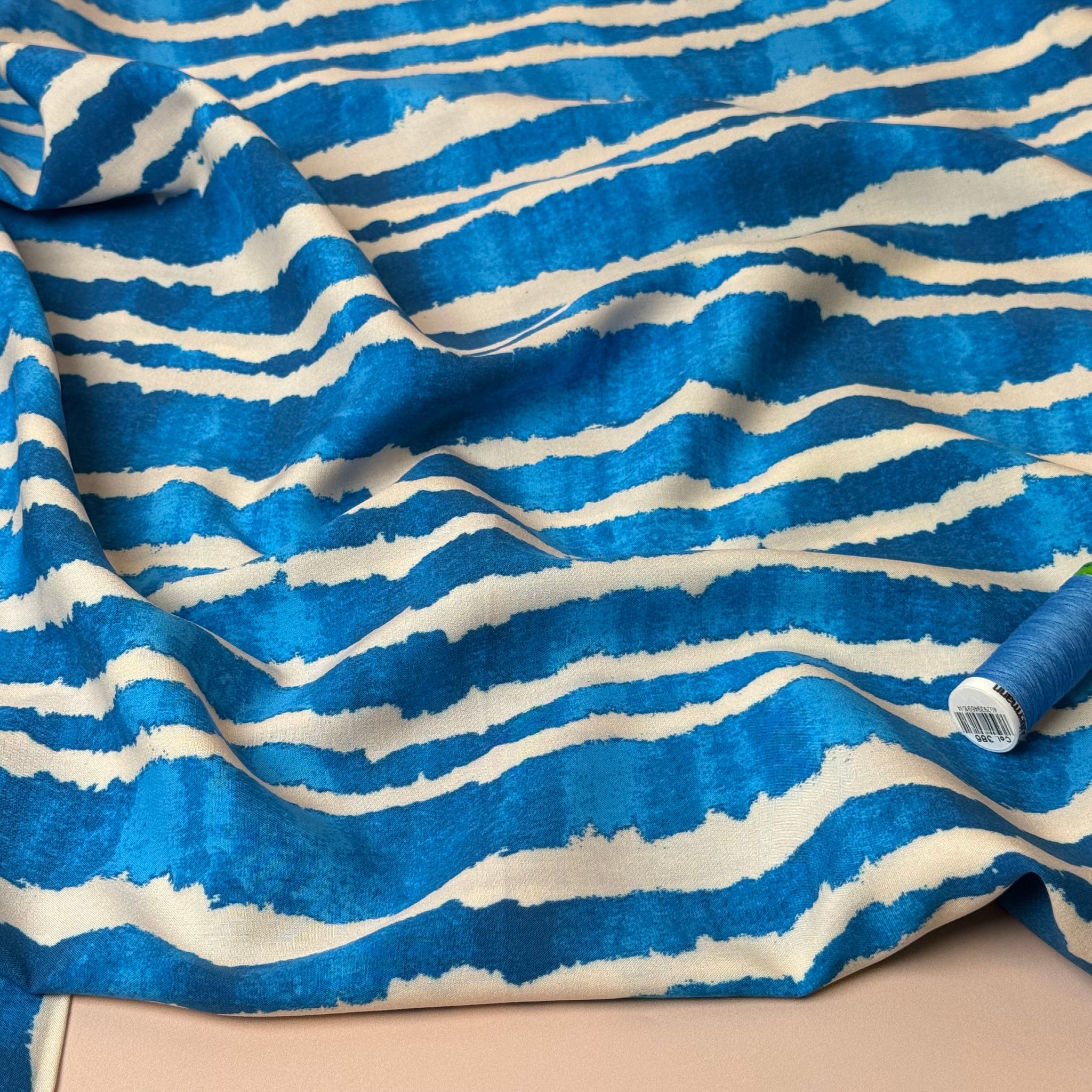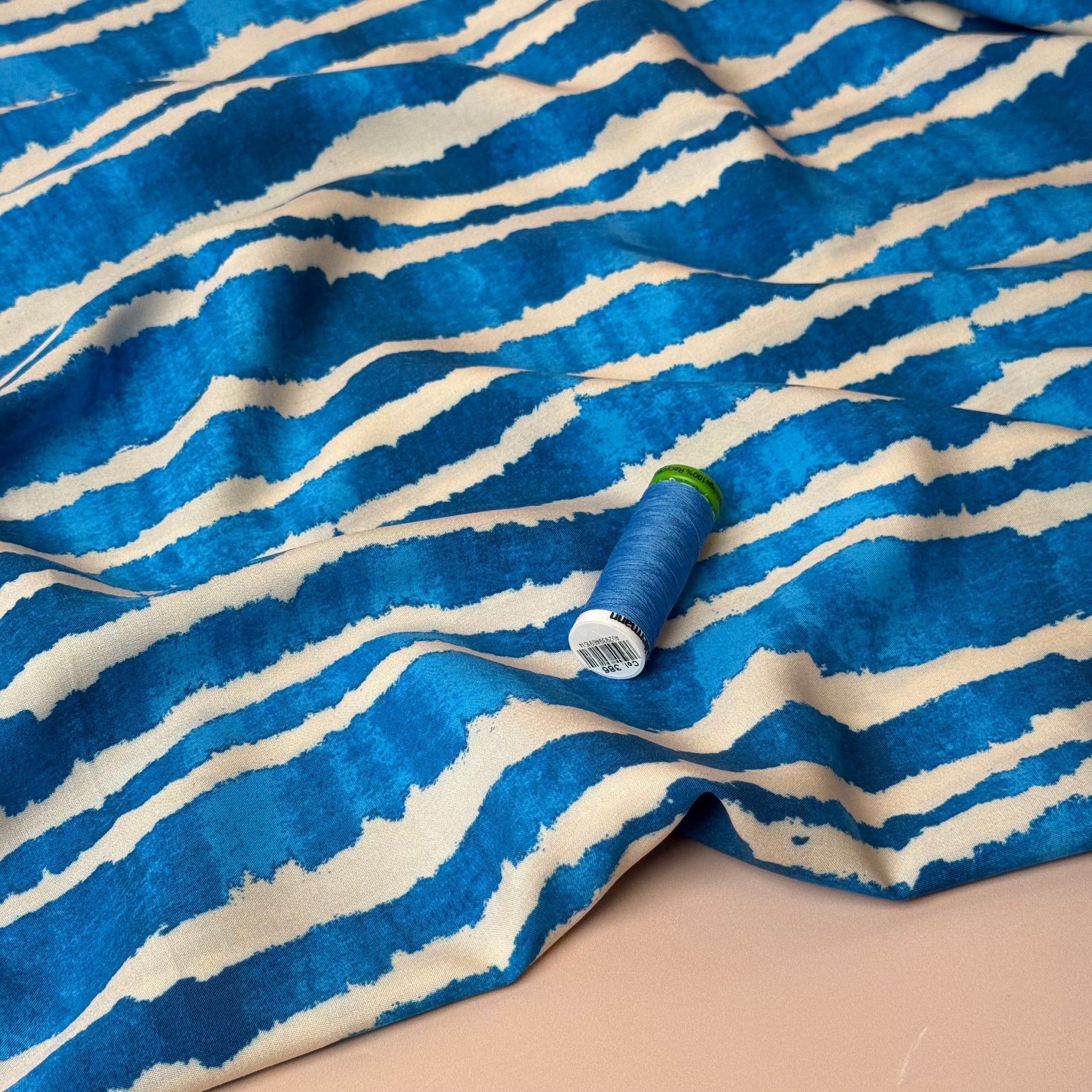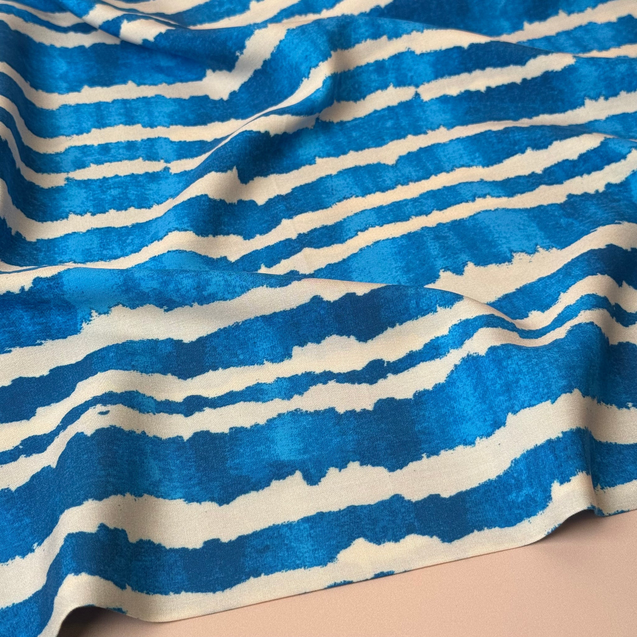 This stunning viscose poplin fabric with a stripe design in bright ocean blue shades and white is perfect for sewing blouses, swooshy dresses and loose trousers that can be worn all year round.