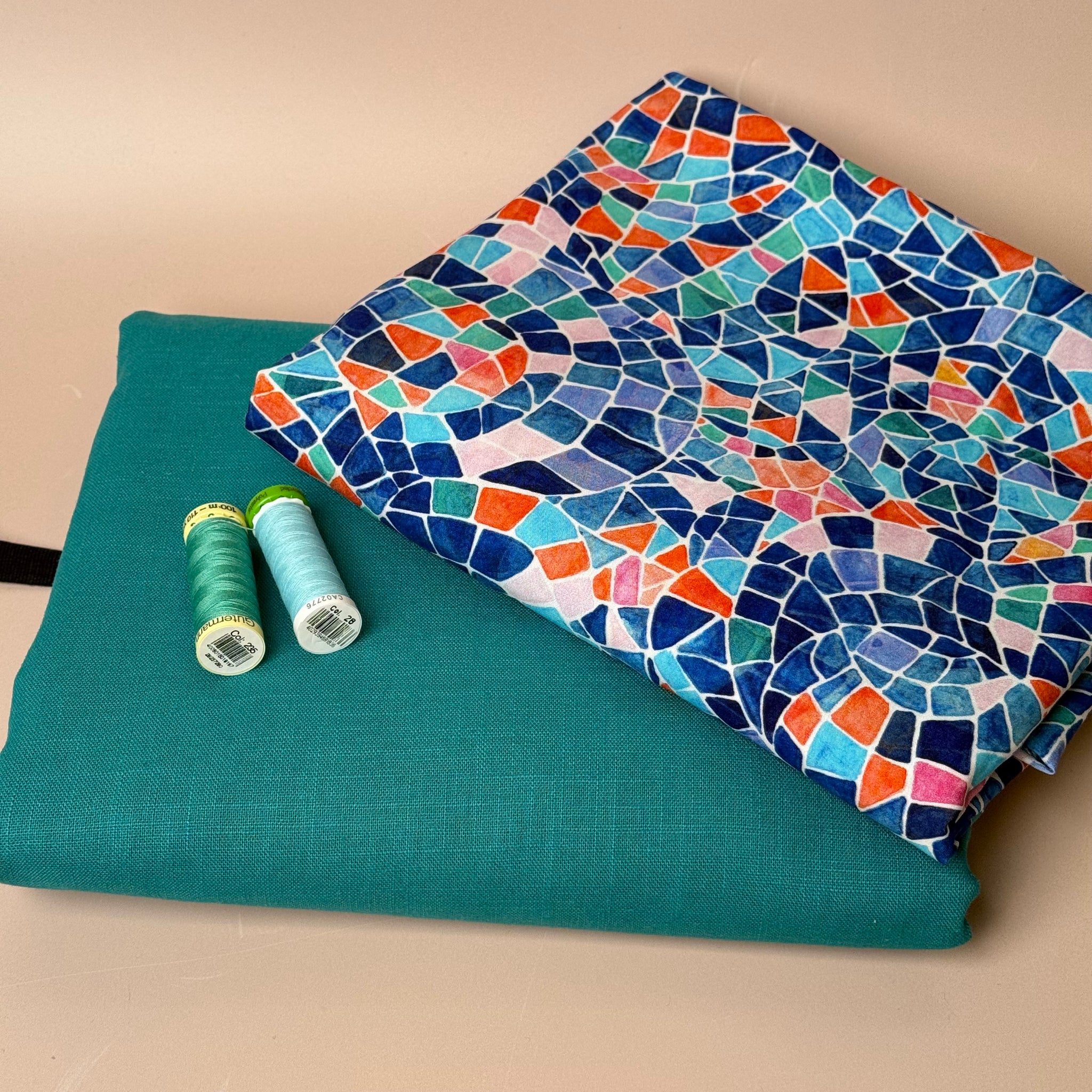 - 2.5m length of each plain linen and Mosaics viscose fabric