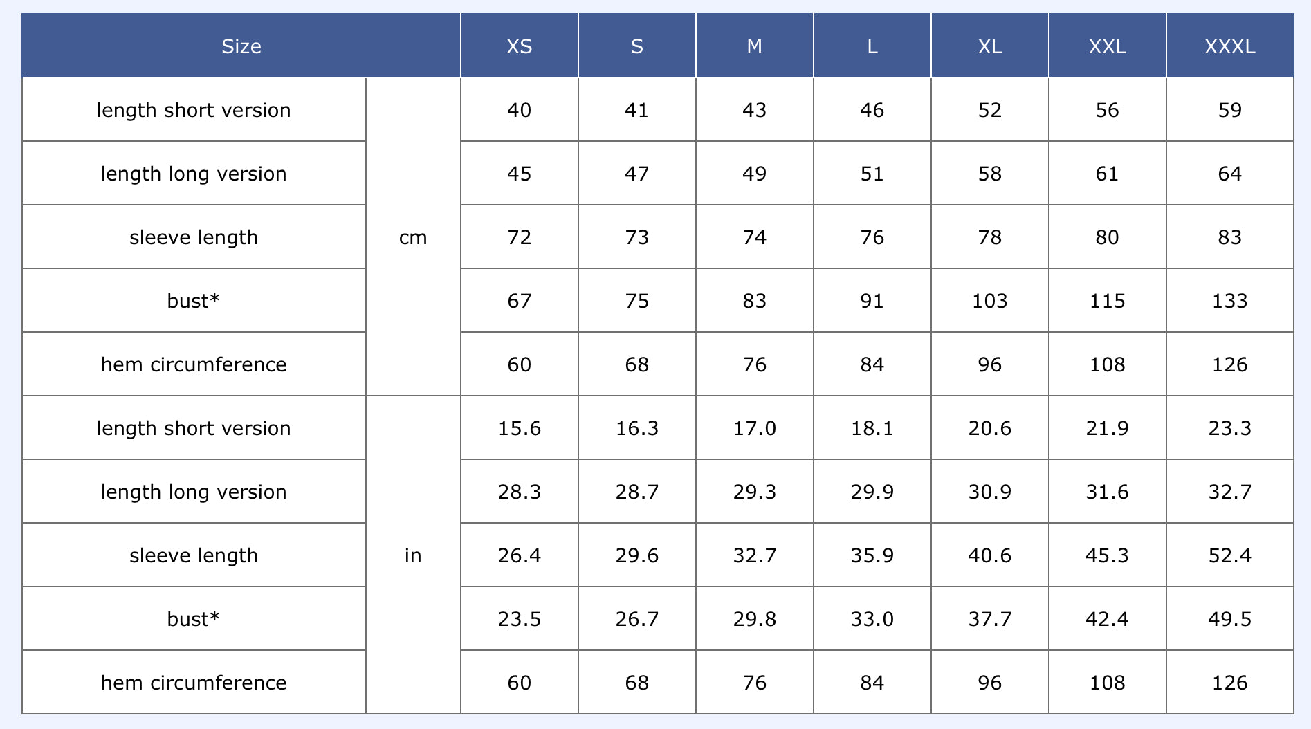Size chart:
