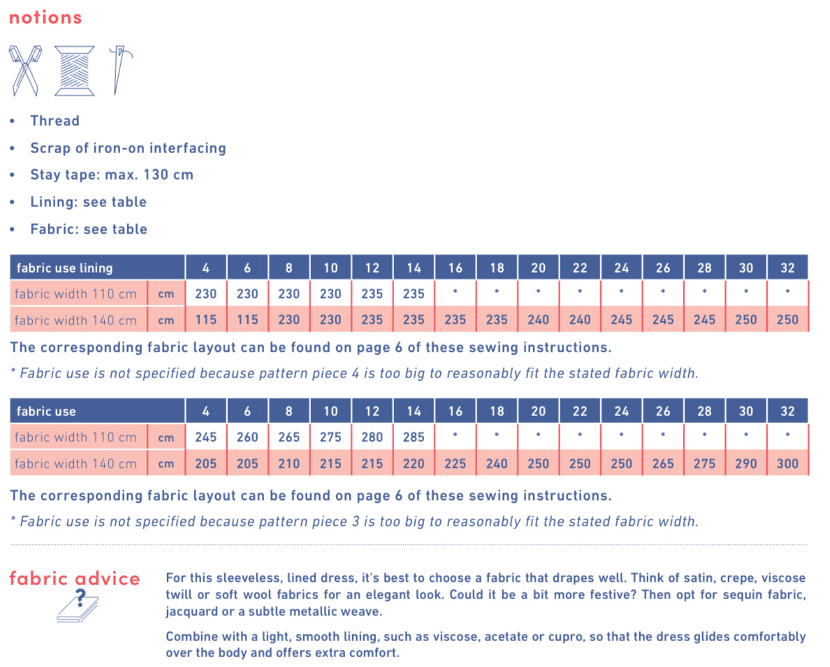 For this sleeveless, lined dress, it's best to choose a fabric that drapes well. Think of satin, crepe, viscose Combine with a light, smooth lining, such as viscose, acetate or cupro, so that the dress glides comfortably over the body and offers extra comfort.