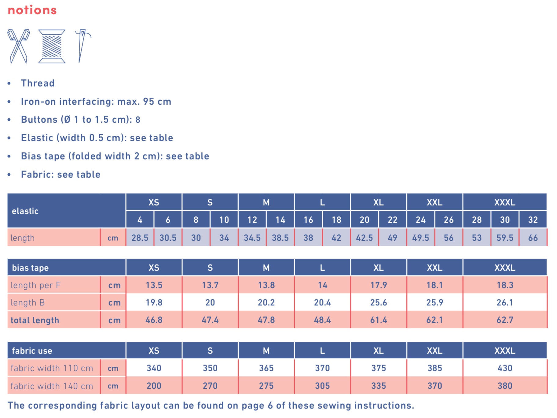 For Milena with its twist detail, supple fabrics such as viscose crepe, lyocell or cupro work beautifully. They create an elegant drape and are wonderfully comfortable to wear. If you want the garment to hold its shape better, try poplin, chambray, fine corduroy or lightweight denim. Both plain and printed versions look fantastic in this design.