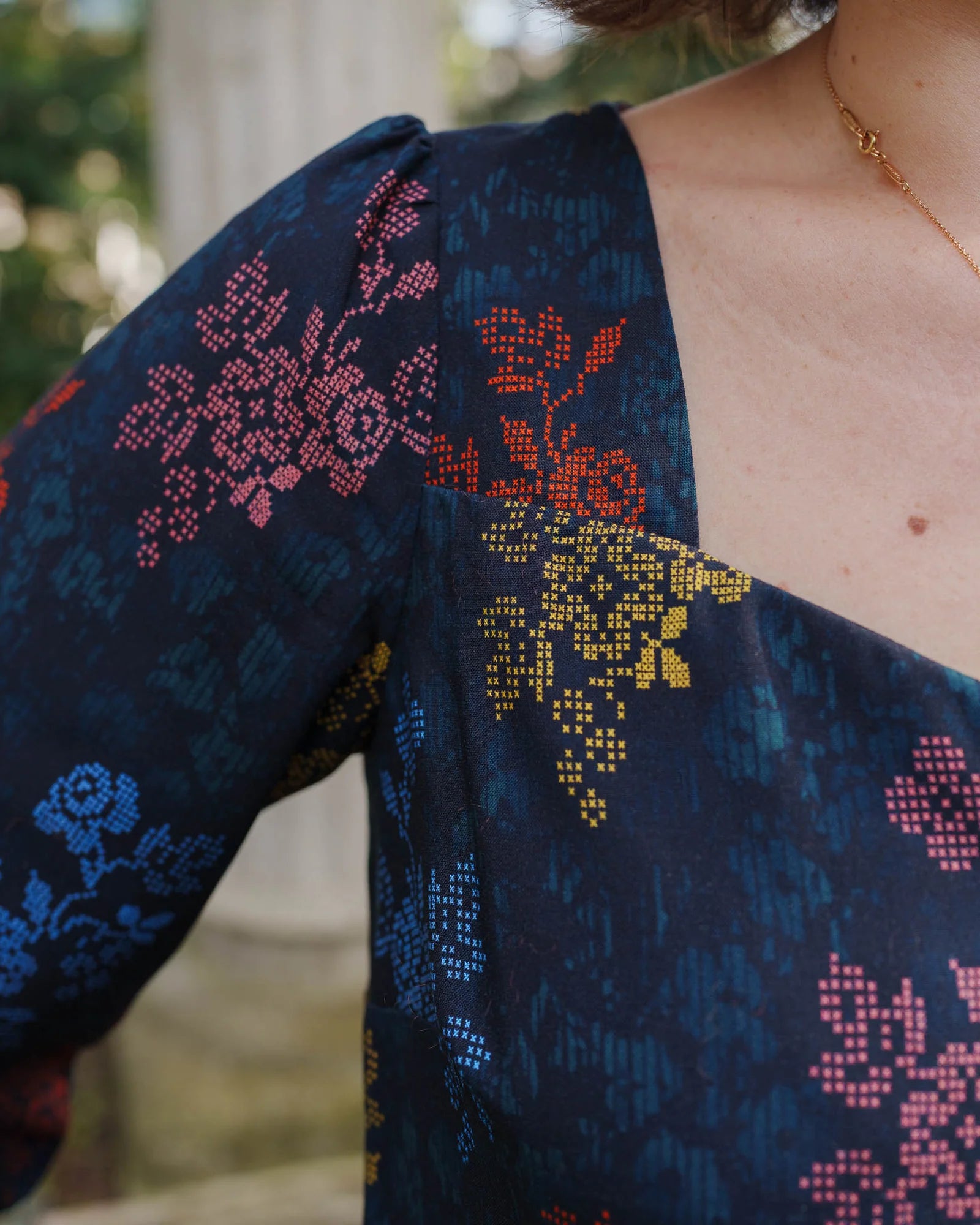 Mara combines simplicity and charm thanks to its lovely, carefully considered details. Its sweetheart neckline is supported by wide straps, and its buttoned front is fully lined: an elegant and practical finish. The puffed sleeves, gathered at the top and fitted at the bottom, add a touch of soft retro charm.