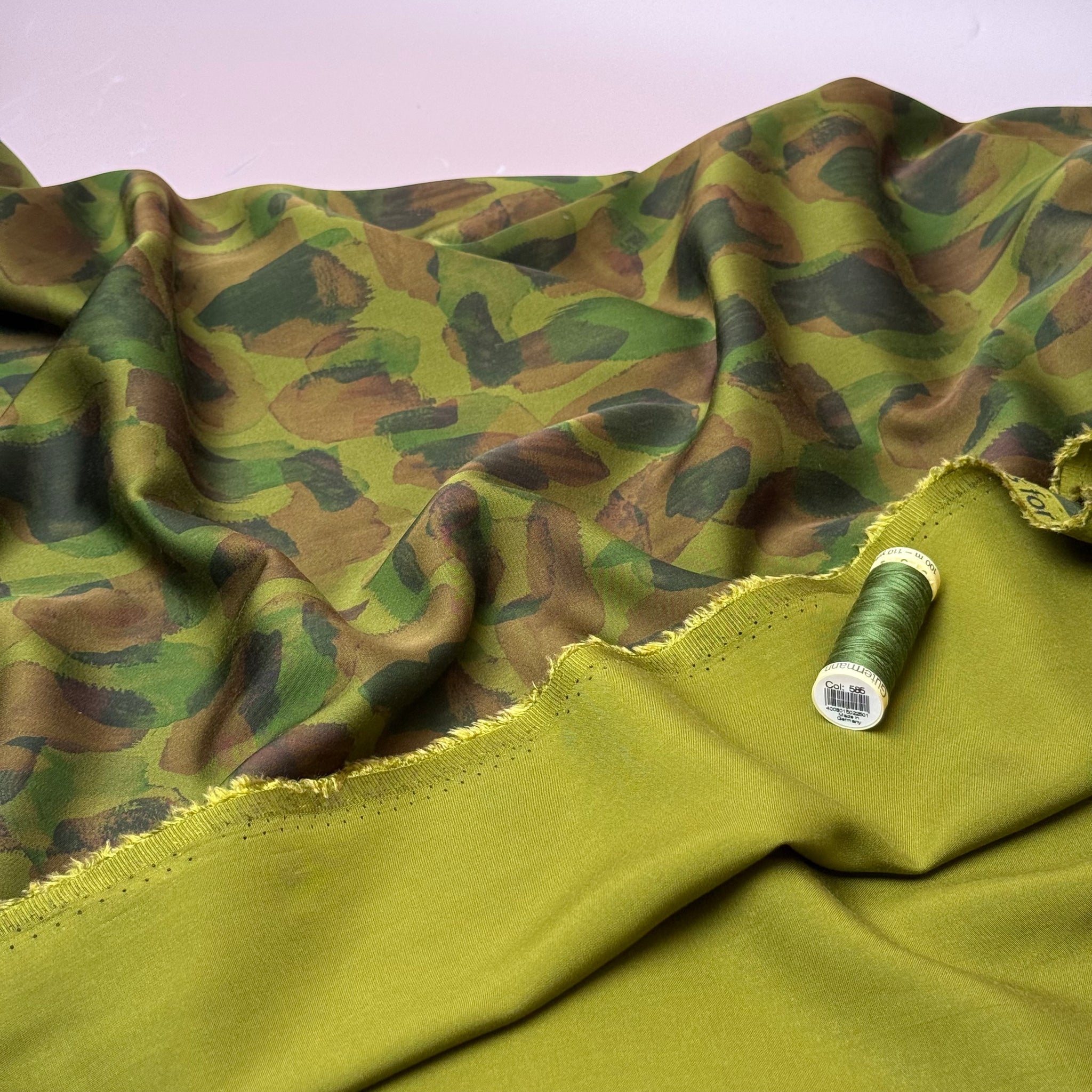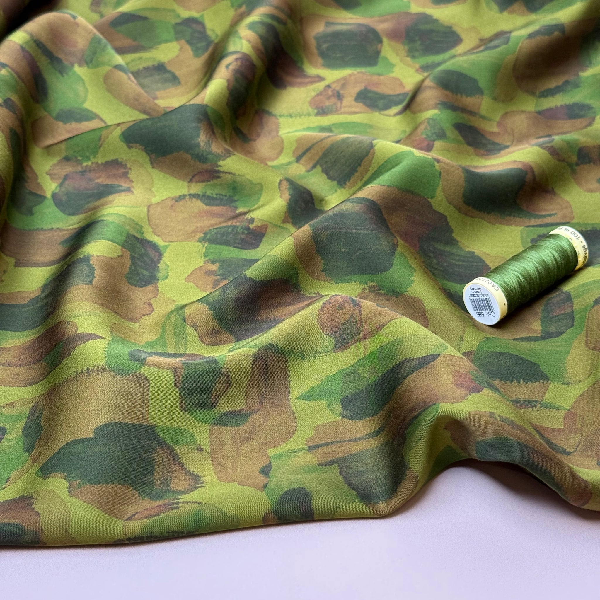 This stunning viscose sateen fabric features watercolour patches design in brown and green on khaki green background. This fabric is printed on a khaki dyed base, so the reverse side is coloured. It is lightweight and has the most pleasant handle, with smooth matte finish and beautiful drape.