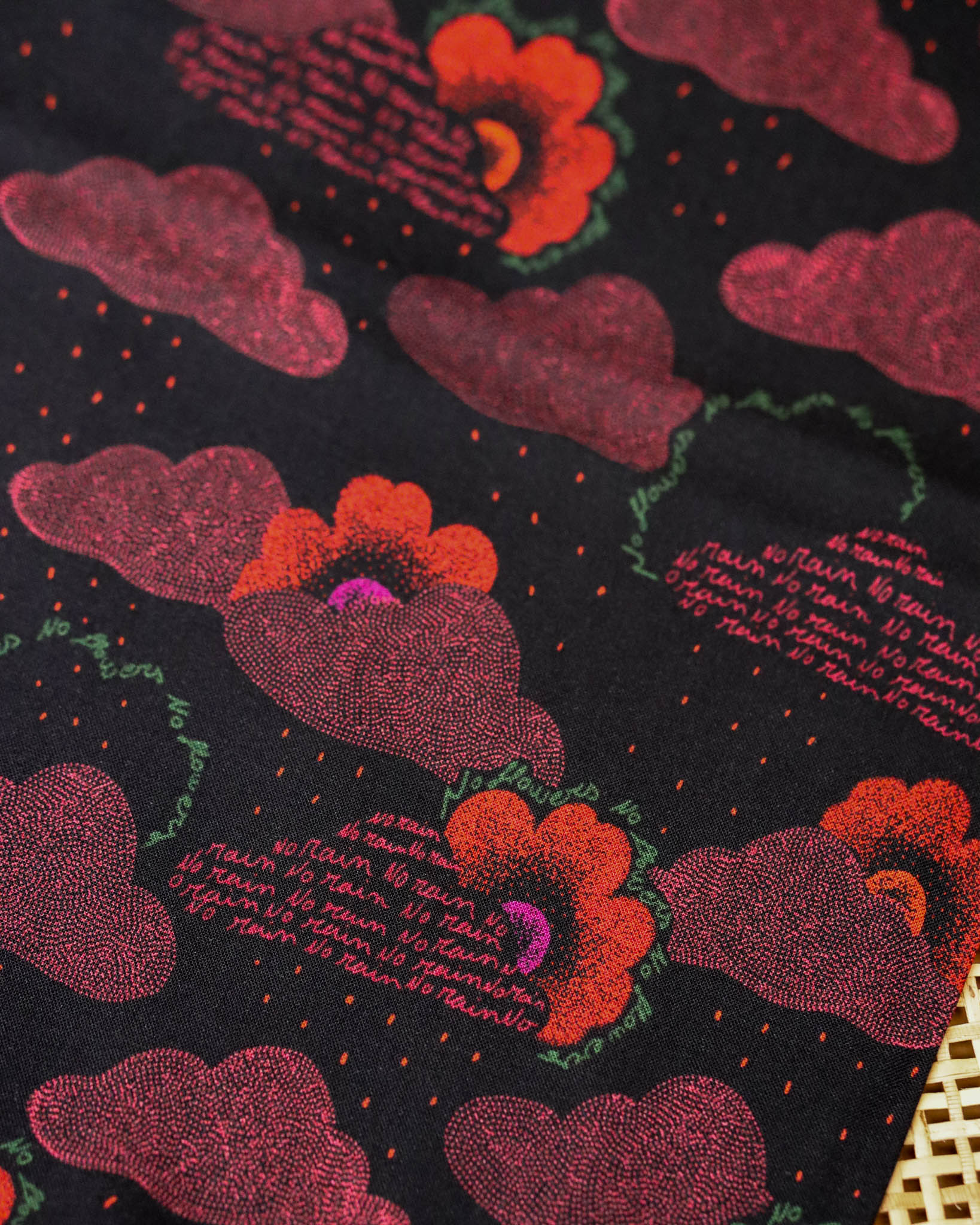 Part of the No Rain No Flowers collection, Celestial viscose features clusters of scattered dots form clouds shaped from the motto “No Rain No Flowers”, while red blooms emerge from the darkness.