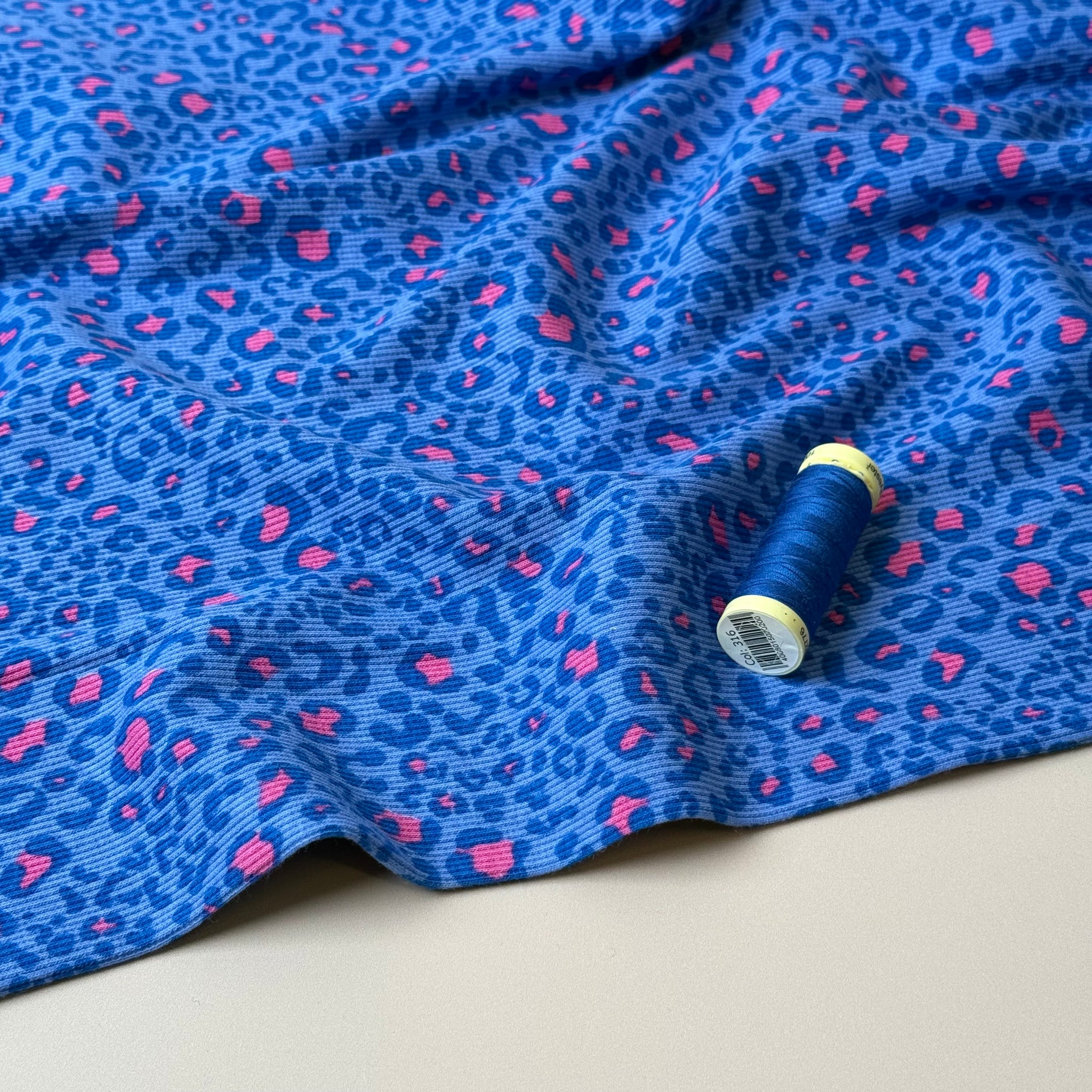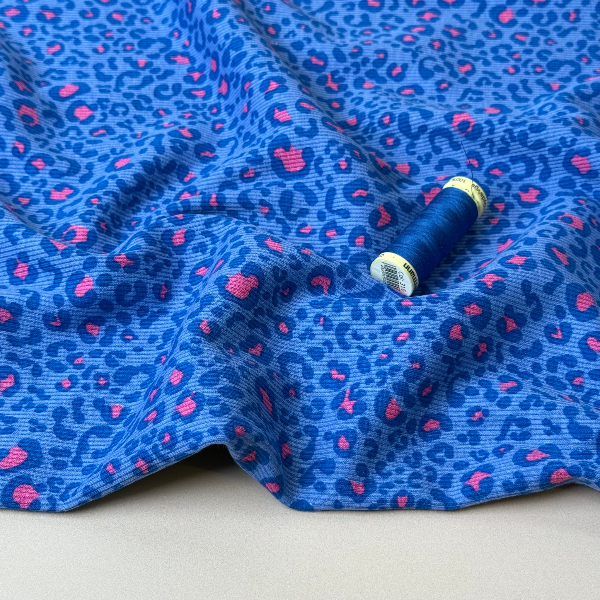 This Ribbed Jersey is a lightweight ribbed knit fabric with the soft stretch and good recovery and features small animal print in blue and pink on a cobalt background.