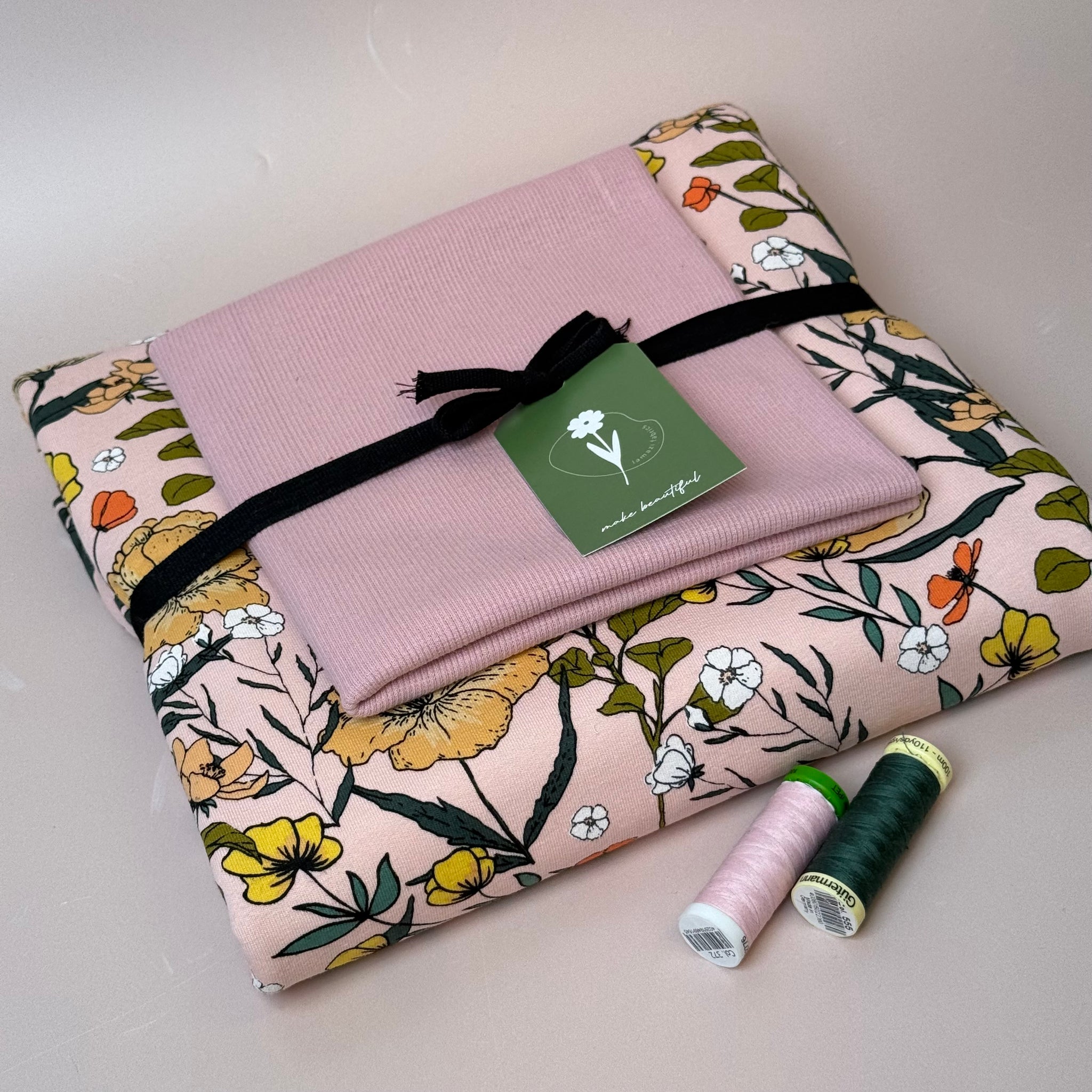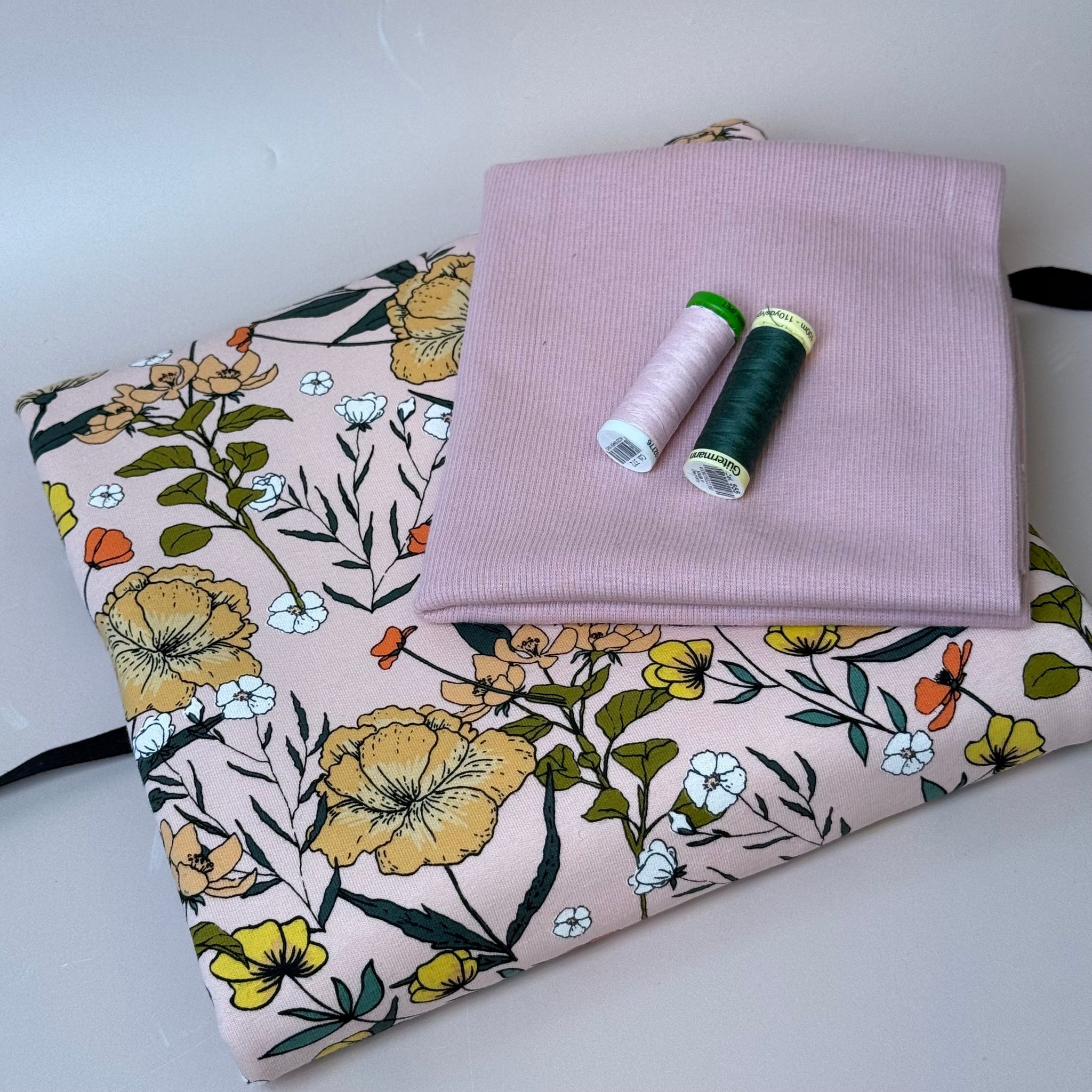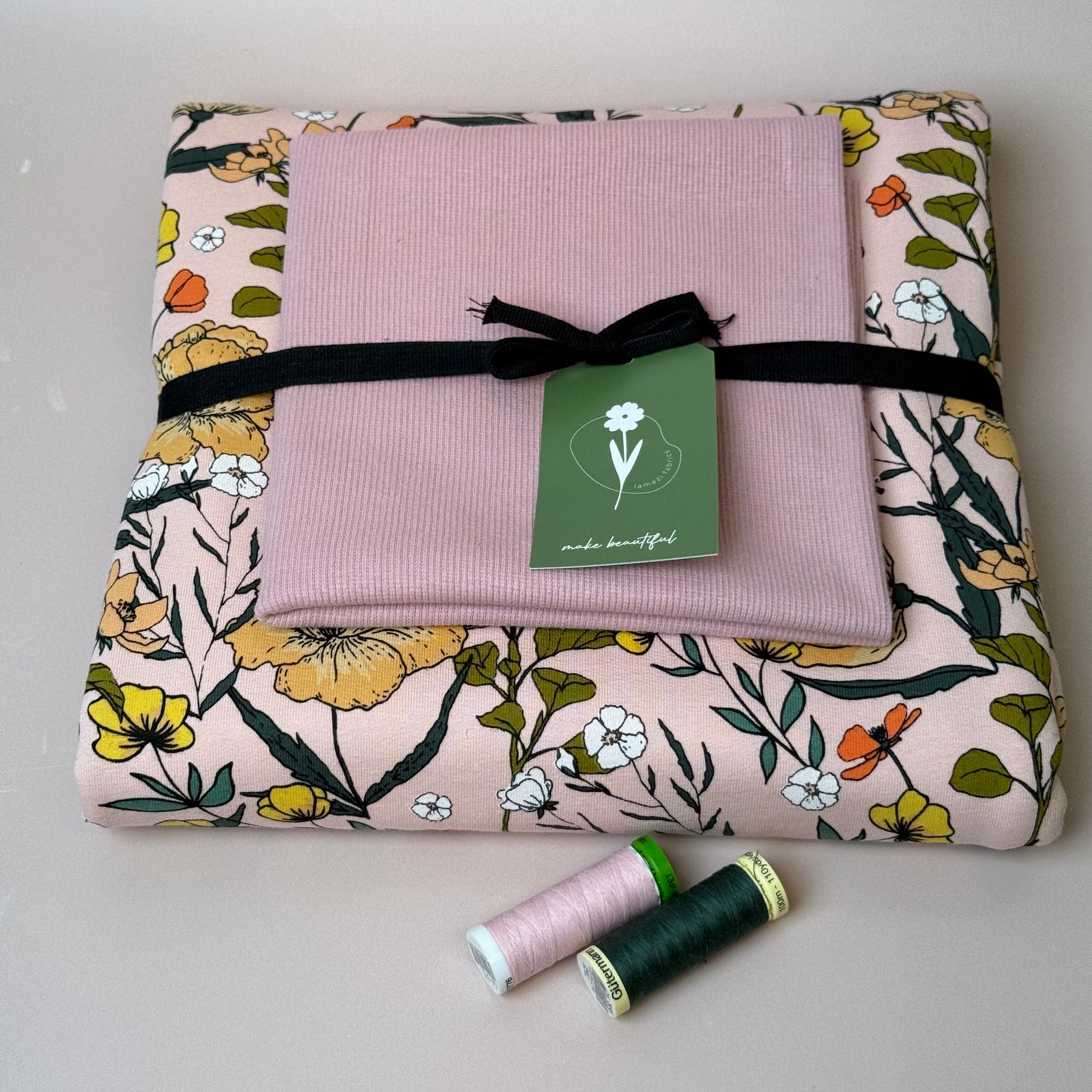 Presented in complementary and perfectly matching colours of our popular fabrics, in this bundle we paired this stunning soft and cuddly See You At Six Summer Flowers Peachskin  French Terry with the matching ribbing.