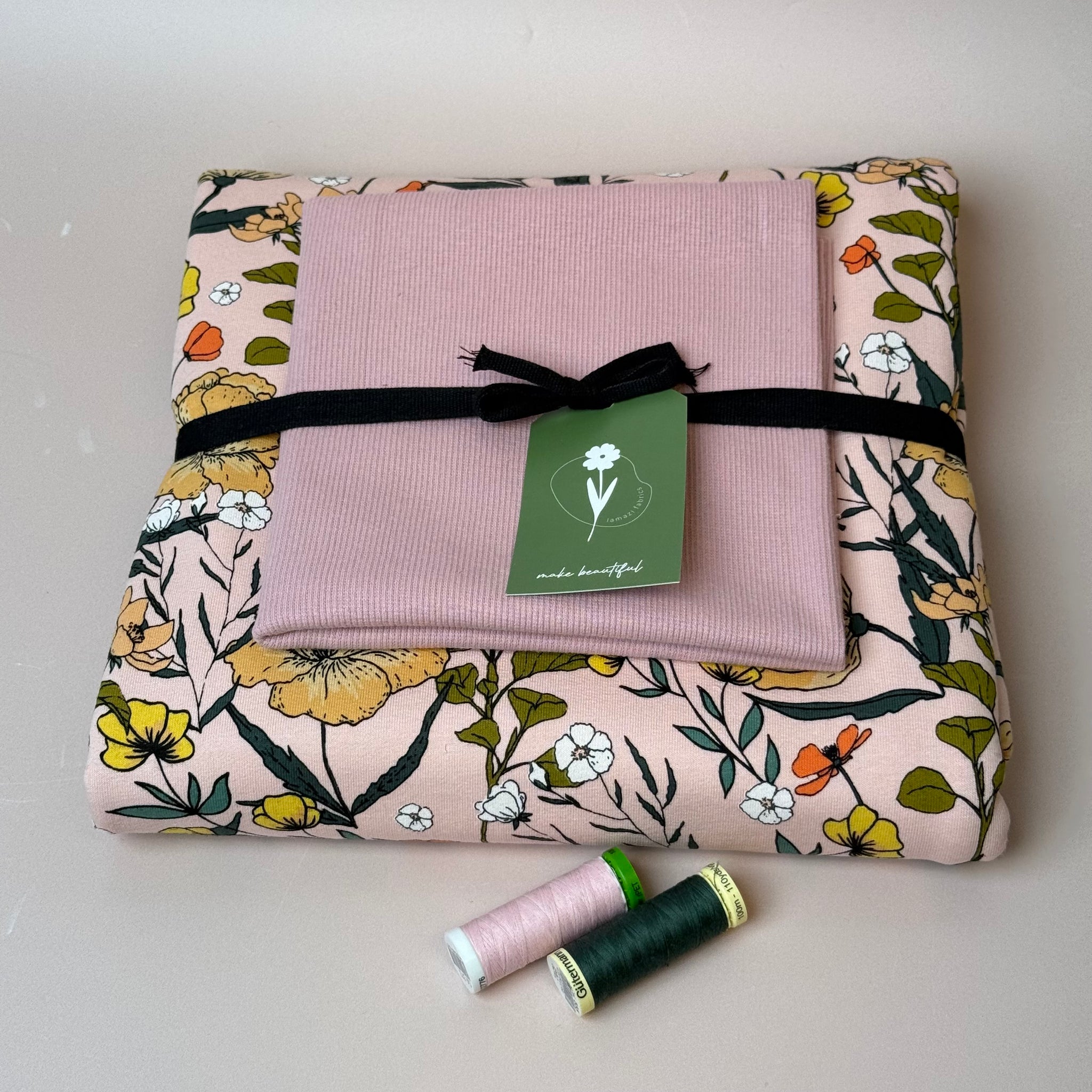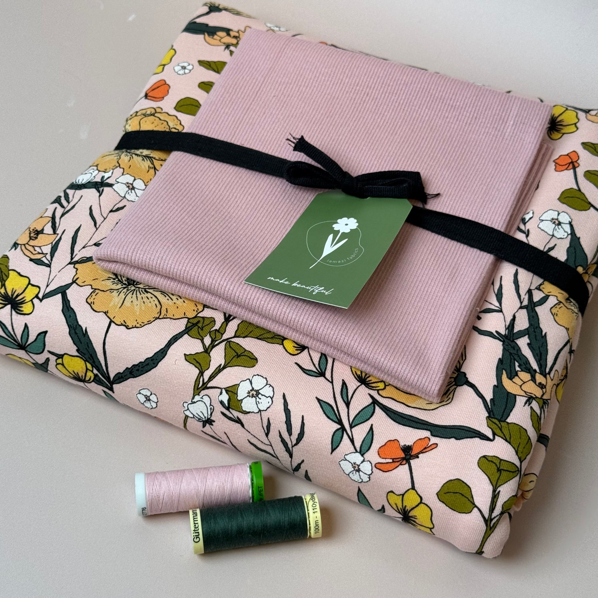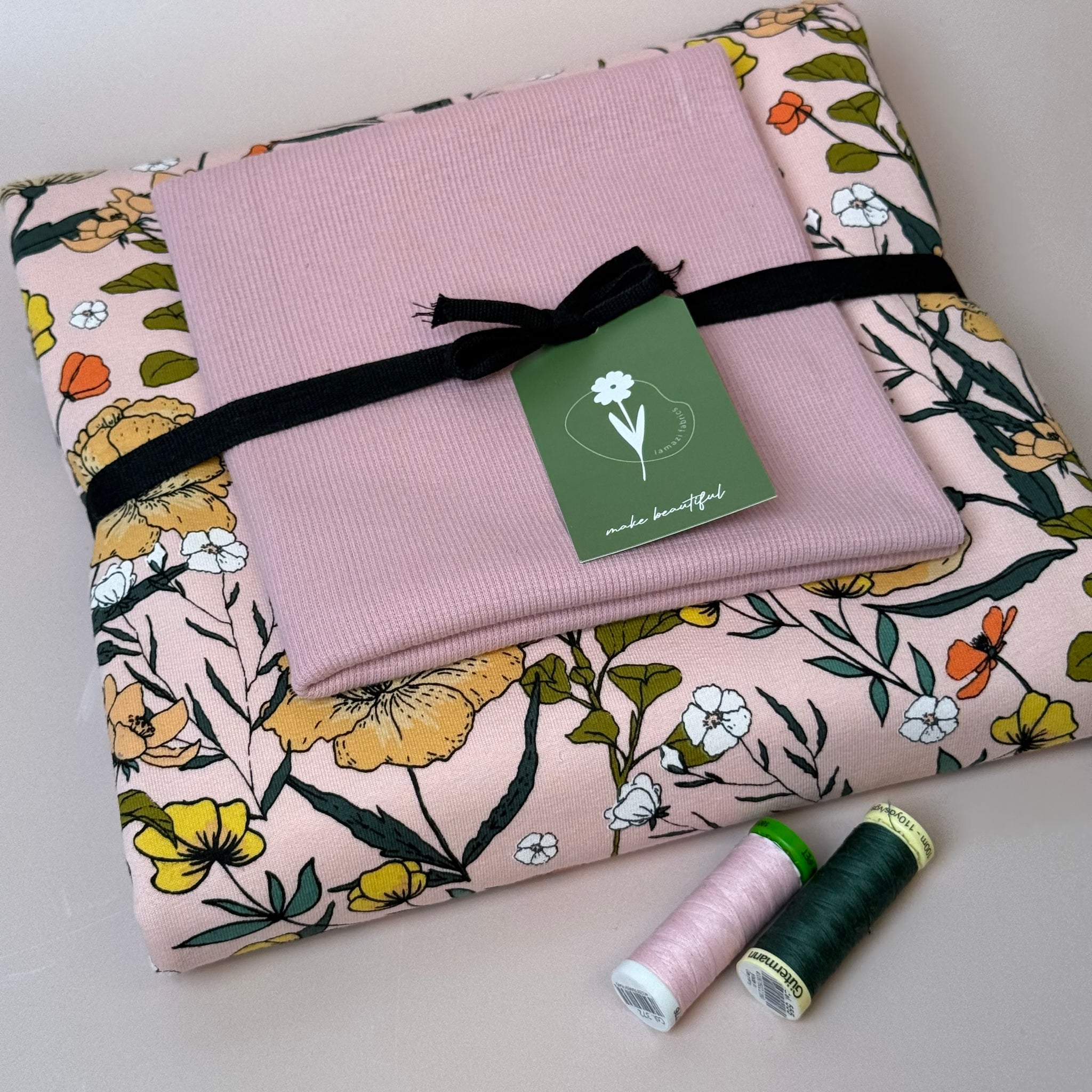 Presented in complementary and perfectly matching colours of our popular fabrics, in this bundle we paired this stunning soft and cuddly See You At Six Summer Flowers Peachskin  French Terry with the matching ribbing.