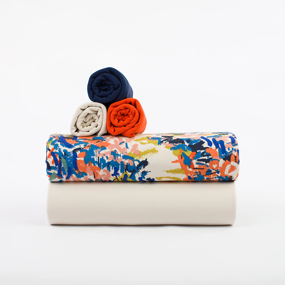 This ribbing is dyed to perfectly match with See You At Six French Terry Fabrics in tofu Beige colour. It also blends well with the rest of the See You At Six collections. You will need just a little quantity to use for cuffs, collars and colour blocking or make a complete garment as part of the set.