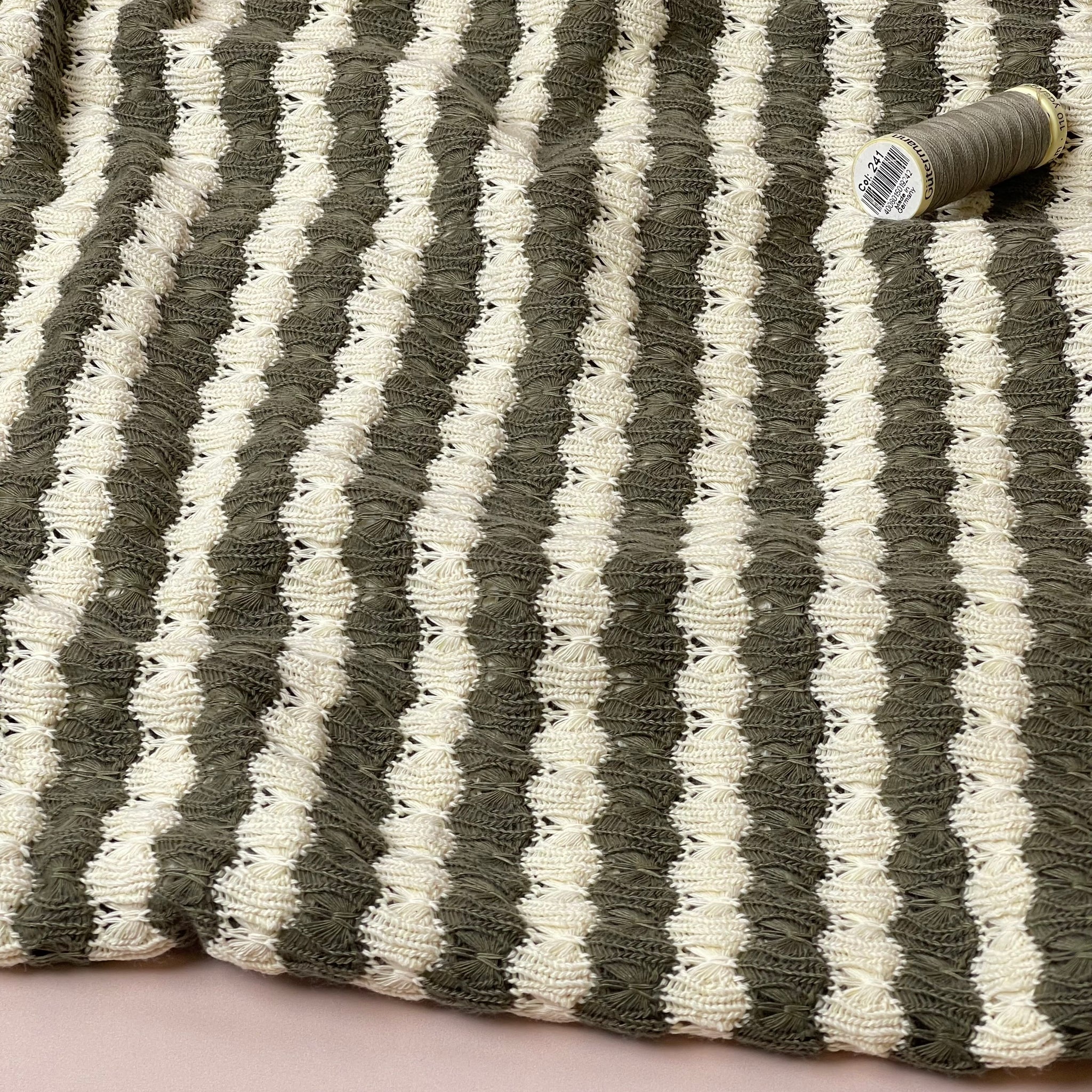 This unique, beautiful and soft summer knitted fabric is ideal for making breathable knitted summer tank tops and t-shirts or dresses. Featuring jacquard striped knit in olive green and off-white, it is ideal for sewing summer tops, cardigans and coverups. Stripes run horizontally on this fabric.