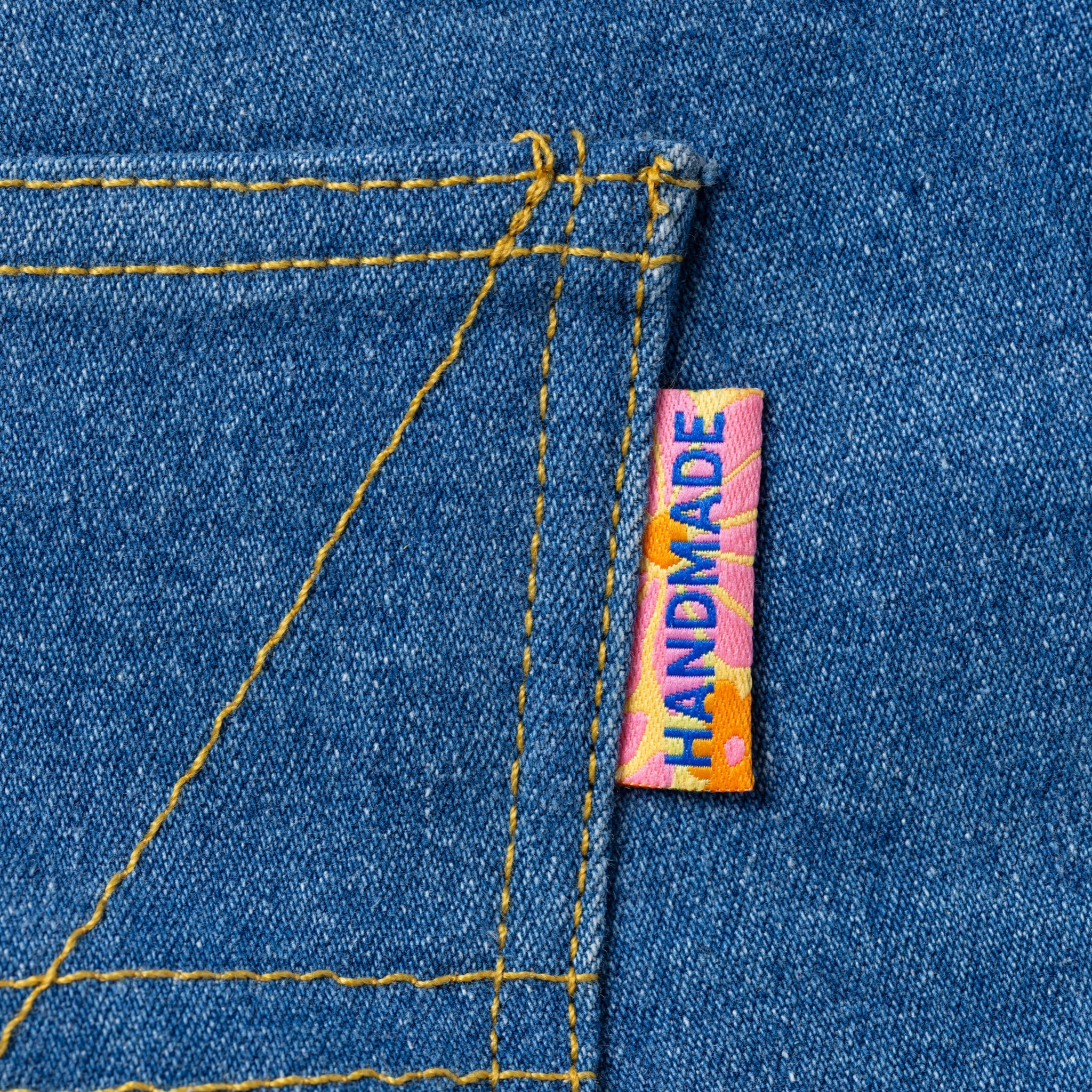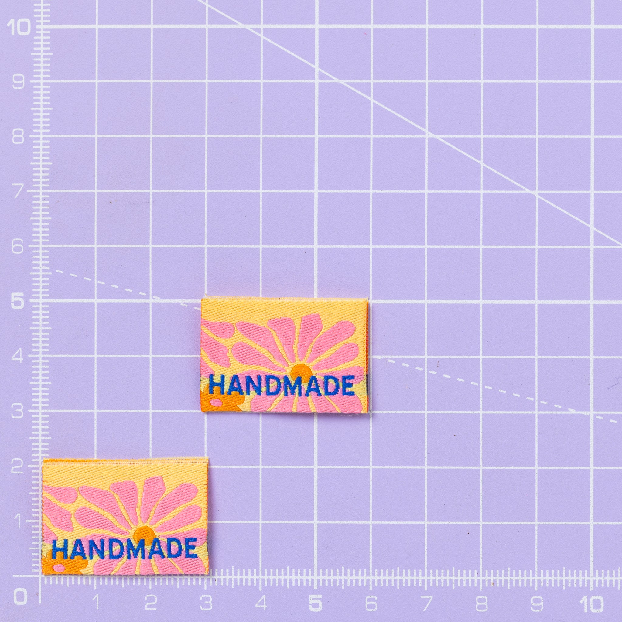 Elevate your handmade creations with our Handmade label. ‘Handmade’ woven in a navy thread on a yellow background with pink and orange flowers.