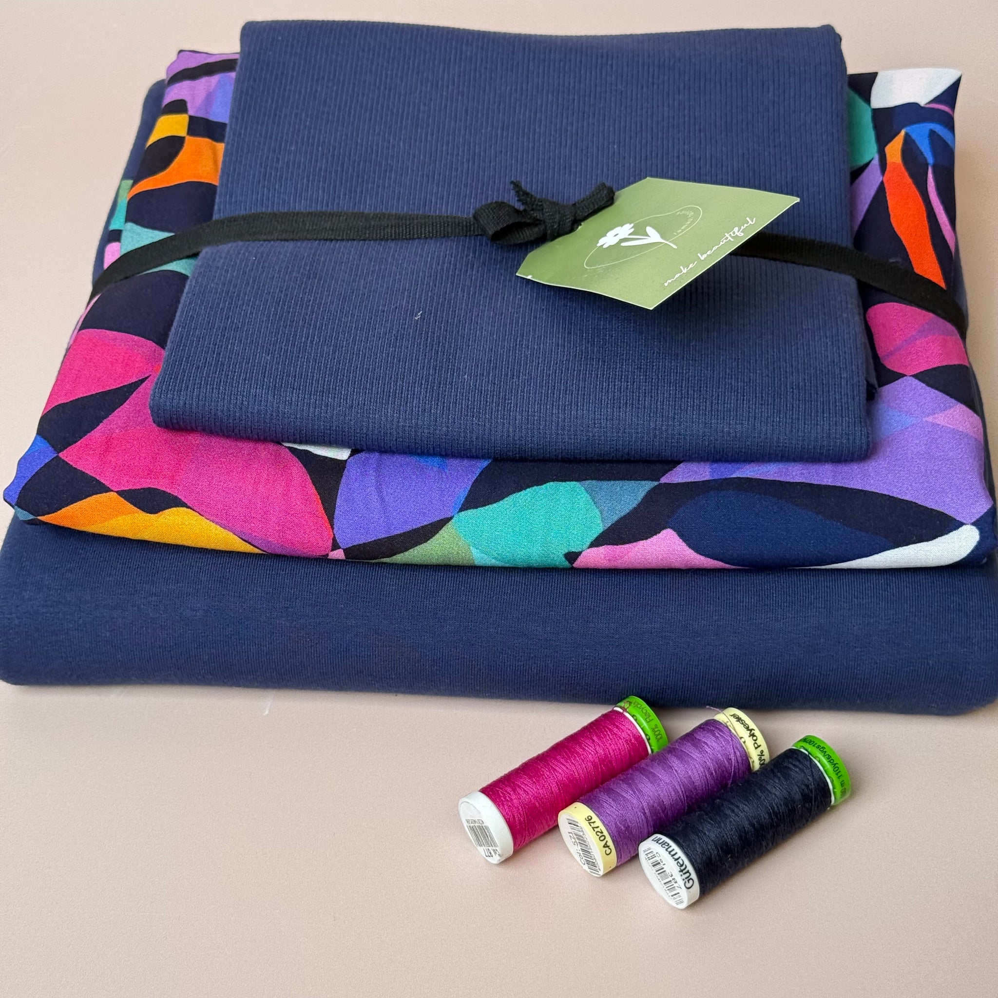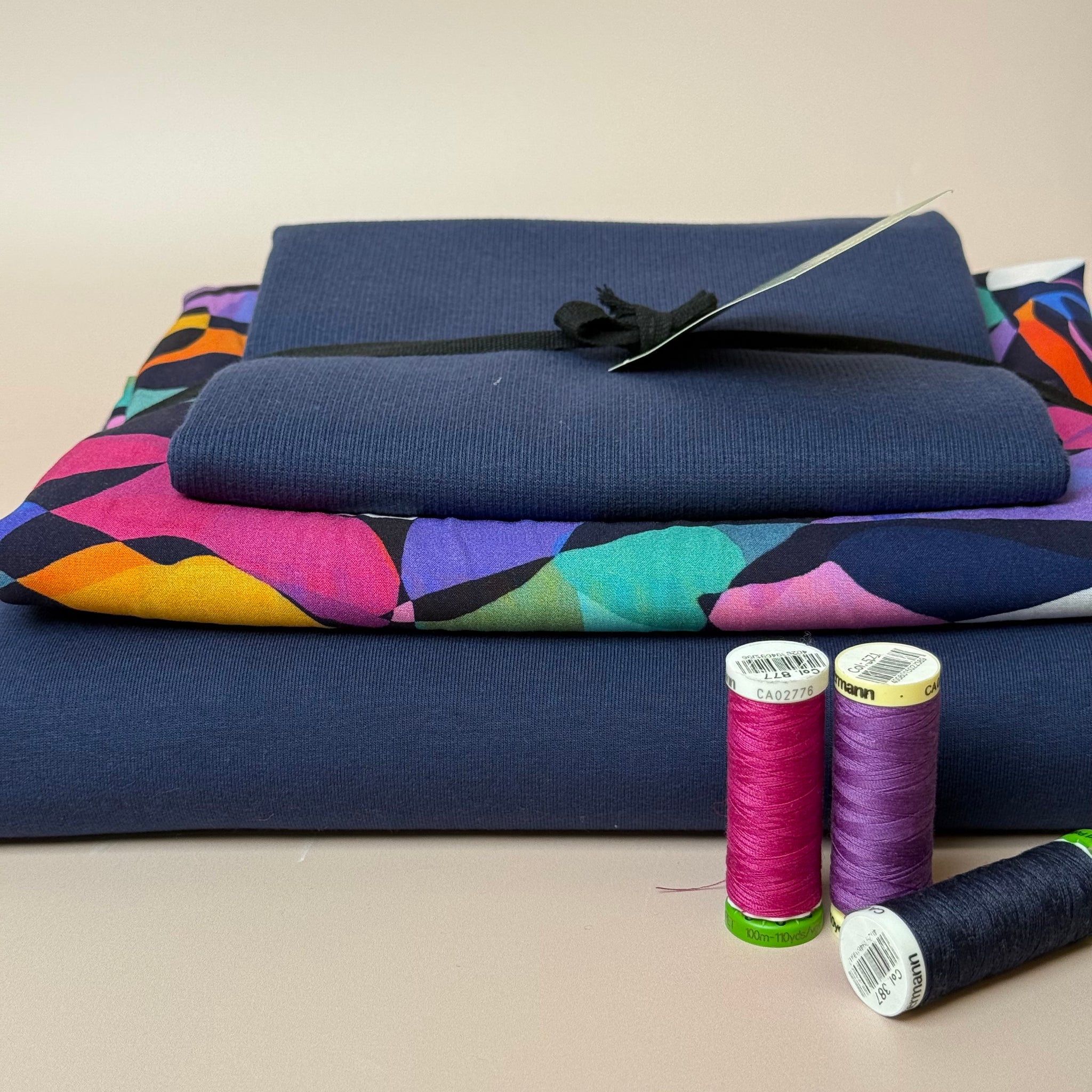 In this bundle we chose one of our own exclusive prints on the finest viscose and matched it with the soft and squishy See You At Six cotton Sweat-shirting and matching ribbing in Oceana Blue. They make a beautiful bundle together and are of the finest quality in our collection.