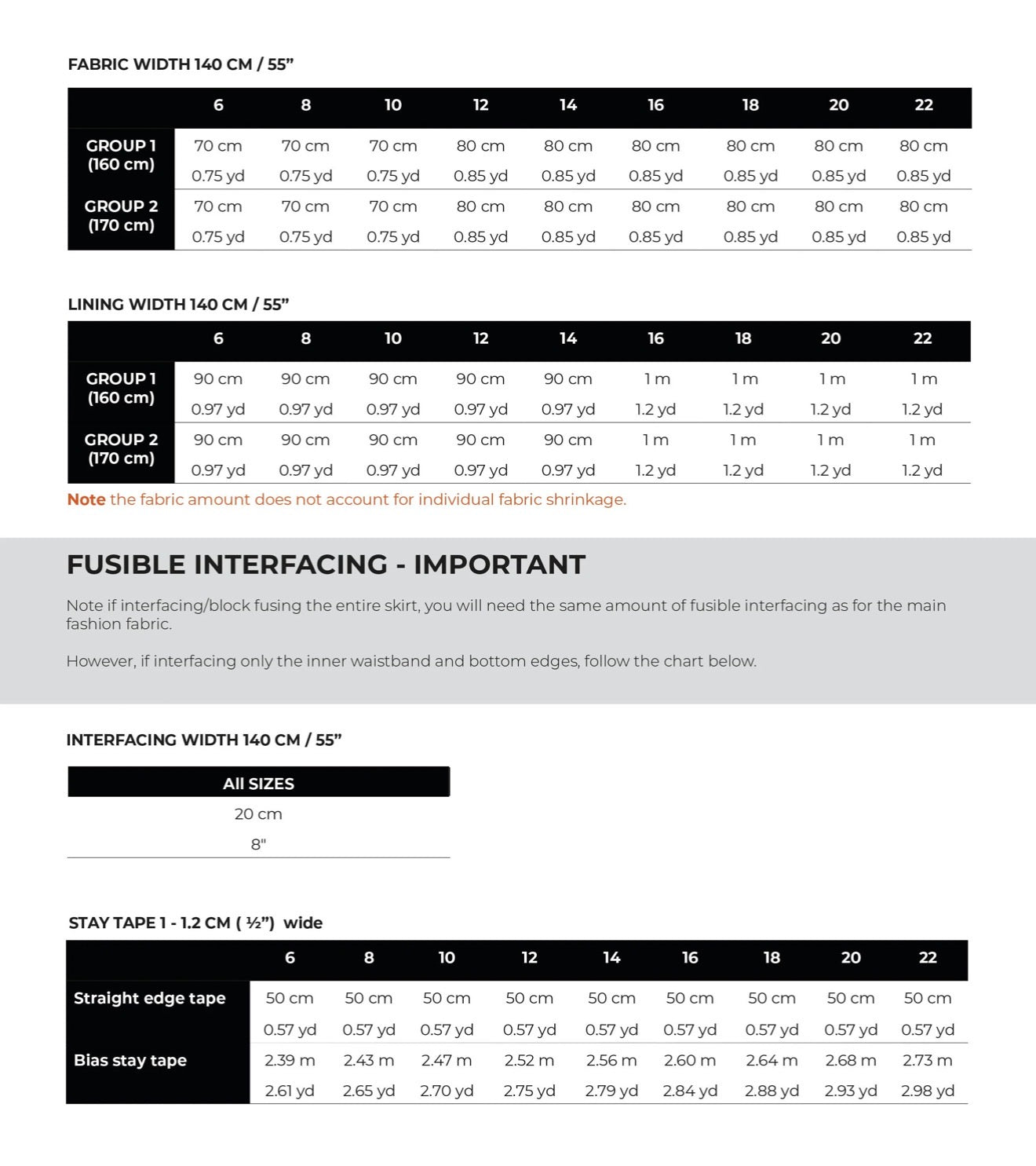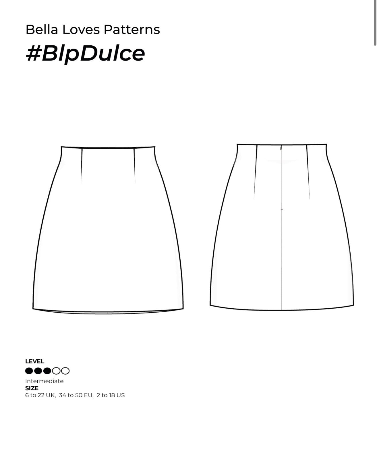 - Bella Loves Patterns Dulce skirt for sizes 6-22 (waist 64-96cm) printed A0 pattern sheets and printed coloured instructions.