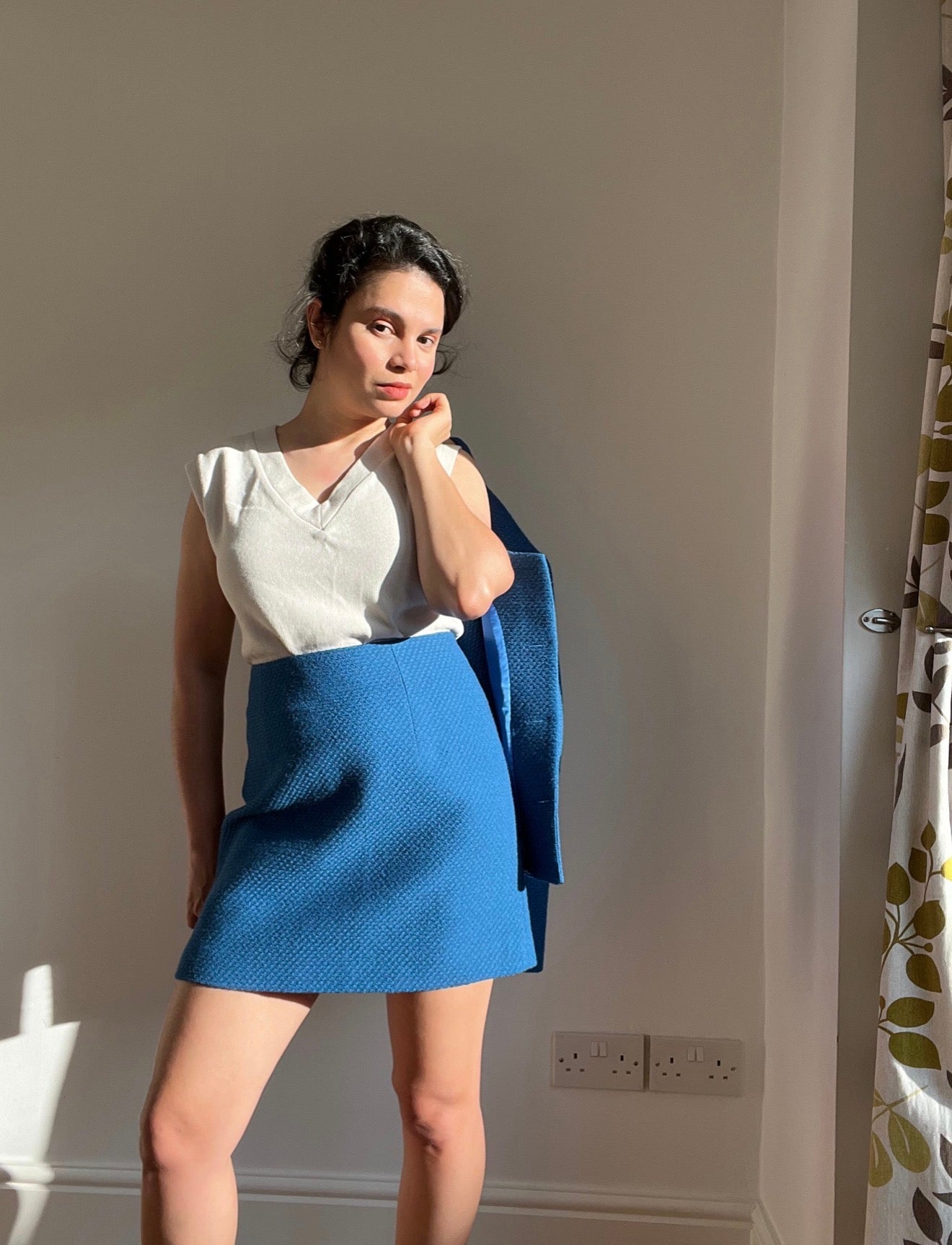 Dulce is a high-waisted mini skirt with a slight "A" line shape at the hem. It features two darts on the front and two on the back and in invisible zip on the centre back seam.
