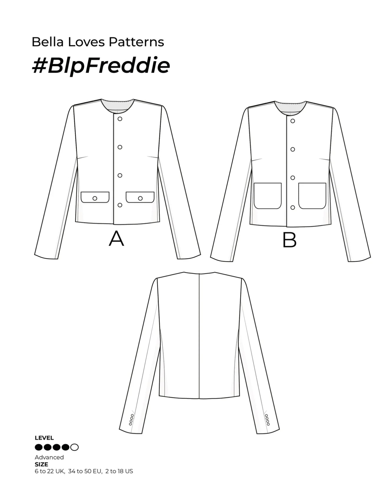 - Bella Loves Patterns Freddie jacket for sizes 6-22 (bust 80-112cm) printed A0 pattern sheets and printed coloured instructions.