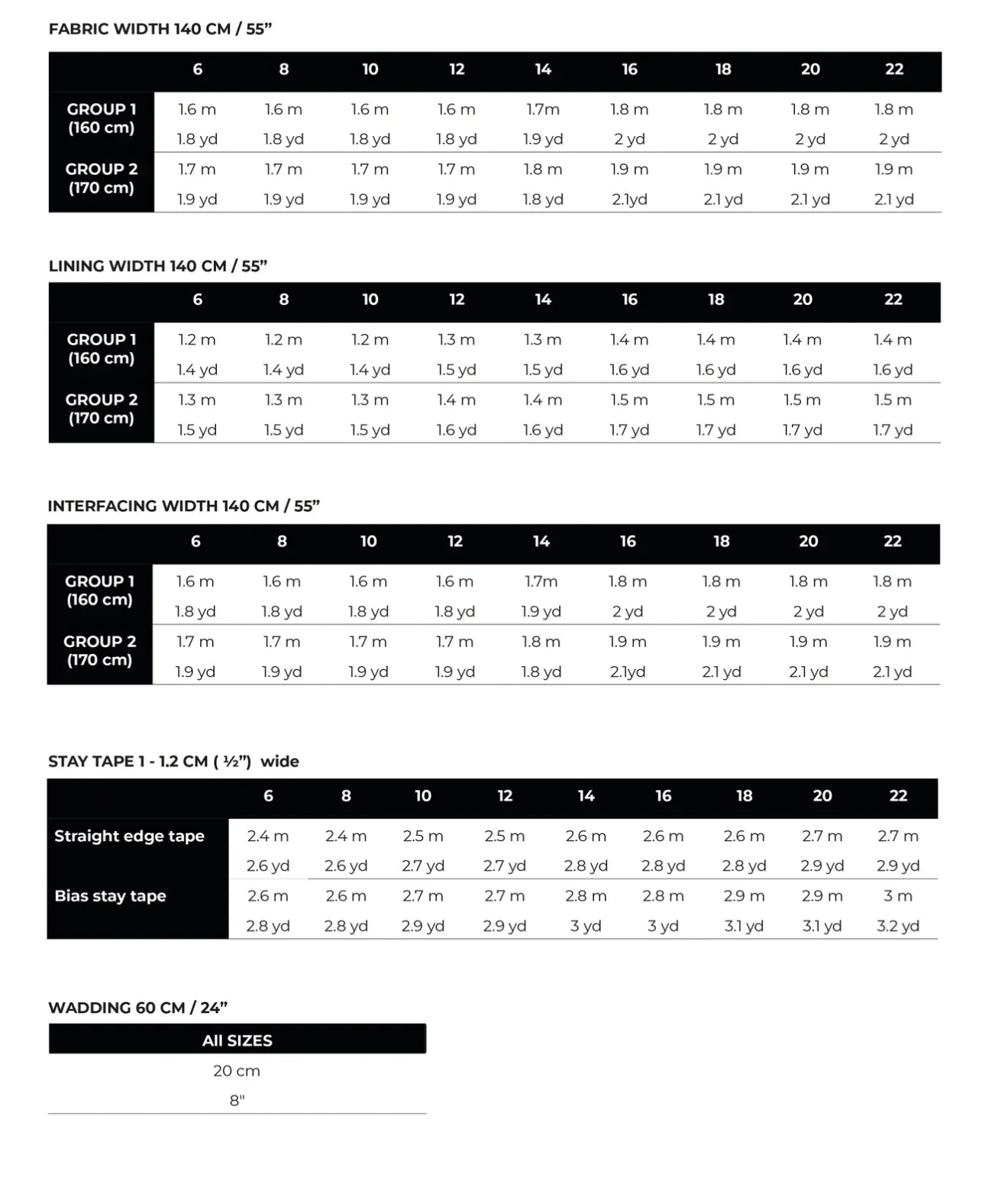 You have the option to either purchase a skirt kit with all supplies and notions required for it. Or both jacket and a skirt kits. Please note that the Jacket kit does not include chain weight, wadding and shoulder pads. You will receive all other sewing notions from us but you will need to source your own optional chain weight and shoulder pads.